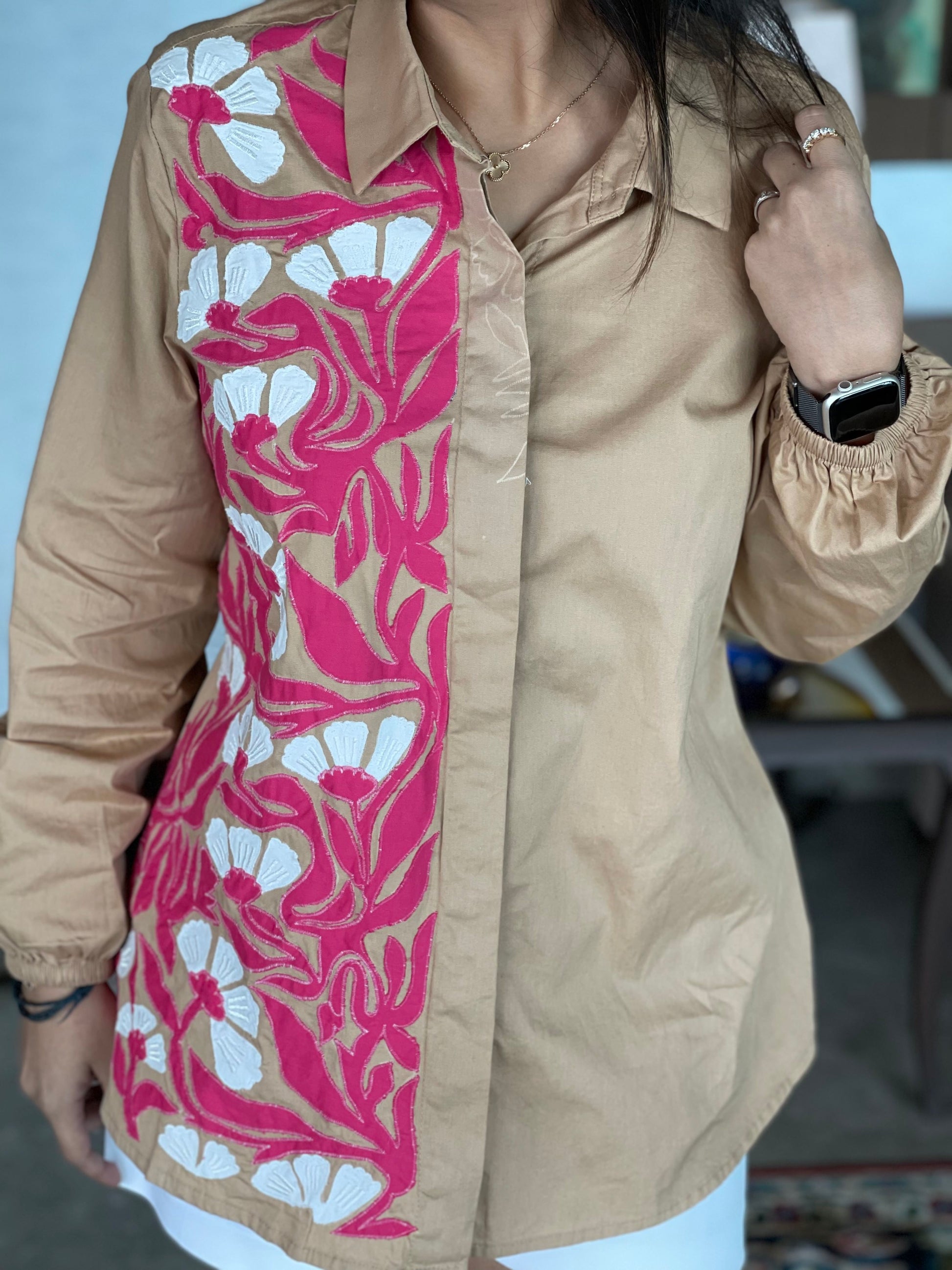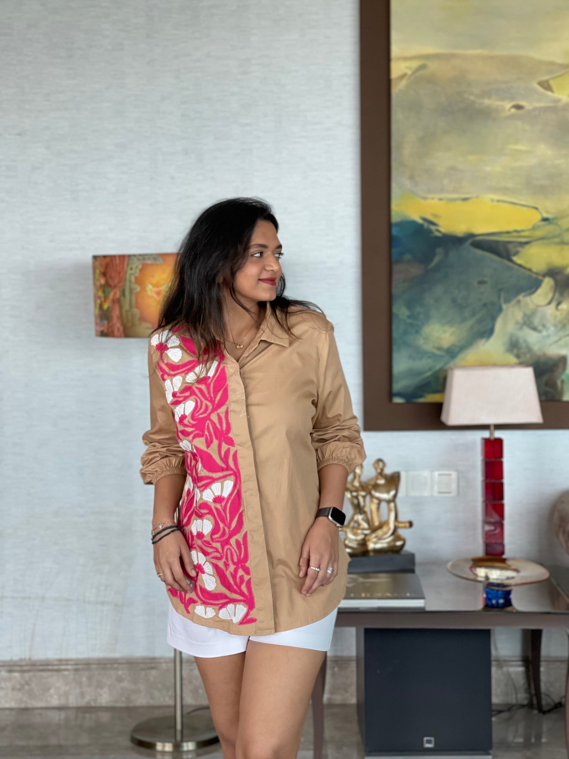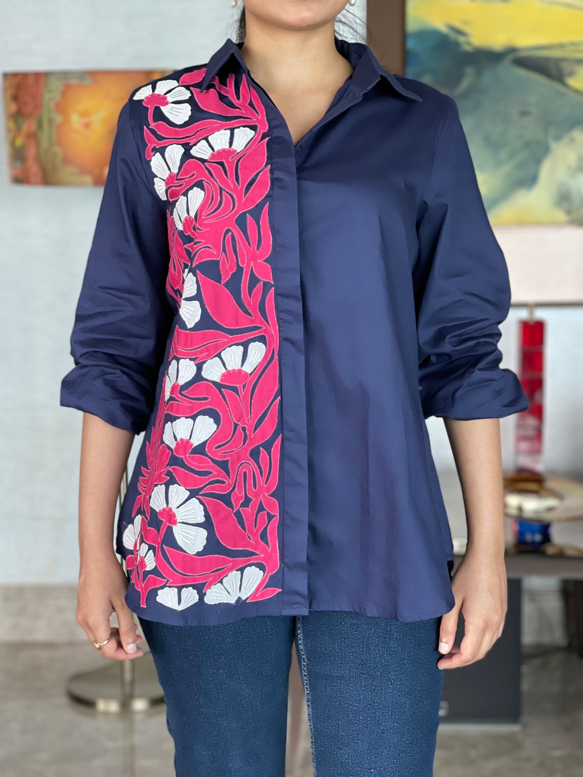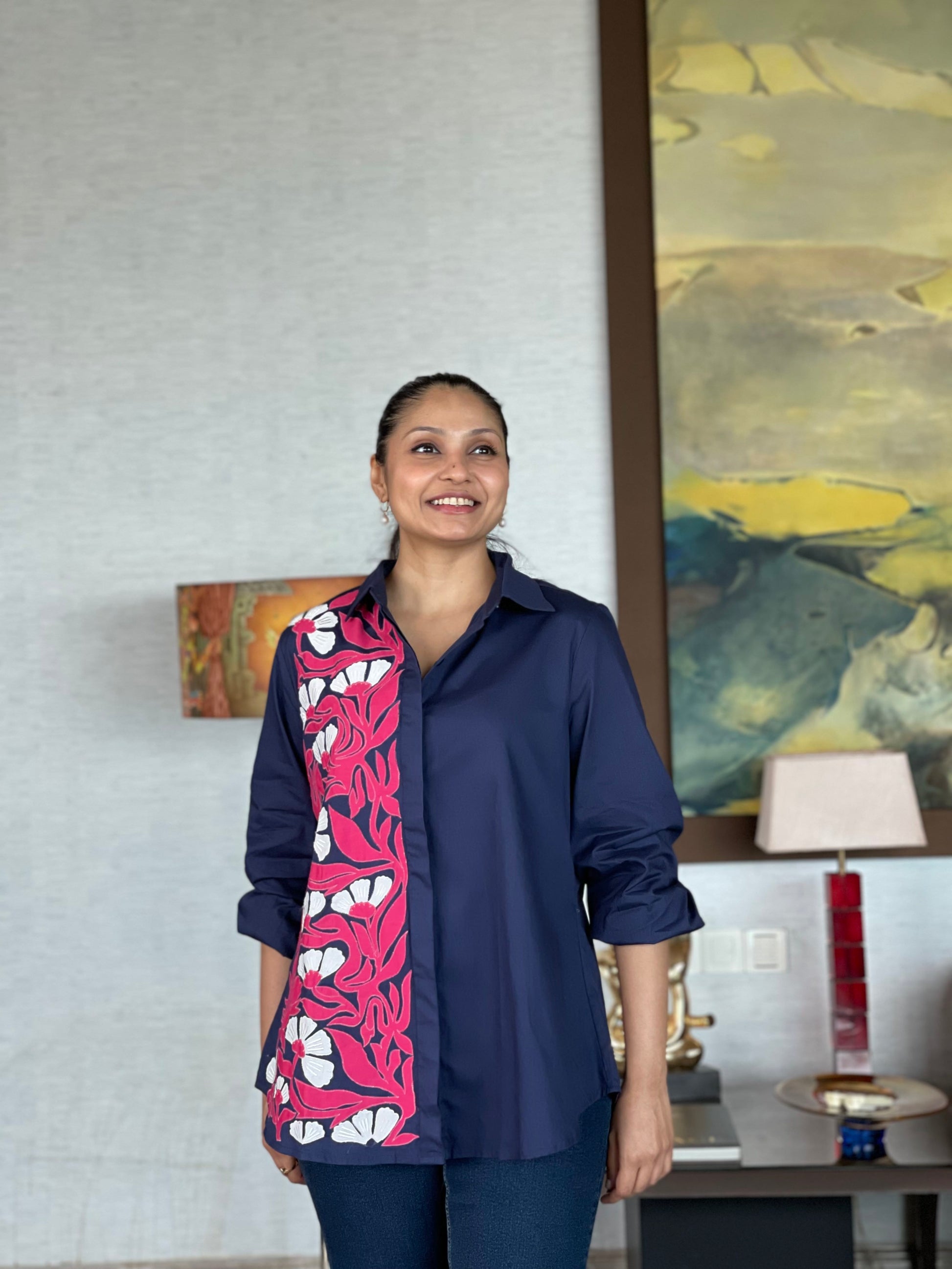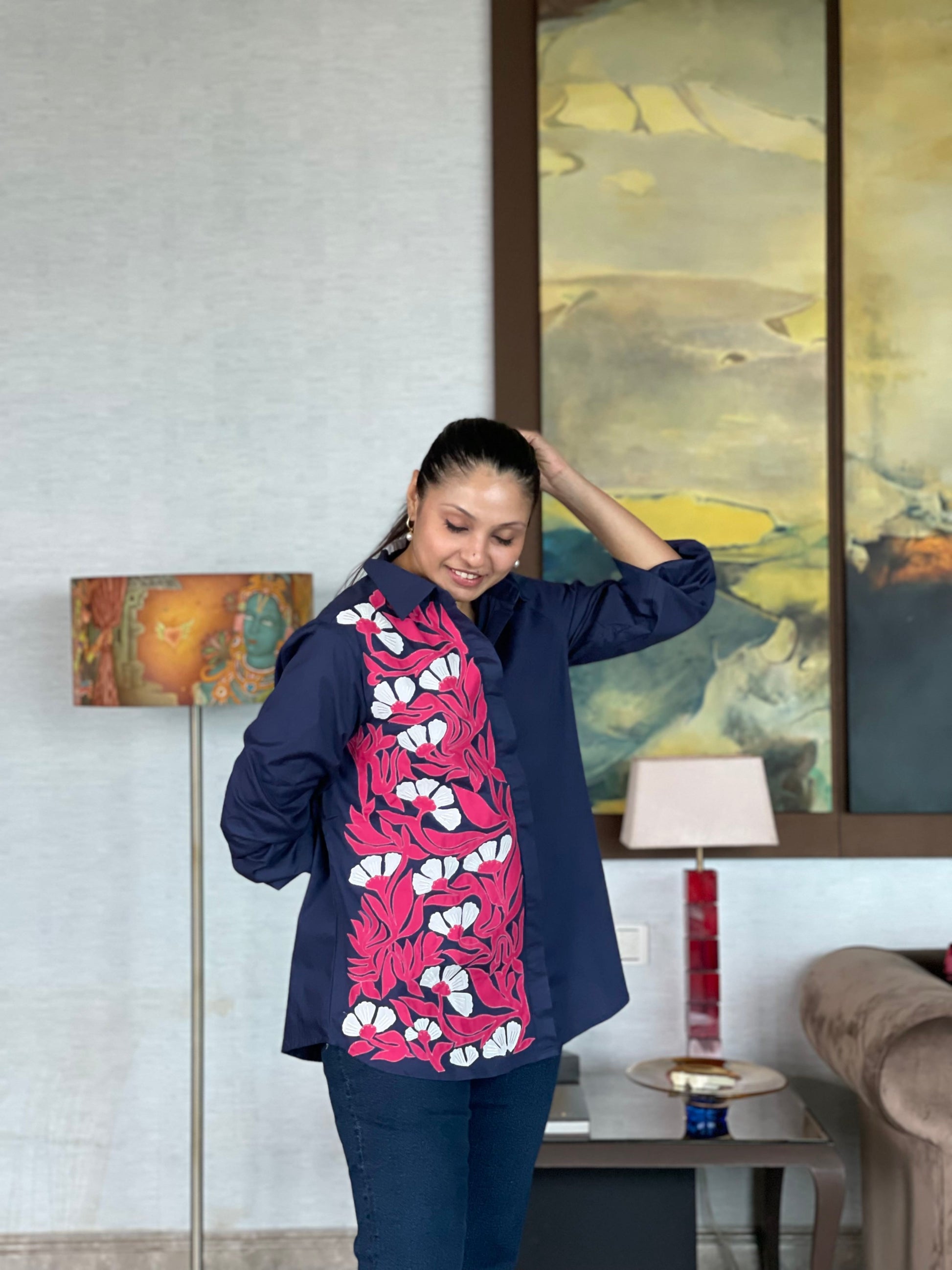 This stylish white shirt features a vibrant floral design on the front, adding a touch of elegance and sophistication. The bold pink and blue flowers create a striking contrast against the crisp white background, making it perfect for those who want to make a statement.