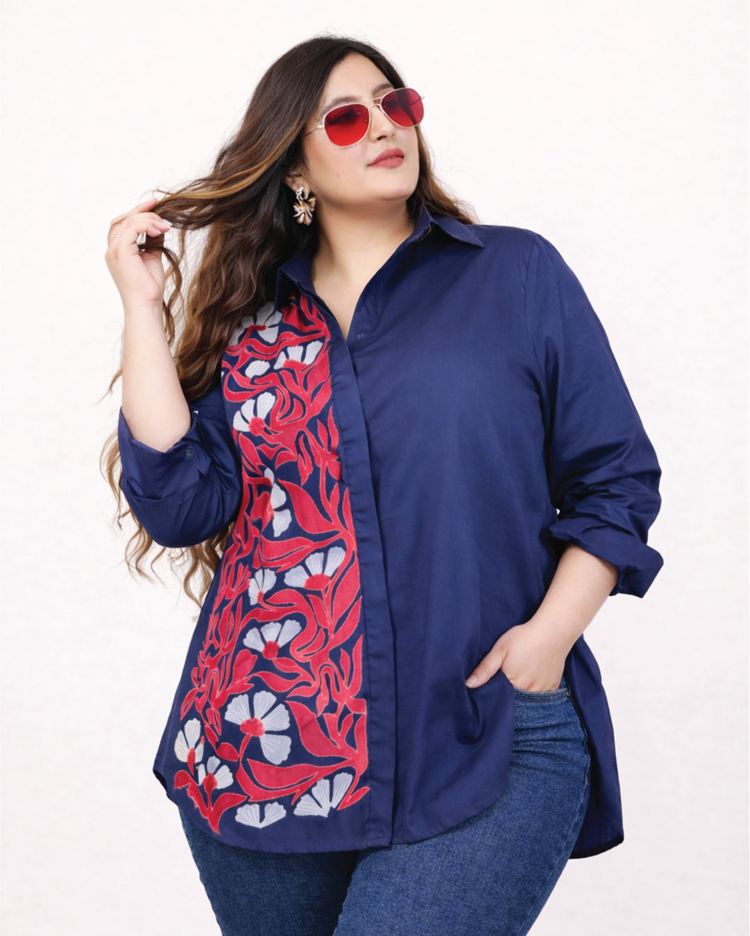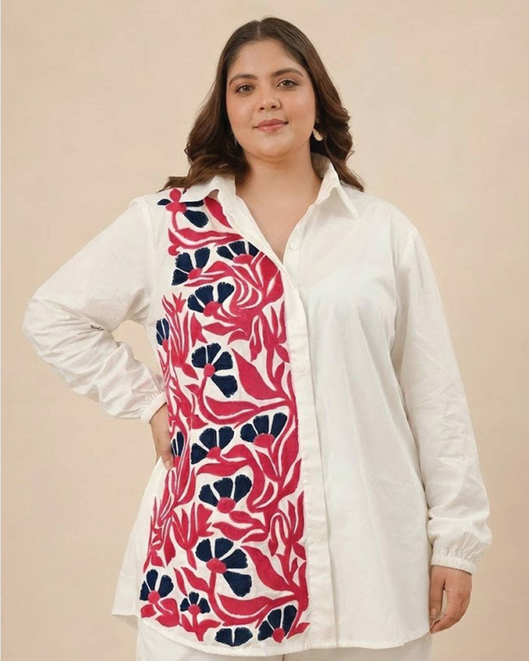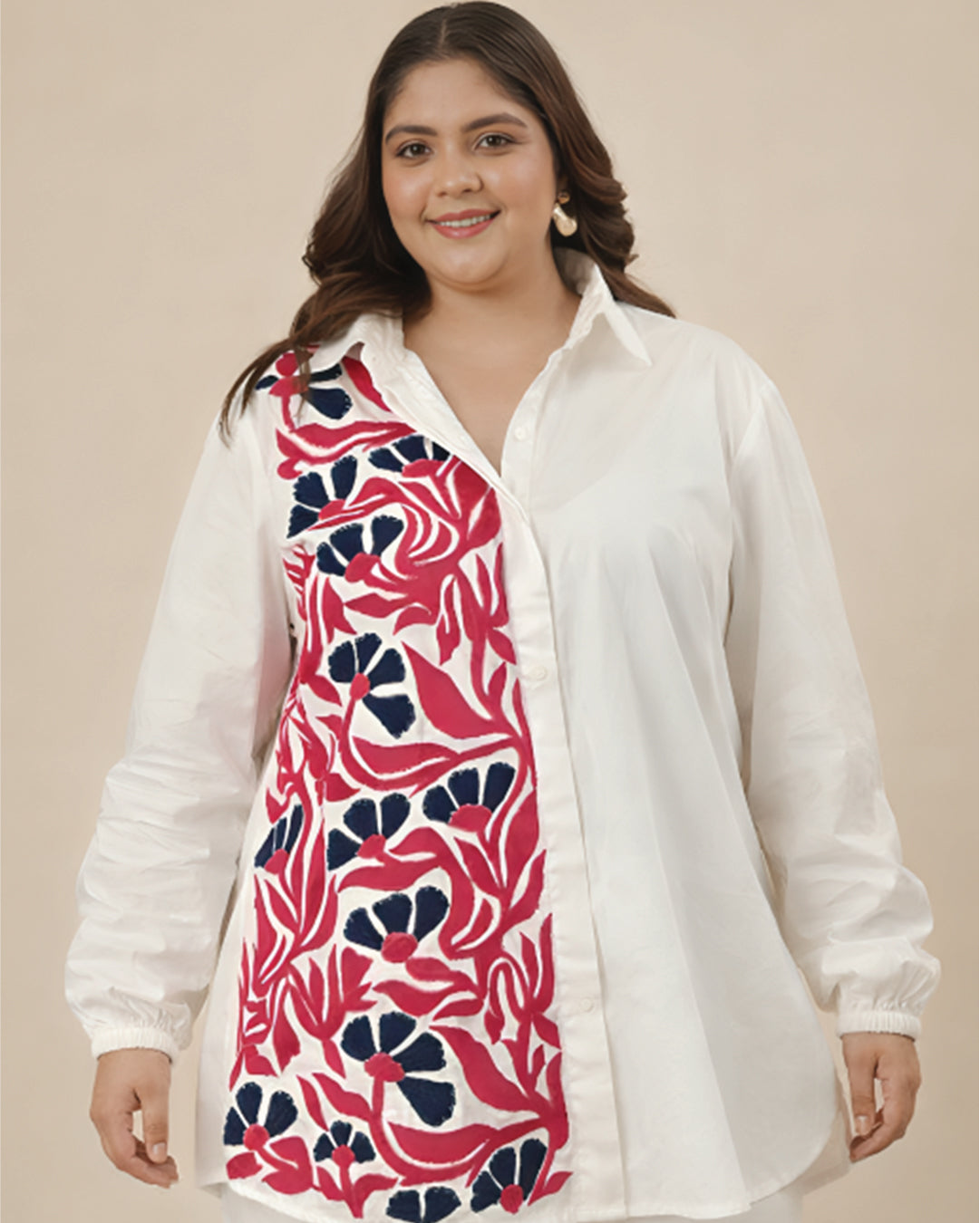 This stylish white shirt features a vibrant floral design on the front, adding a touch of elegance and sophistication. The bold pink and blue flowers create a striking contrast against the crisp white background, making it perfect for those who want to make a statement.