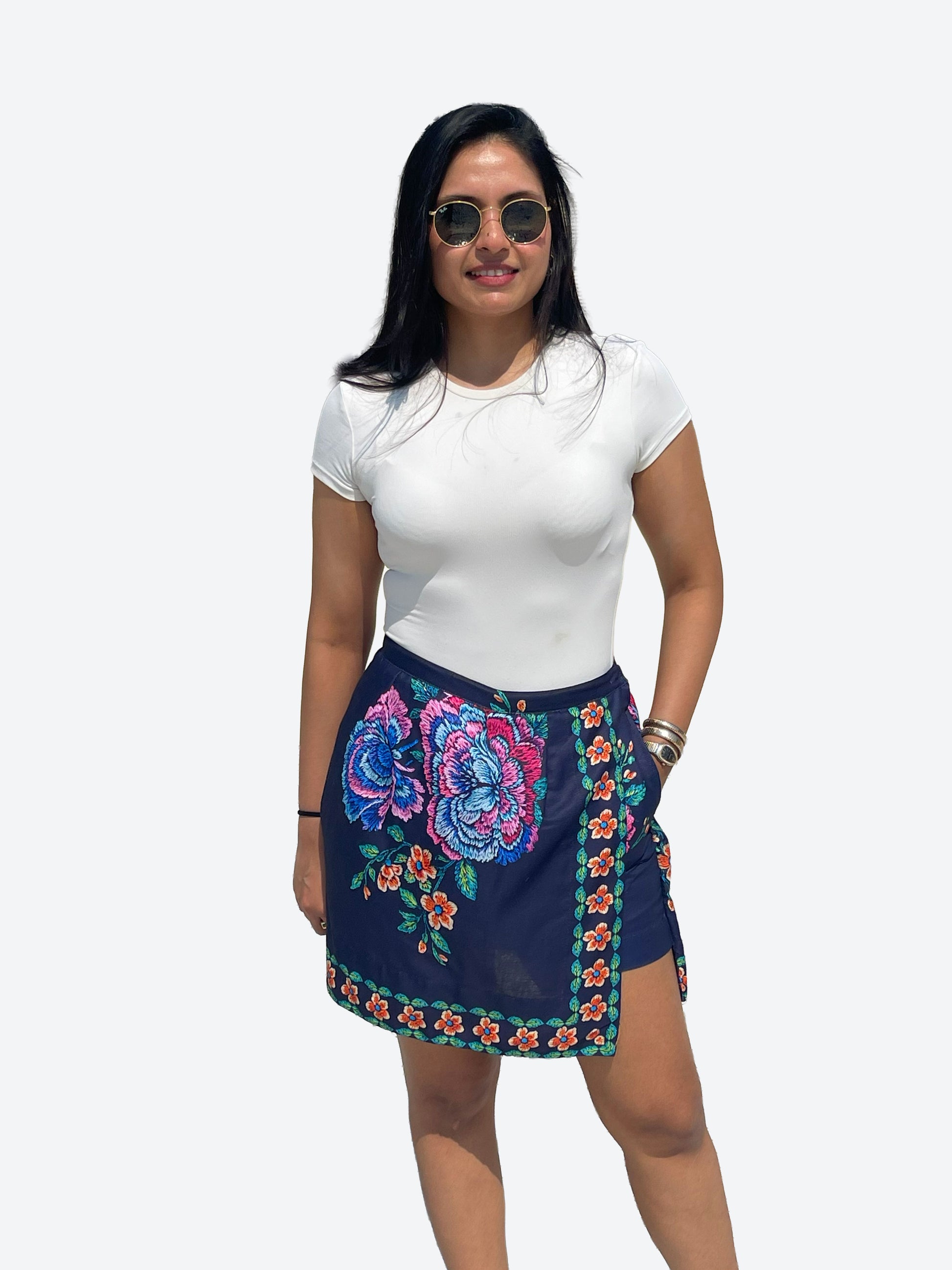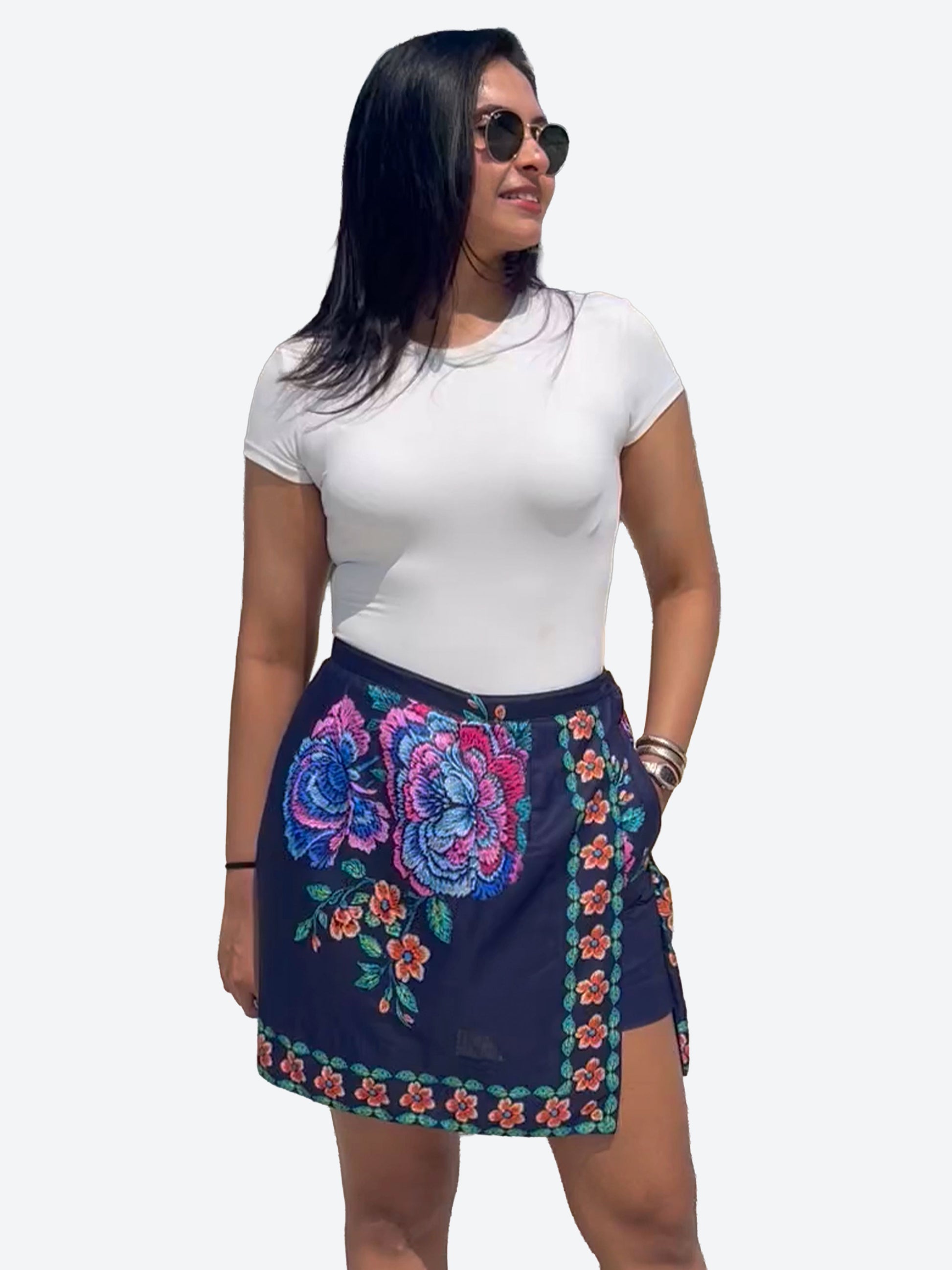 features a rich black base adorned with vibrant floral motifs that add a touch of drama and elegance. Designed with a flattering wrap-style front and built-in shorts underneath, it offers the perfect balance of style and comfort. Lightweight and breathable, this skort moves beautifully while keeping you at ease all day.