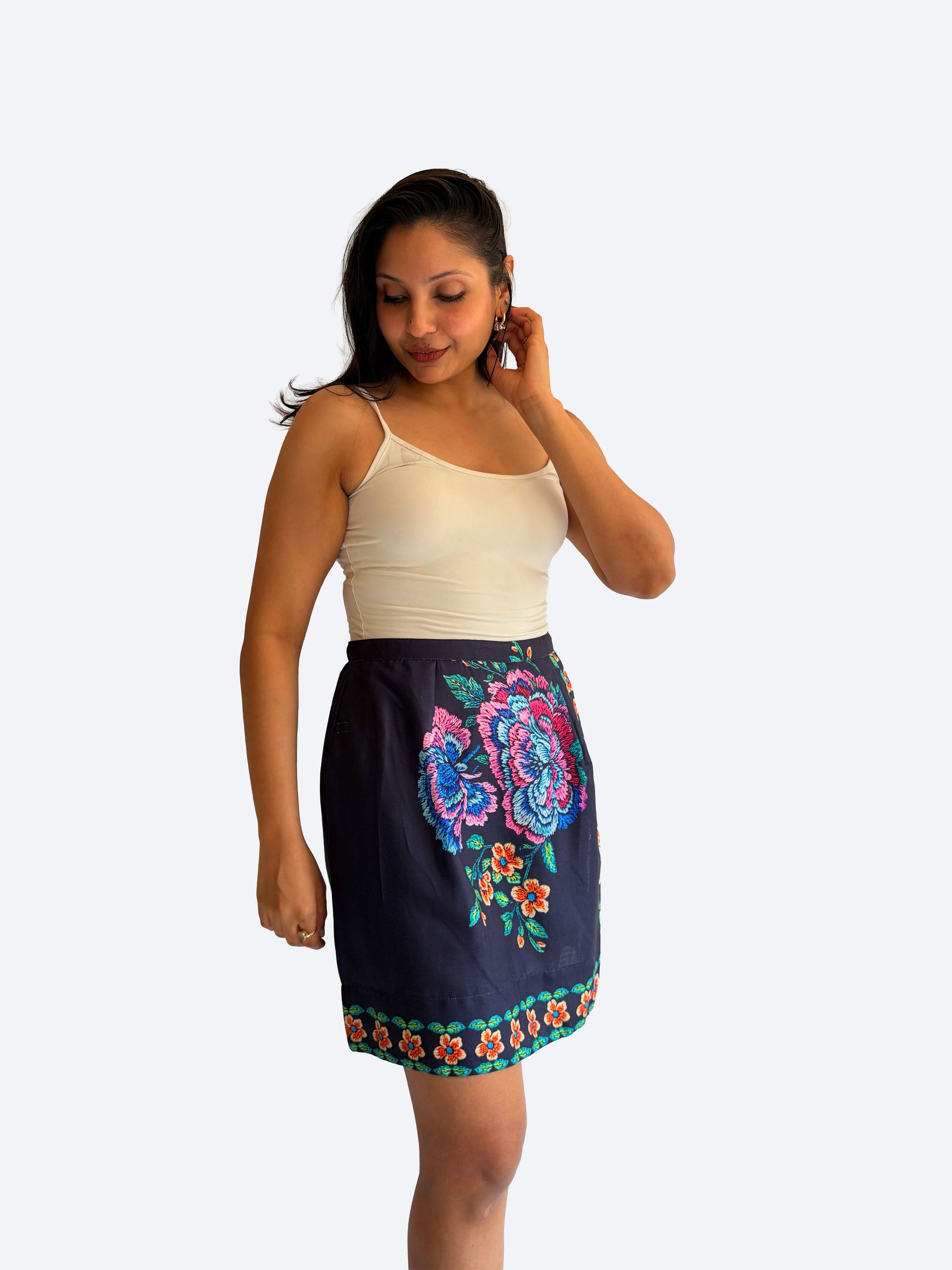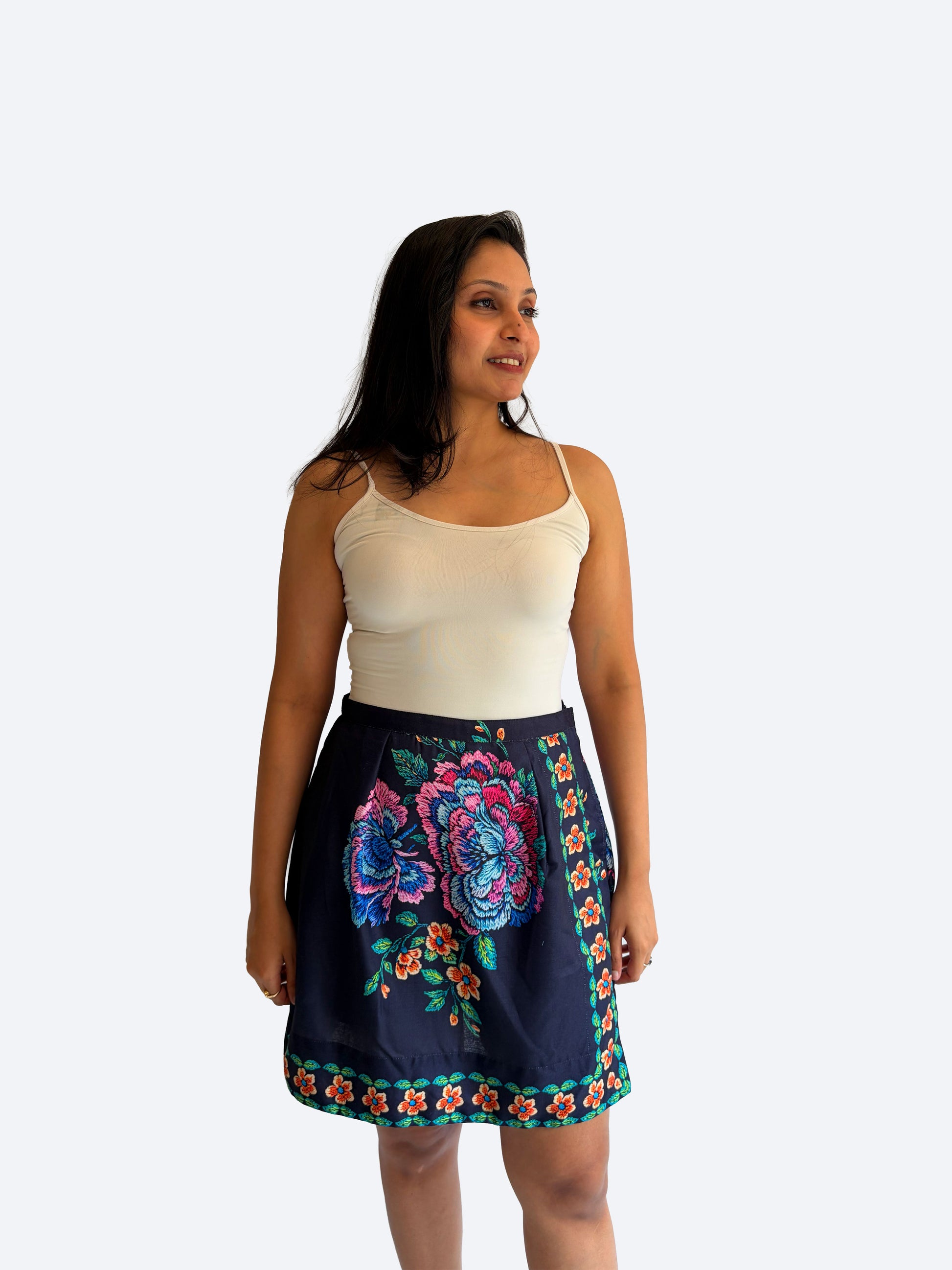 Pair with a fitted tank or camisole in white, beige, or a colour picked from the florals