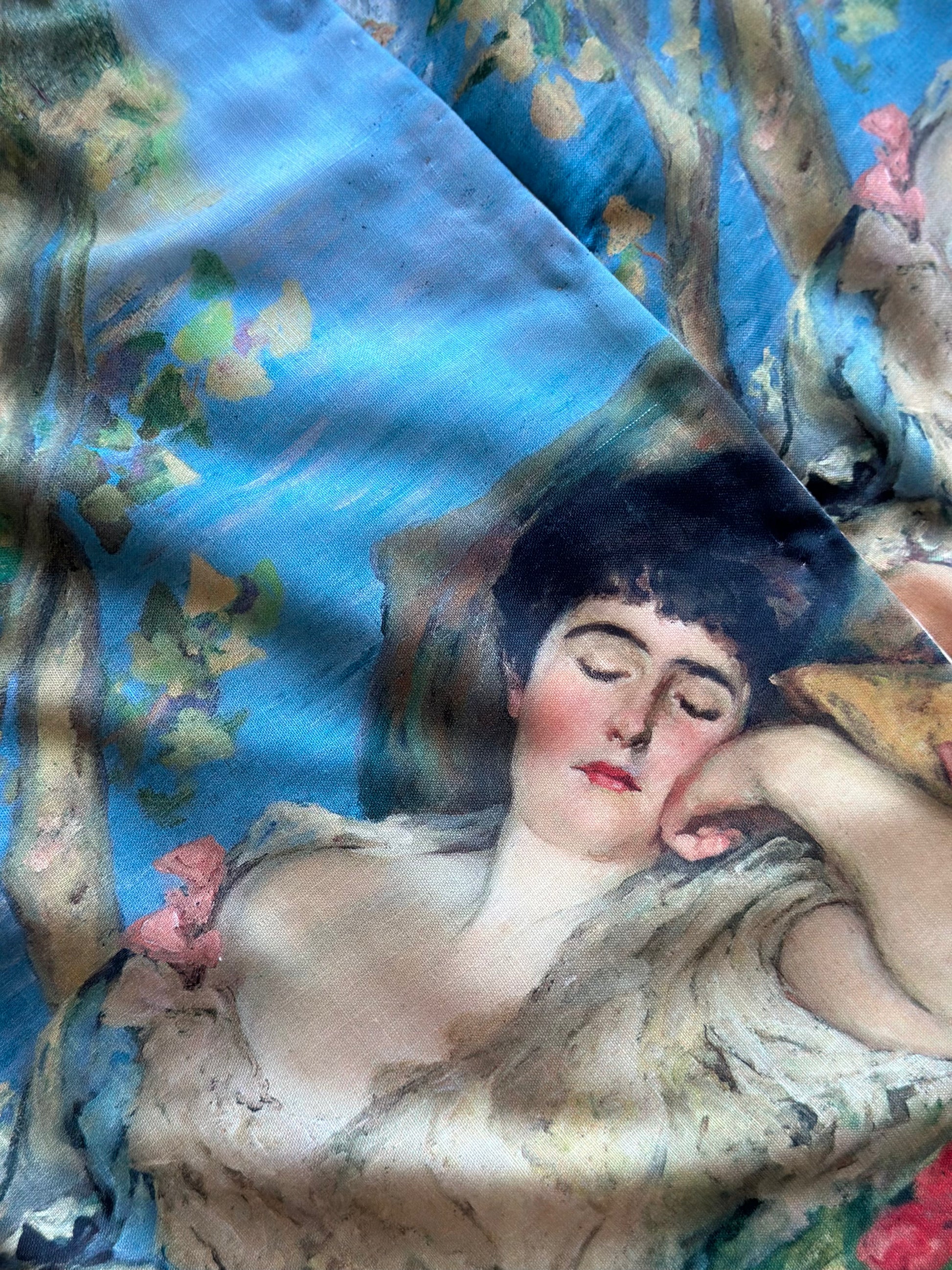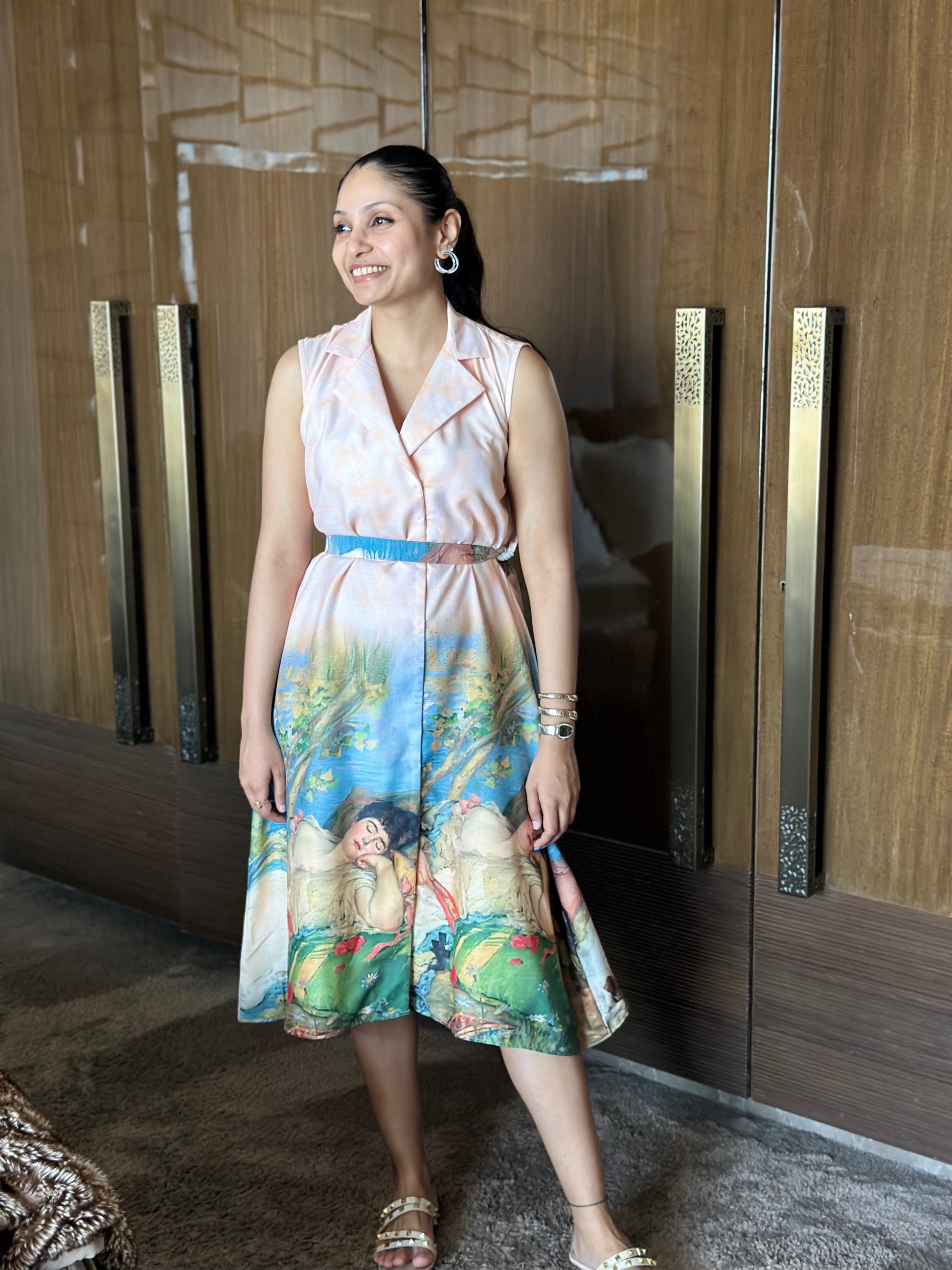 dress is its exquisite artistic print on the flared midi skirt, depicting a serene and dreamy painting of a reclining woman in a lush garden. The cinched waist with a coordinating belt enhances the silhouette, making it both flattering and graceful.