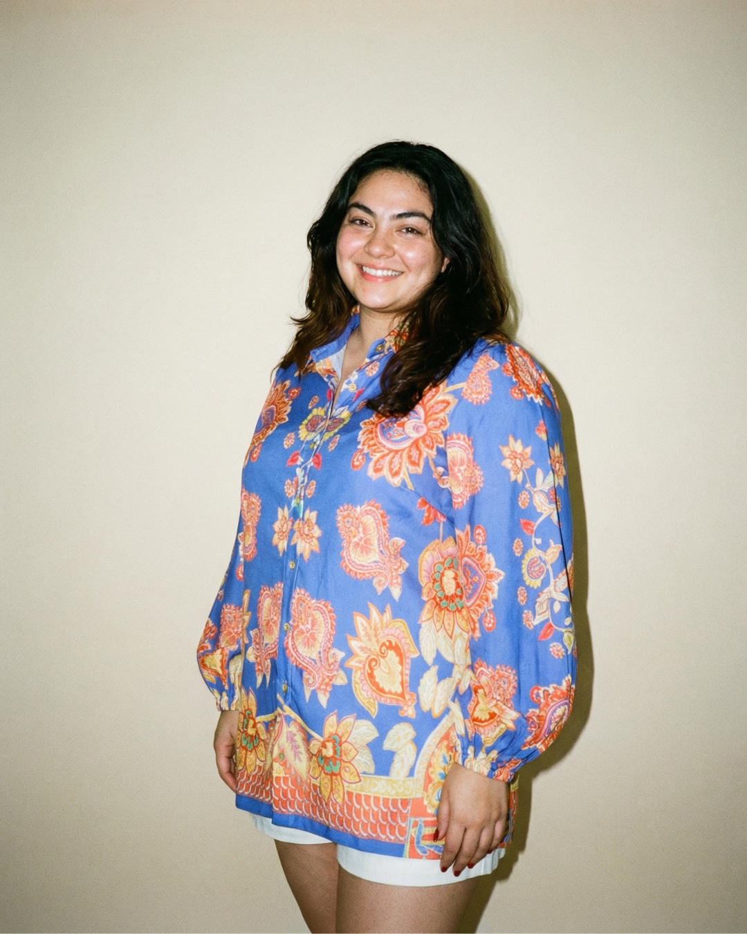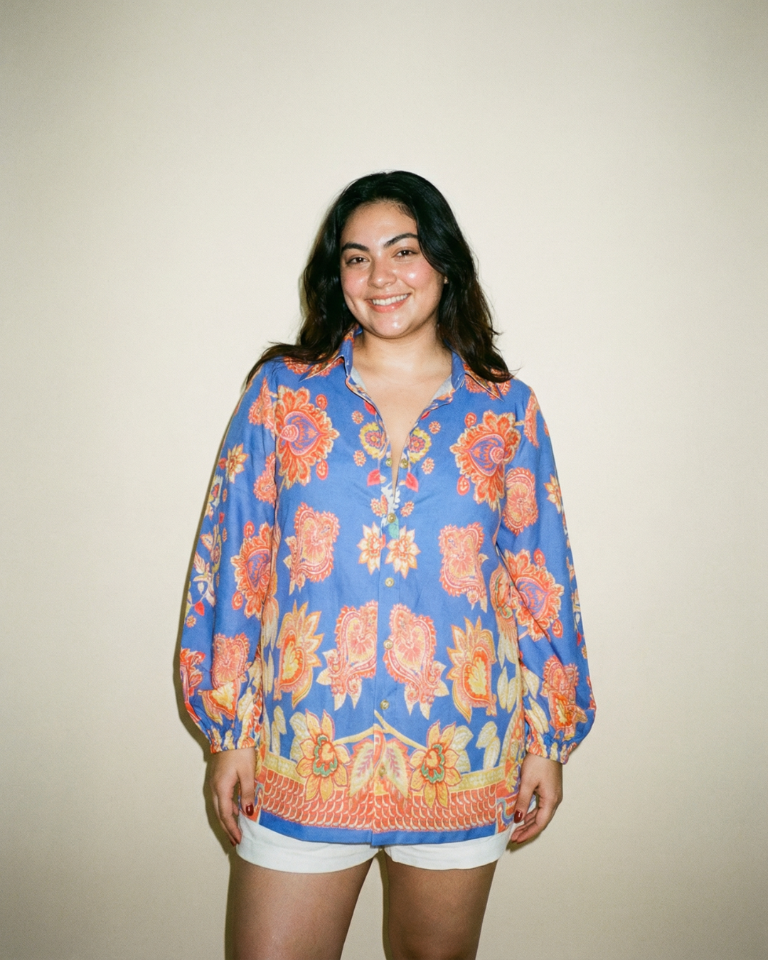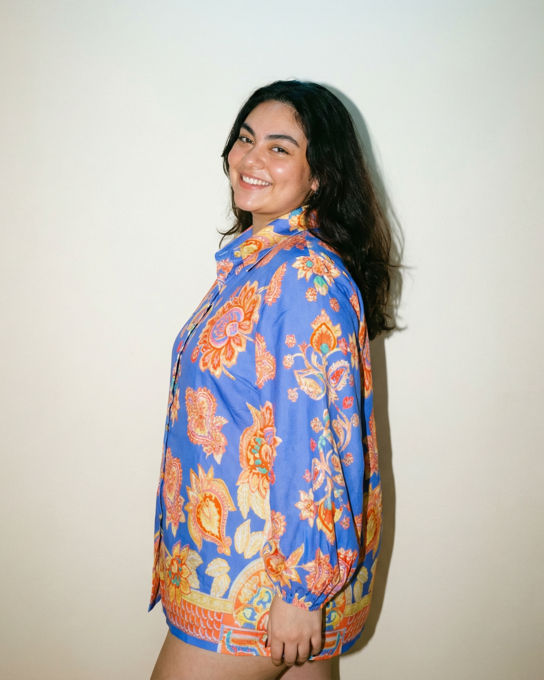This vibrant blue shirt features an intricate floral pattern with orange and yellow hues, creating a stunning visual effect. The long sleeves and collar add a touch of sophistication, making it perfect for various occasions.