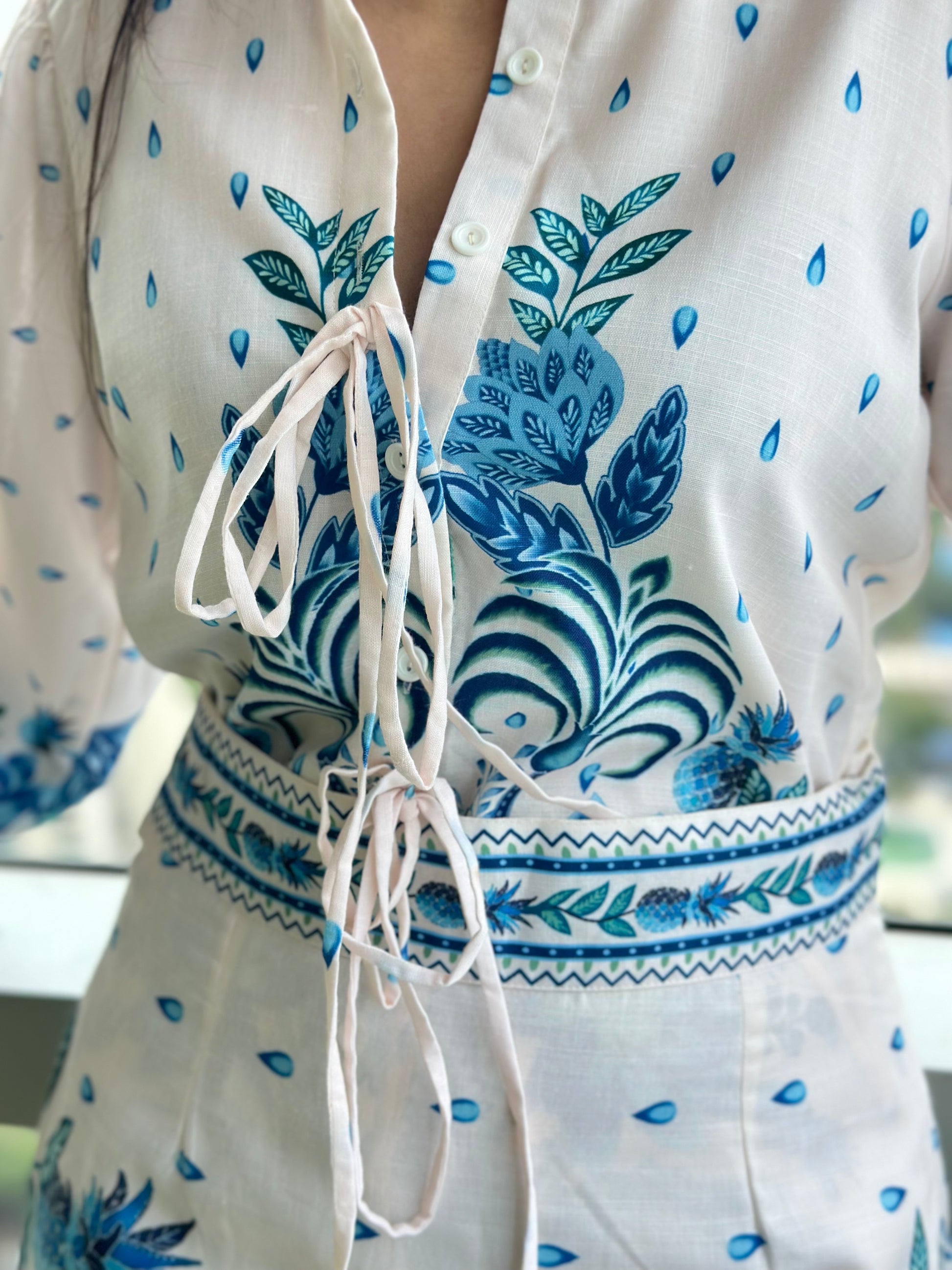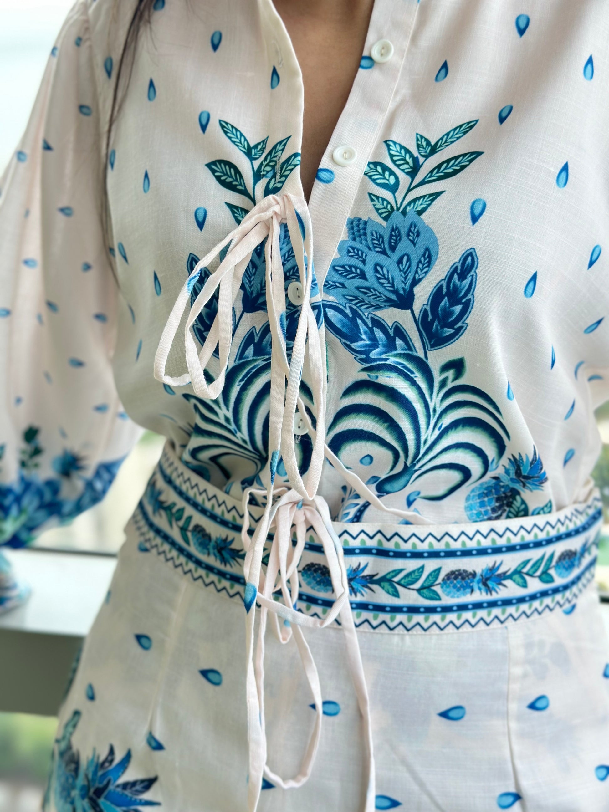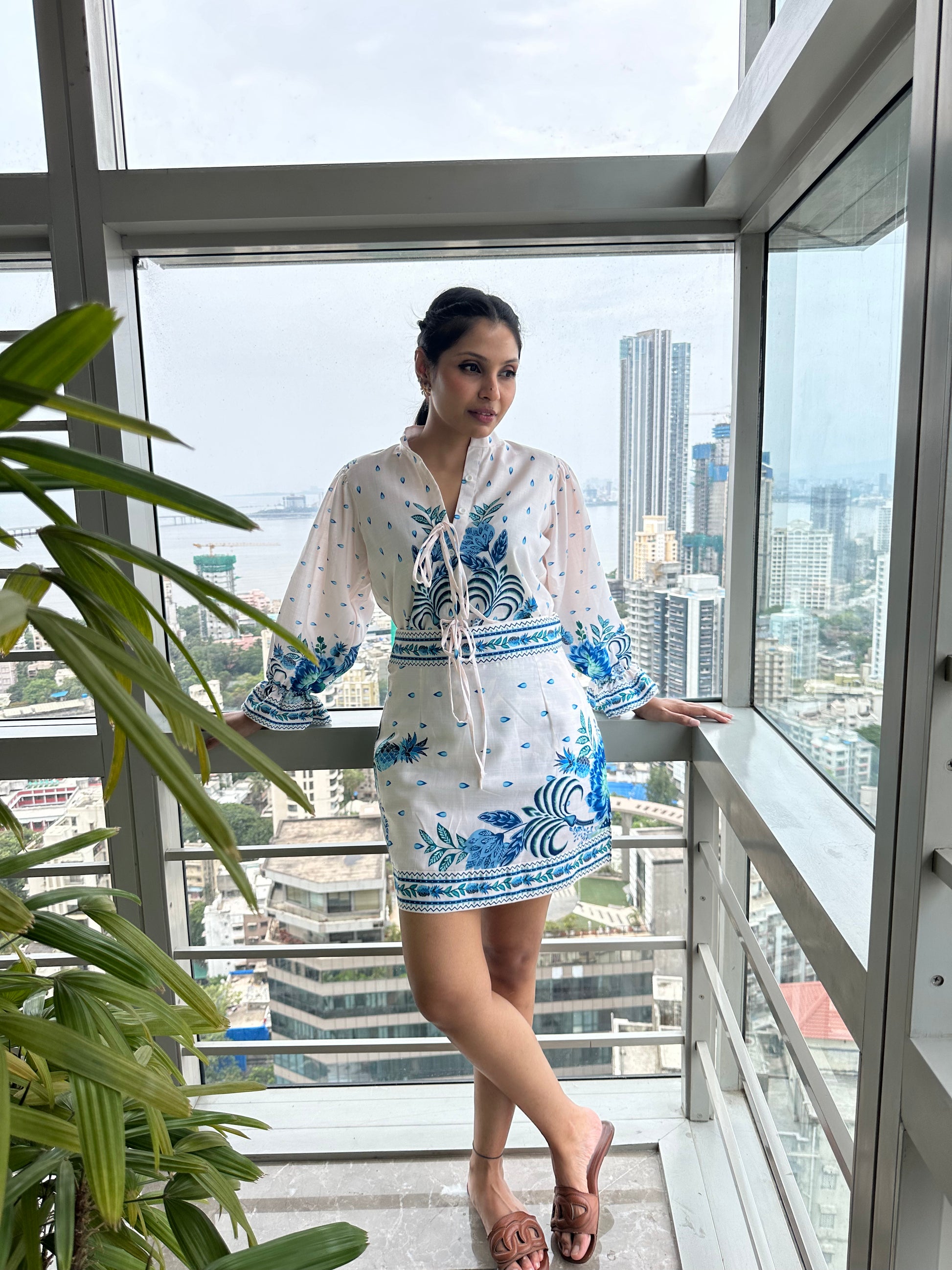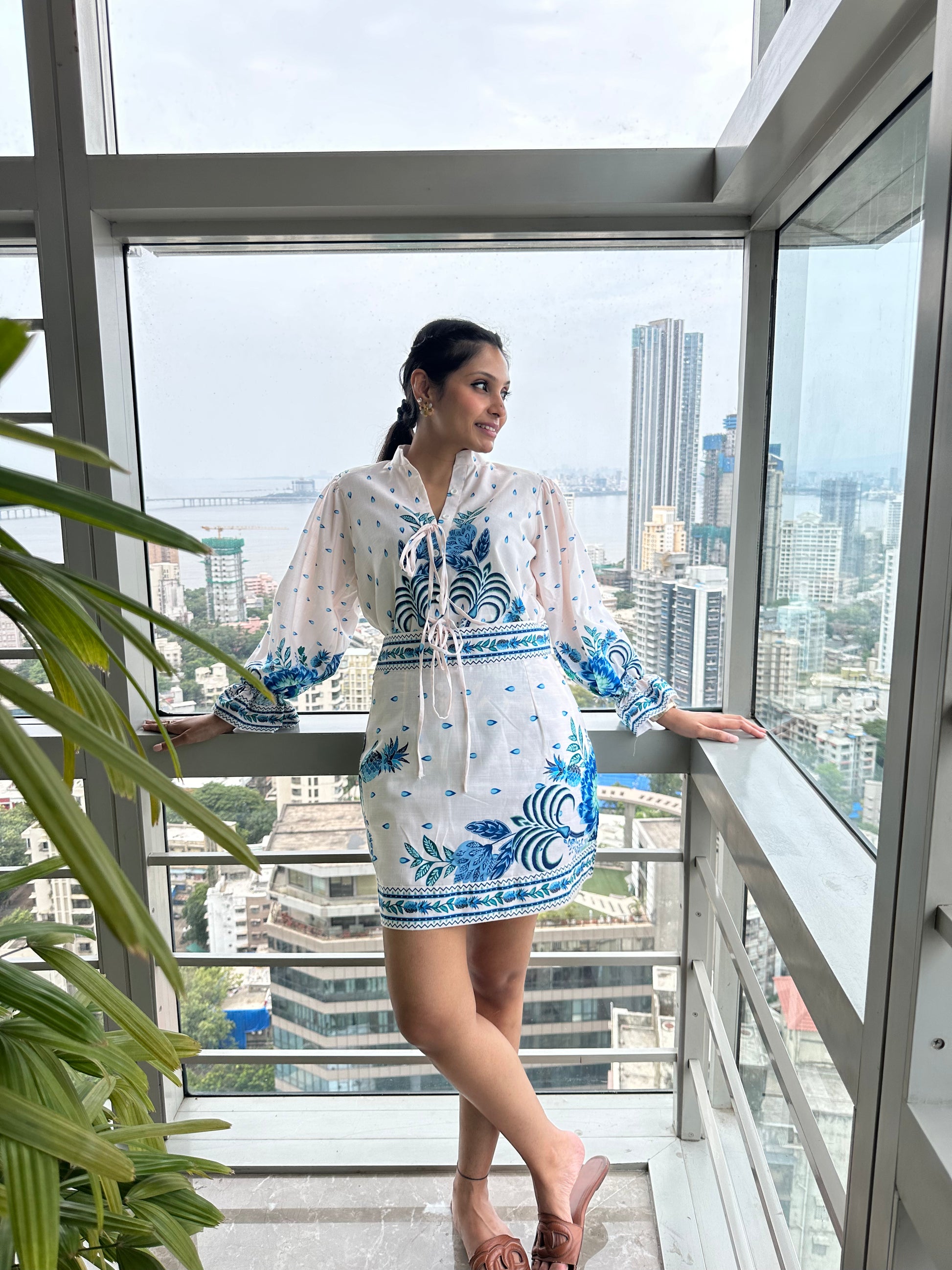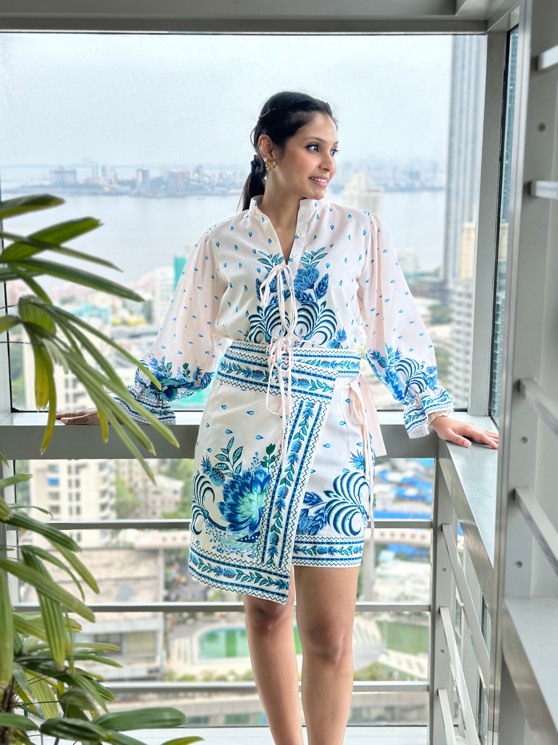 The Blue Oasis wraparound skirt set is a stunning blend of elegance and casual charm. Designed in a crisp white fabric with intricate blue prints, this dress features a cinched waist with a delicate drawstring, a V-neckline, and breezy long sleeves with elastic cuffs. The lightweight material and flowy silhouette make it a comfortable yet stylish choice for warm-weather outings.