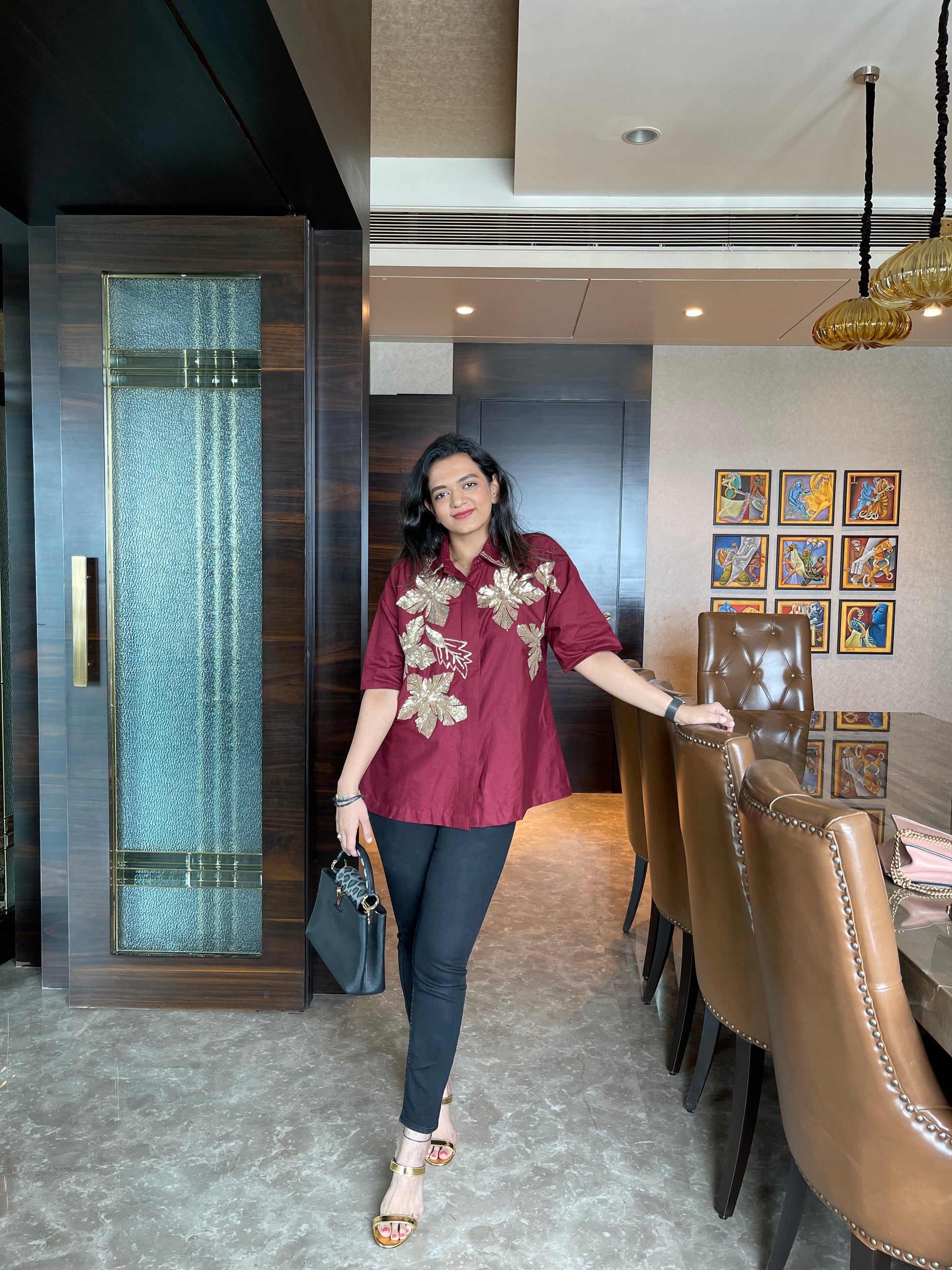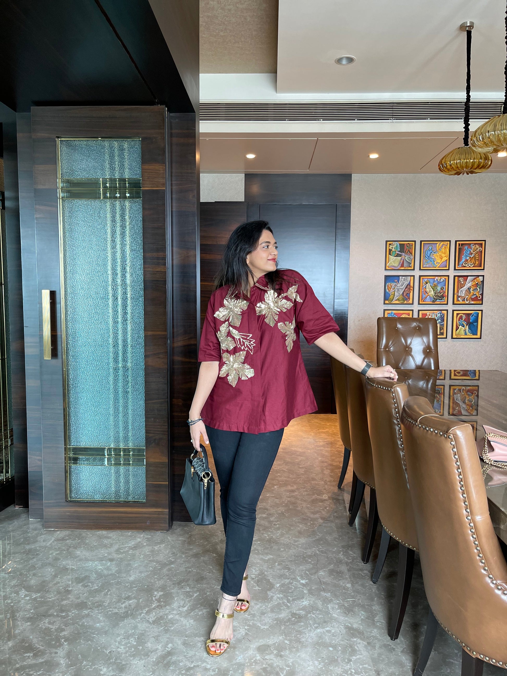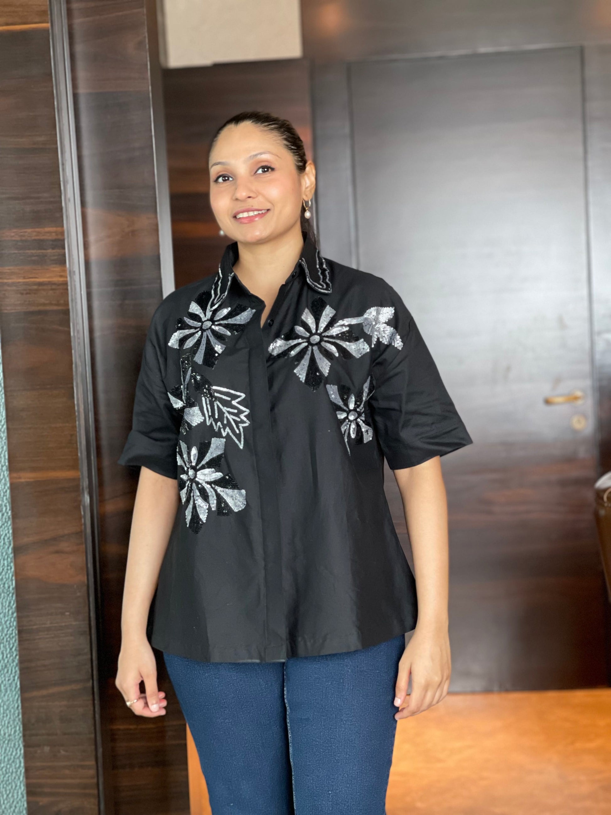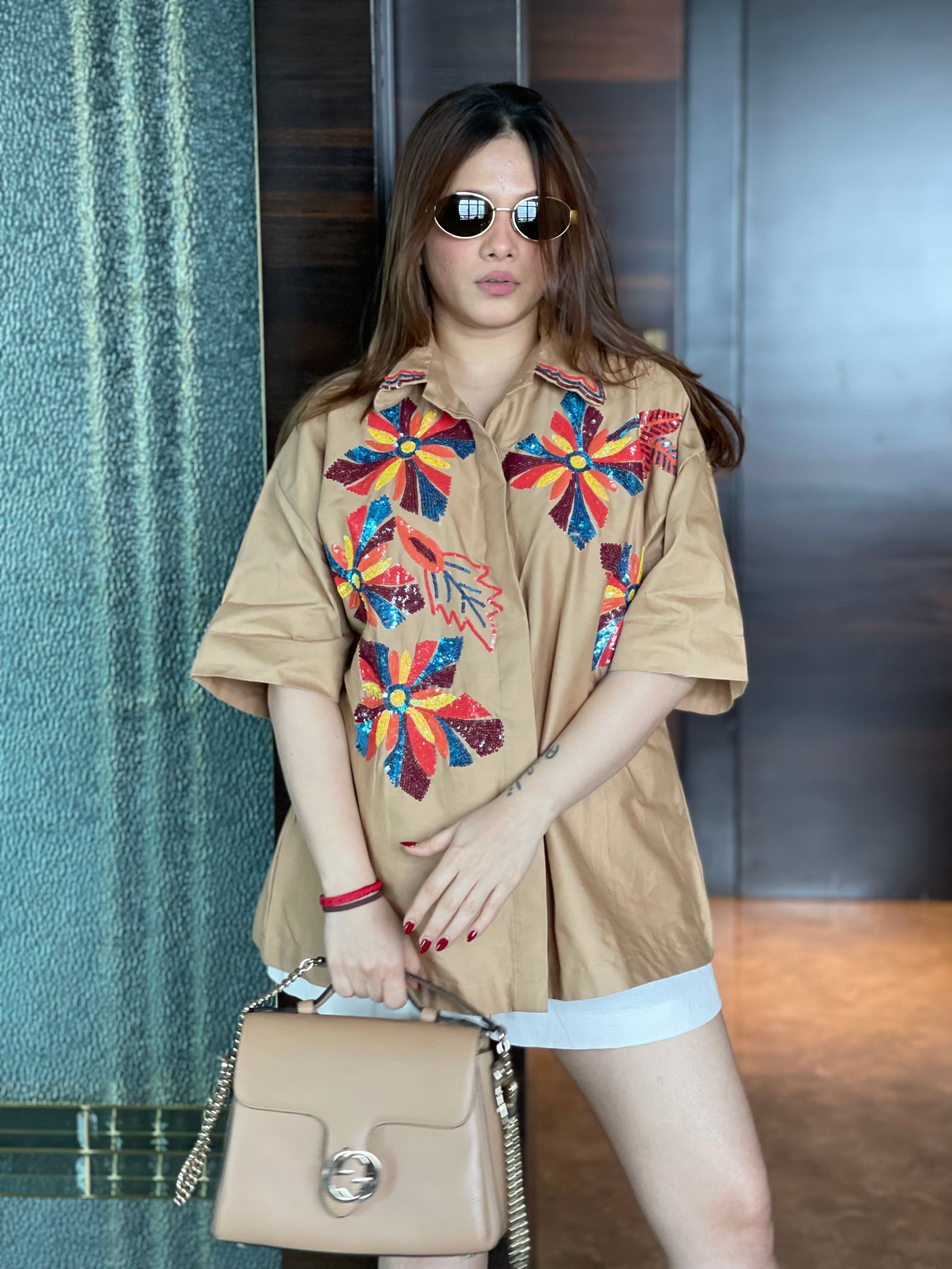 Elevate your wardrobe with the Boho Bloom Oversized hand Embroidered Shirt, a stunning fusion of earthy tones and vibrant artistry. Crafted from breathable cotton fabric in a warm beige hue, this oversized shirt features eye-catching floral embroidery in vivid red, yellow, blue, and maroon sequins. The half-sleeve design and relaxed silhouette offer effortless comfort, while the concealed button-down front ensures a polished finish.