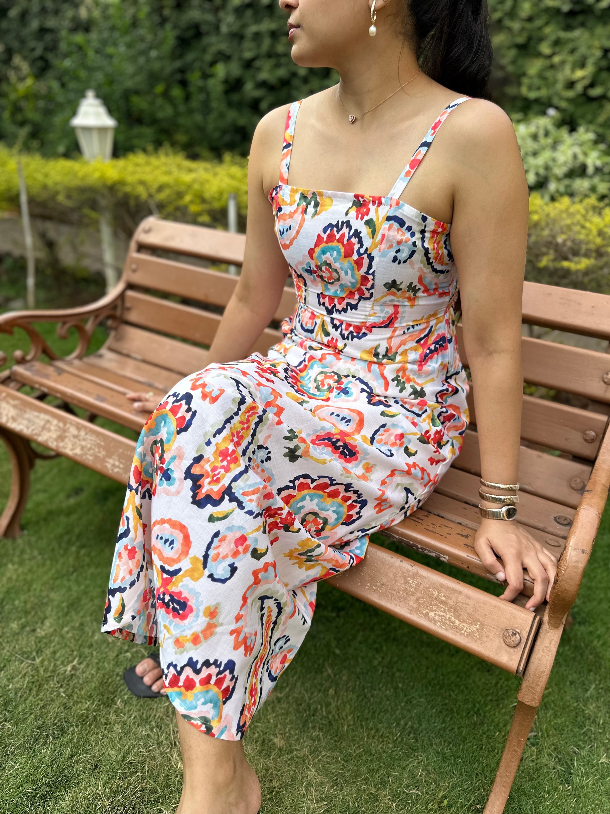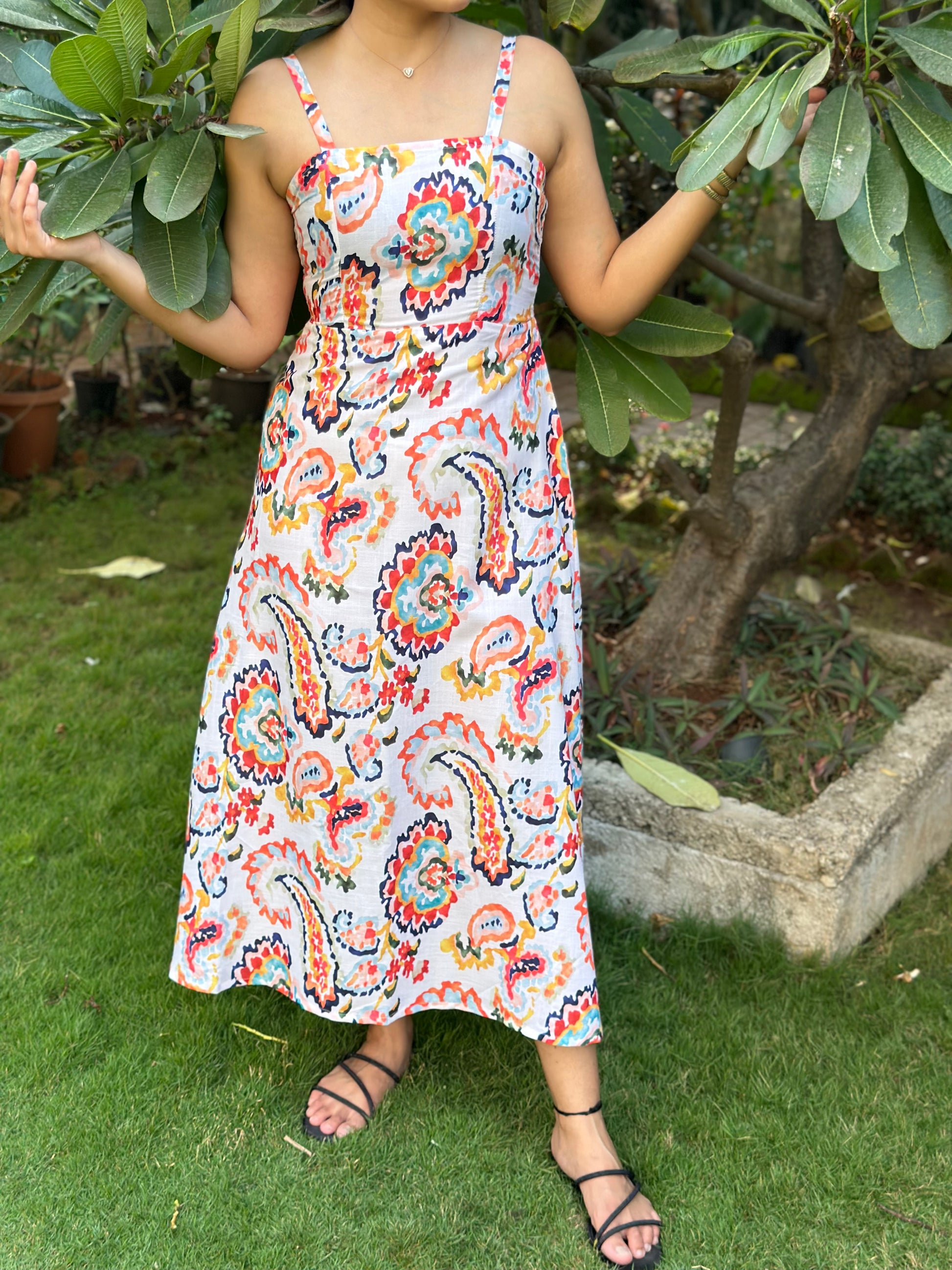The Boho Paisley Midi Dress is a lightweight and effortlessly chic piece featuring a vibrant multicolored paisley print on a soft, flowy fabric. Designed with delicate spaghetti straps and a fitted bodice, the dress gracefully flares into an asymmetrical midi length hem, adding movement and elegance. This dress perfectly embodies a bohemian yet sophisticated vibe, making it a go-to piece for various occasions.
