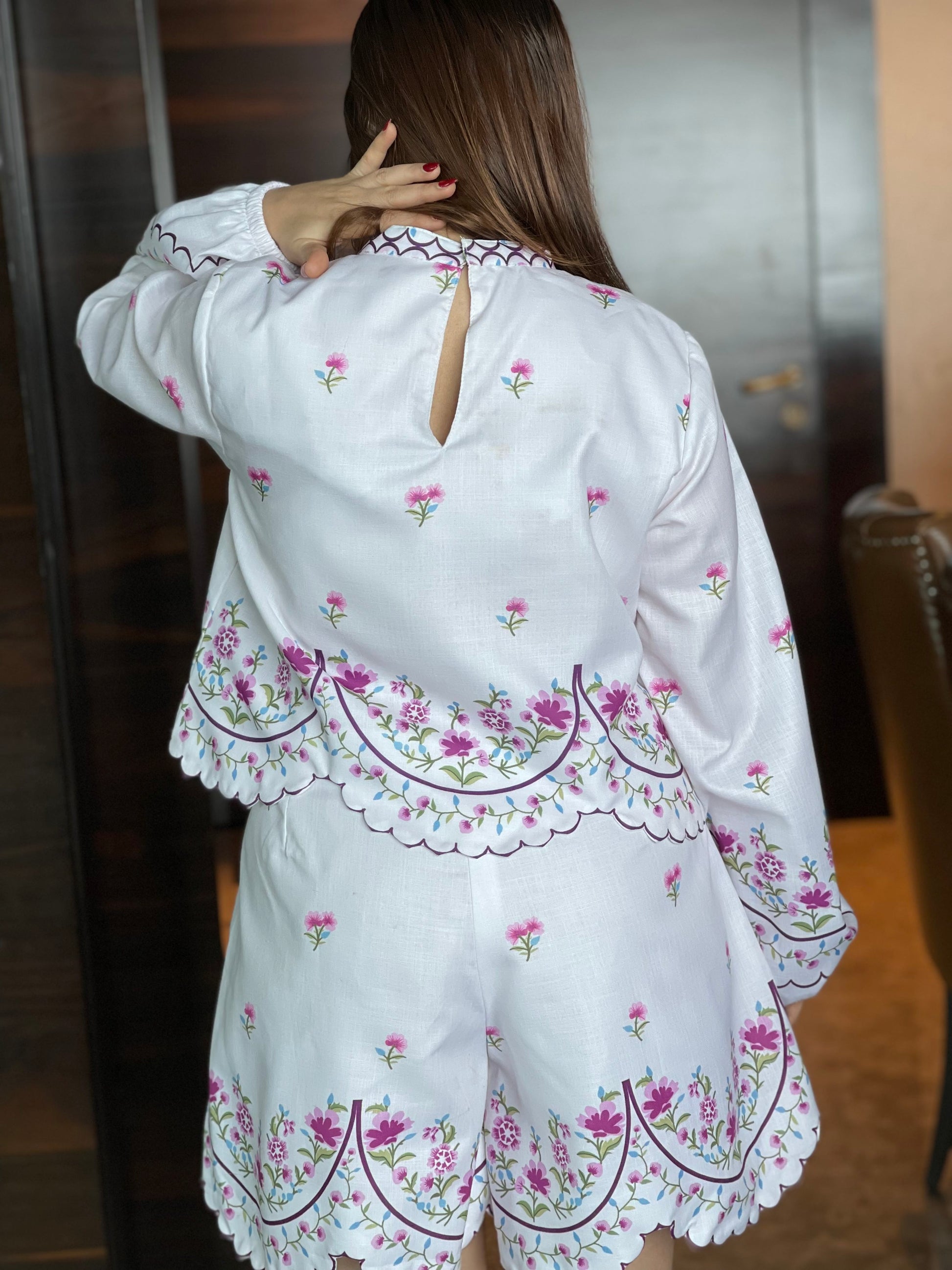 The Cherry blossom Co-ord Set is a breezy, effortlessly chic ensemble featuring a scalloped shirt with delicate floral details in shades of purple and pink. The matching relaxed-fit shorts add a stylish yet comfortable touch, making this set perfect for both casual and vacation wear. The balloon sleeves with elastic details enhance the feminine charm, creating an elegant yet playful silhouette.