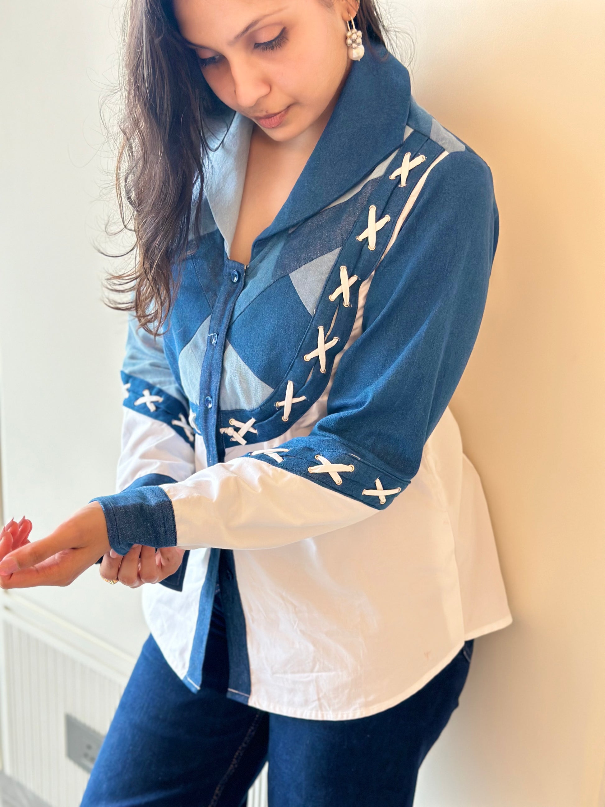 The Denim Corset Patchwork Shirt is a statement piece blending white cotton fabric with intricate denim patchwork and corset-style lace-up detailing. Featuring multiple shades of denim in a geometric pattern, this shirt adds a bold yet structured aesthetic to any outfit. The lace-up details along the front and sleeves create a unique, edgy, and modern appeal, making it a perfect fusion of classic and contemporary fashion.