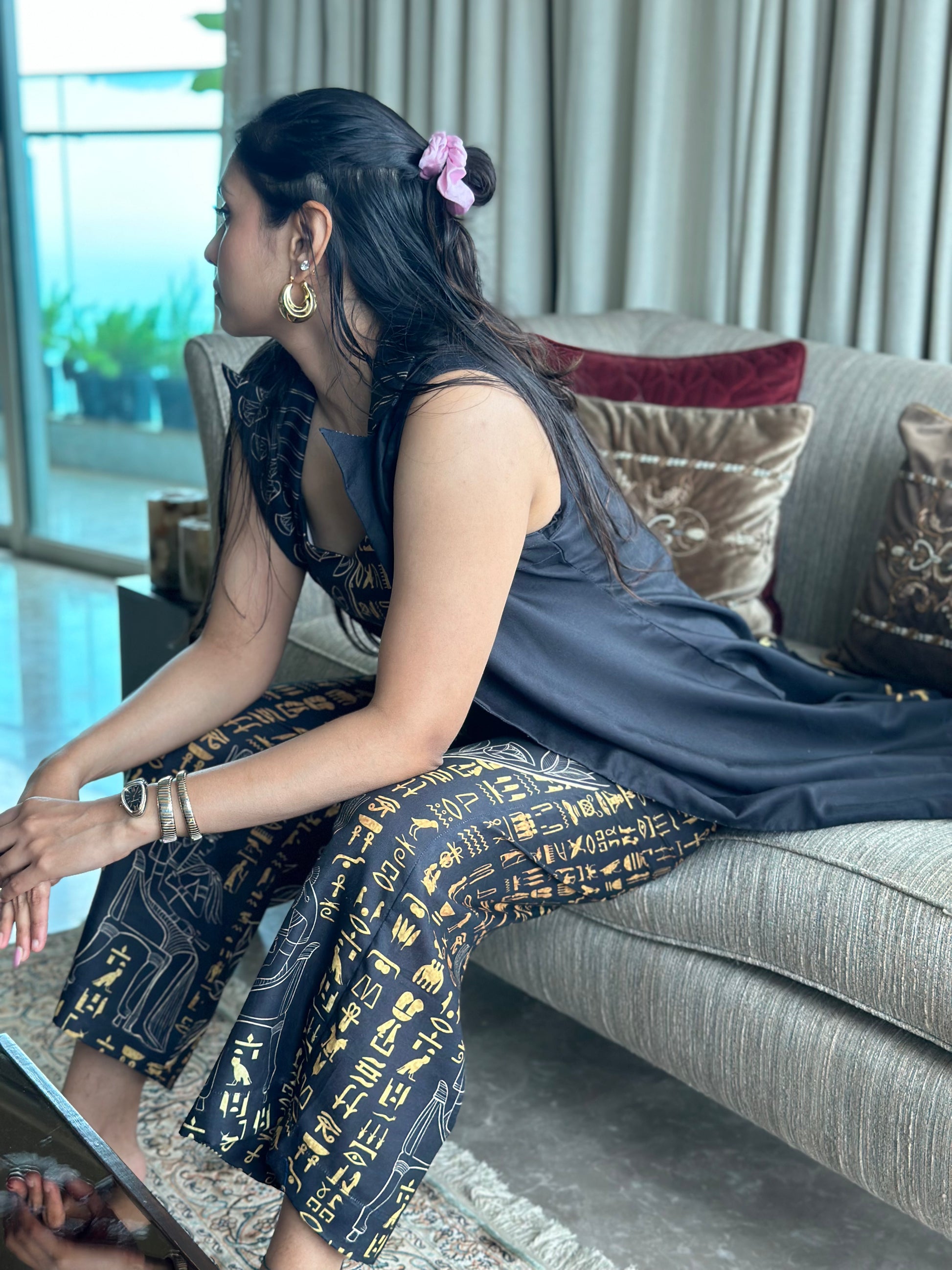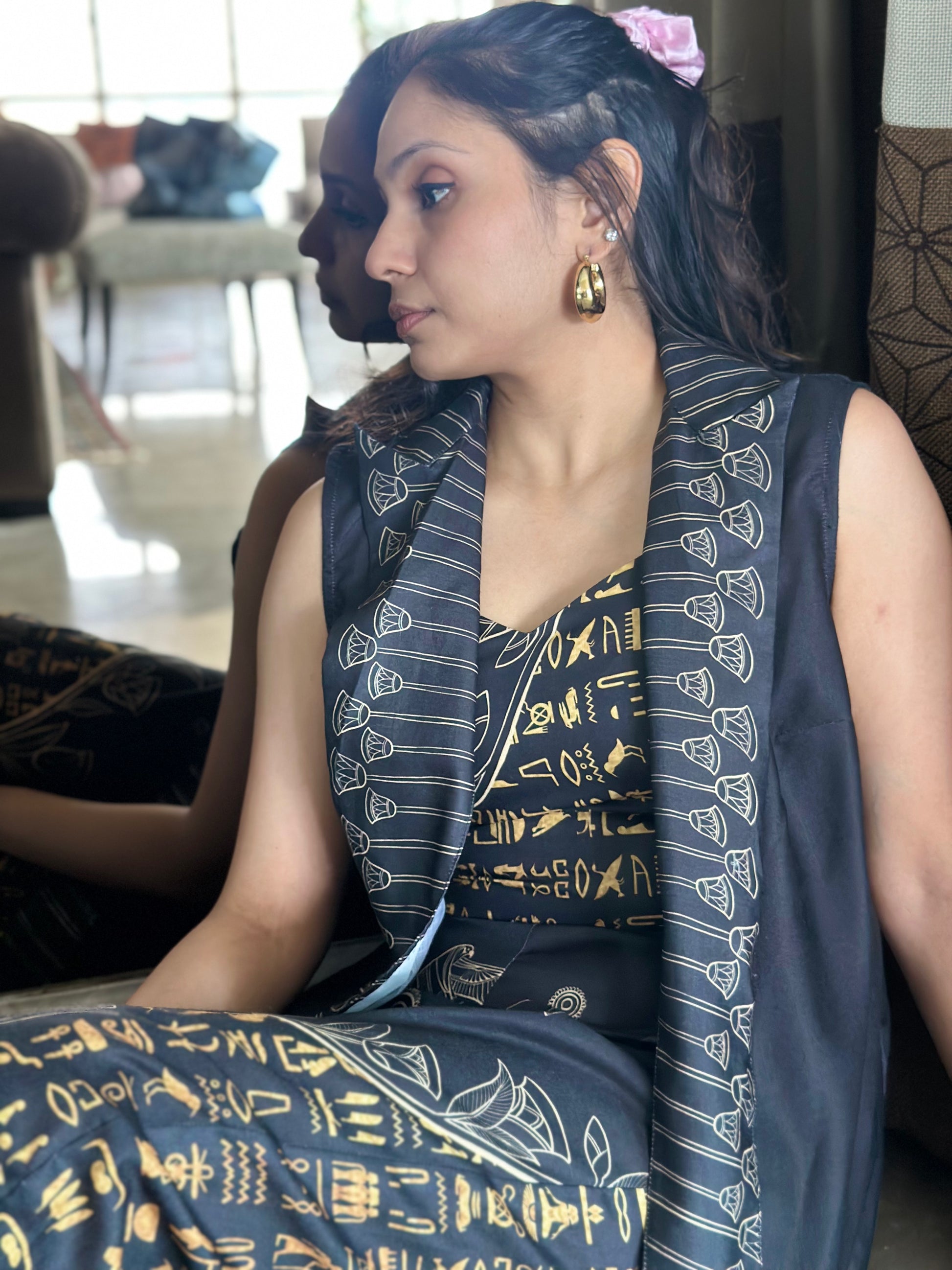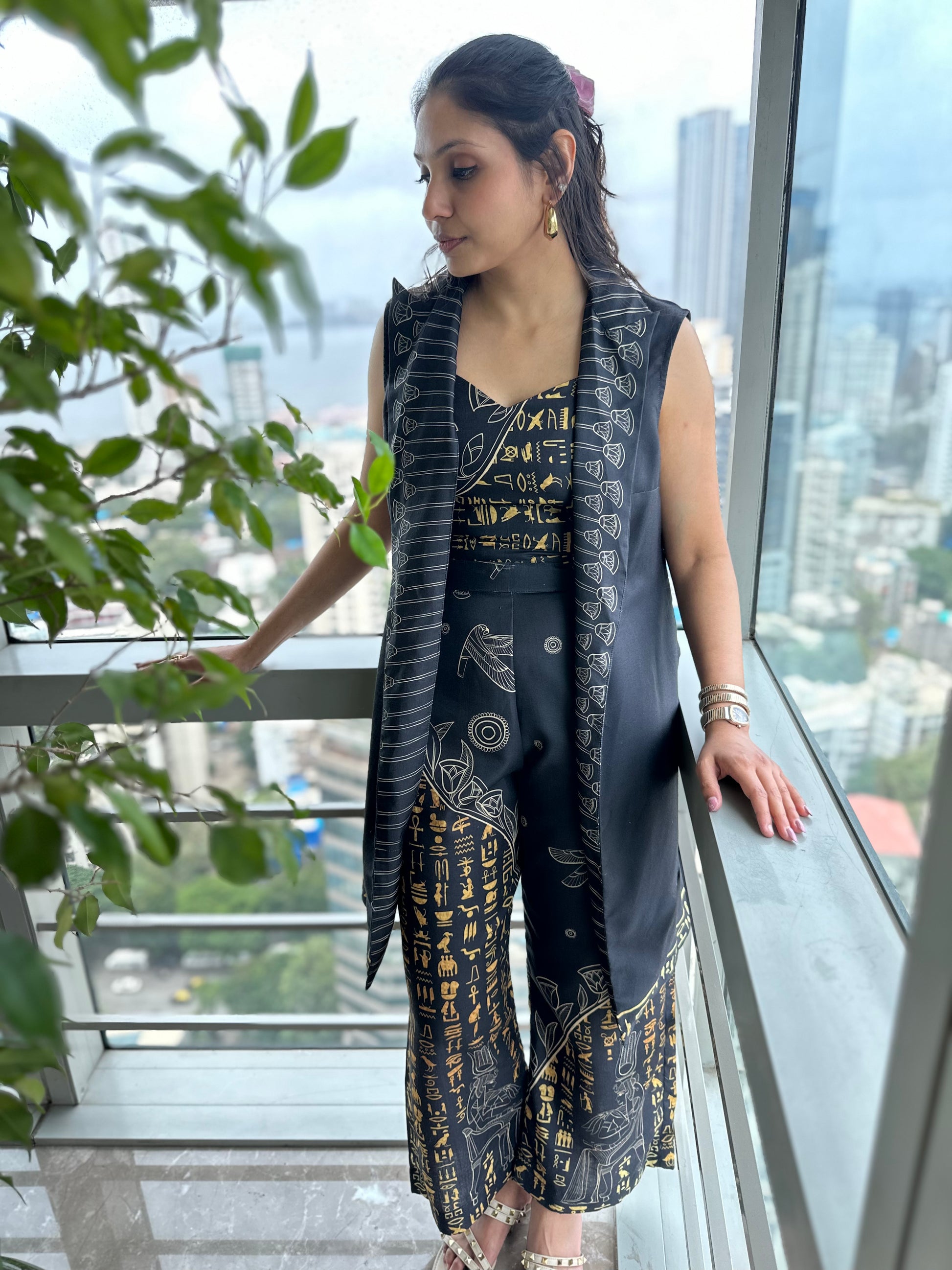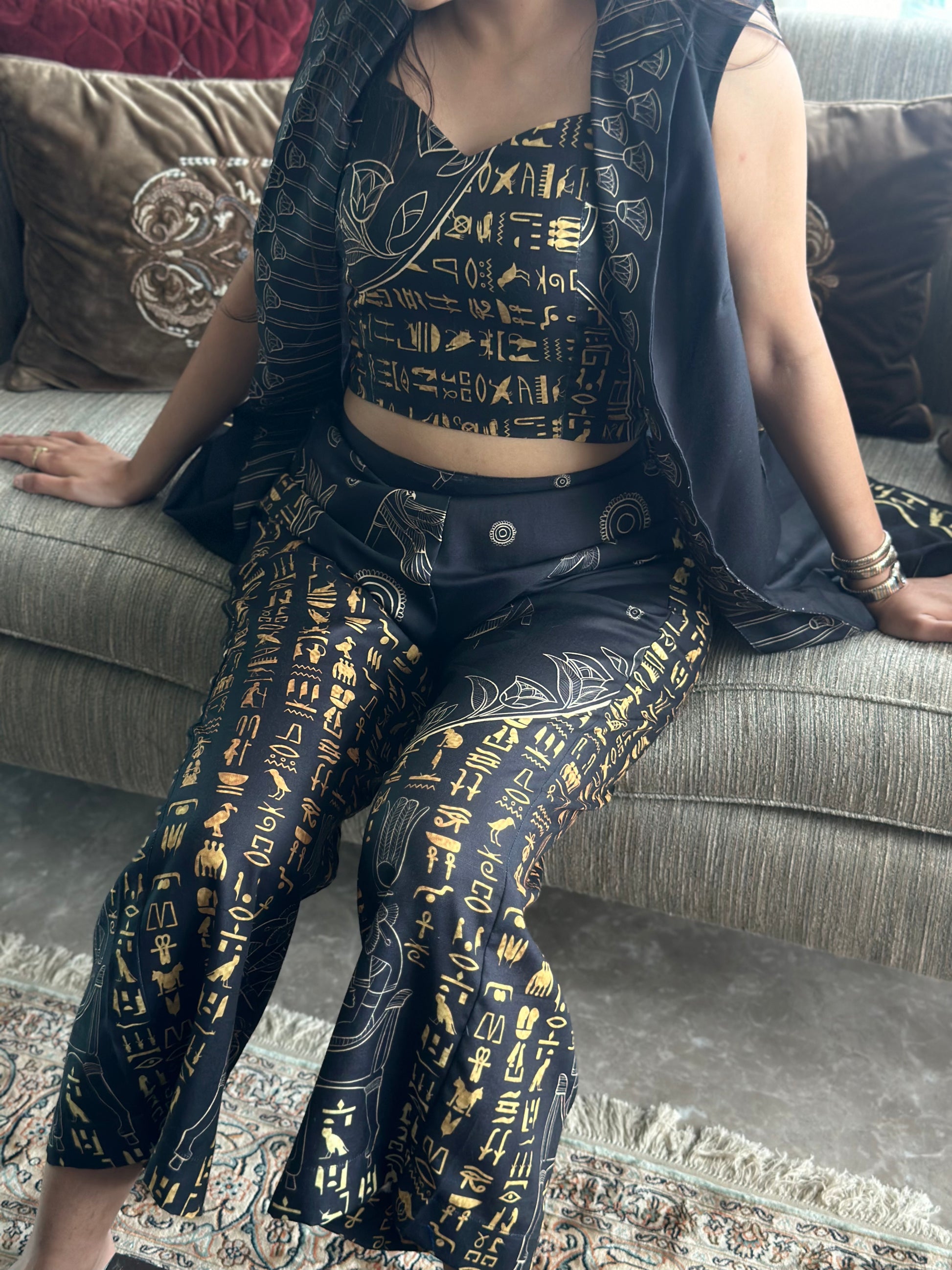 Make a bold statement with this exquisite black and gold co-ord set, inspired by ancient Egyptian motifs. The outfit features a stylish sleeveless longline jacket with intricate printed detailing, paired with a matching crop top and wide-leg pants adorned with hieroglyphic inspired patterns. The structured yet flowy silhouette adds an effortlessly chic touch, making it a standout ensemble for any occasion.