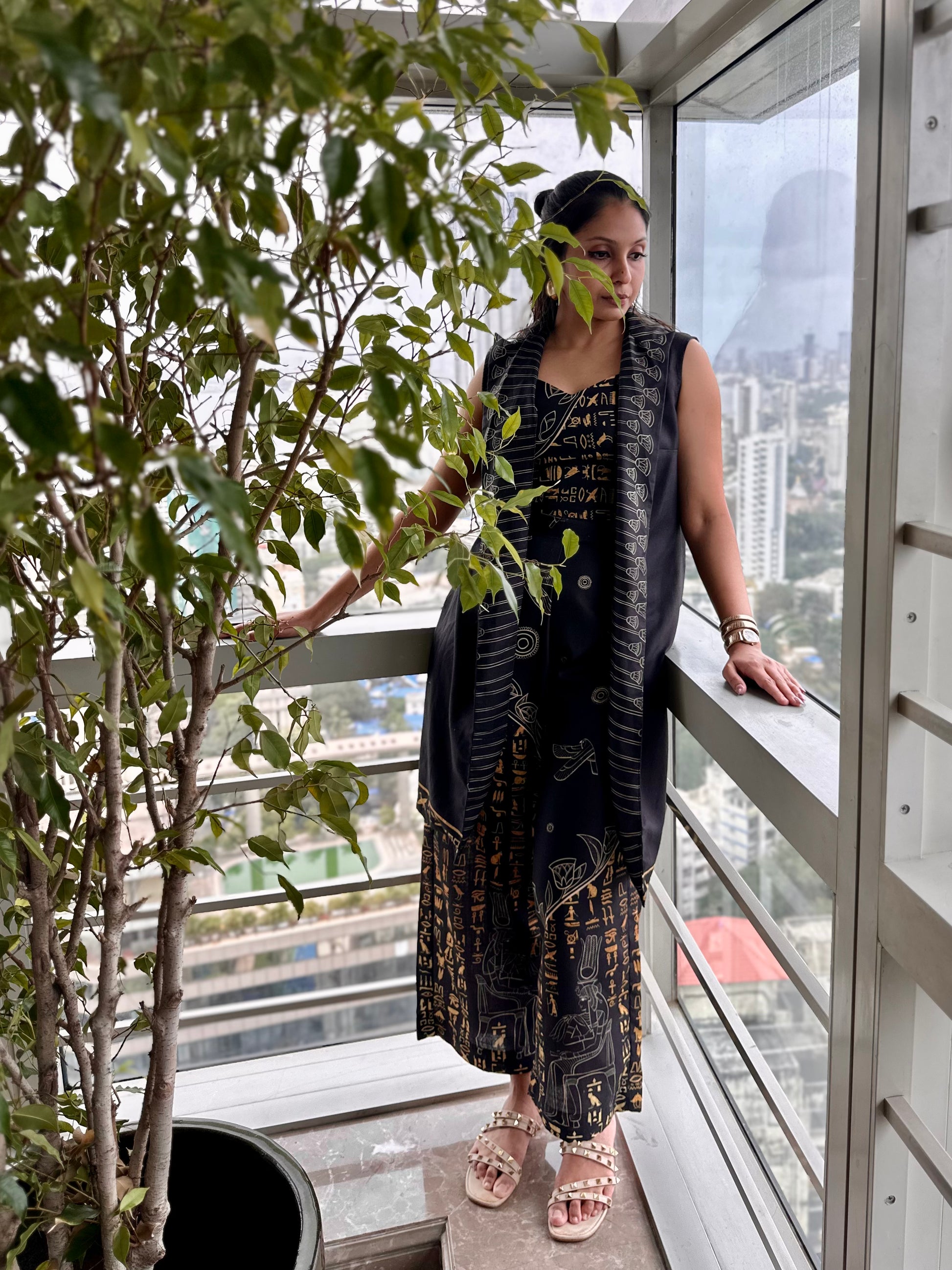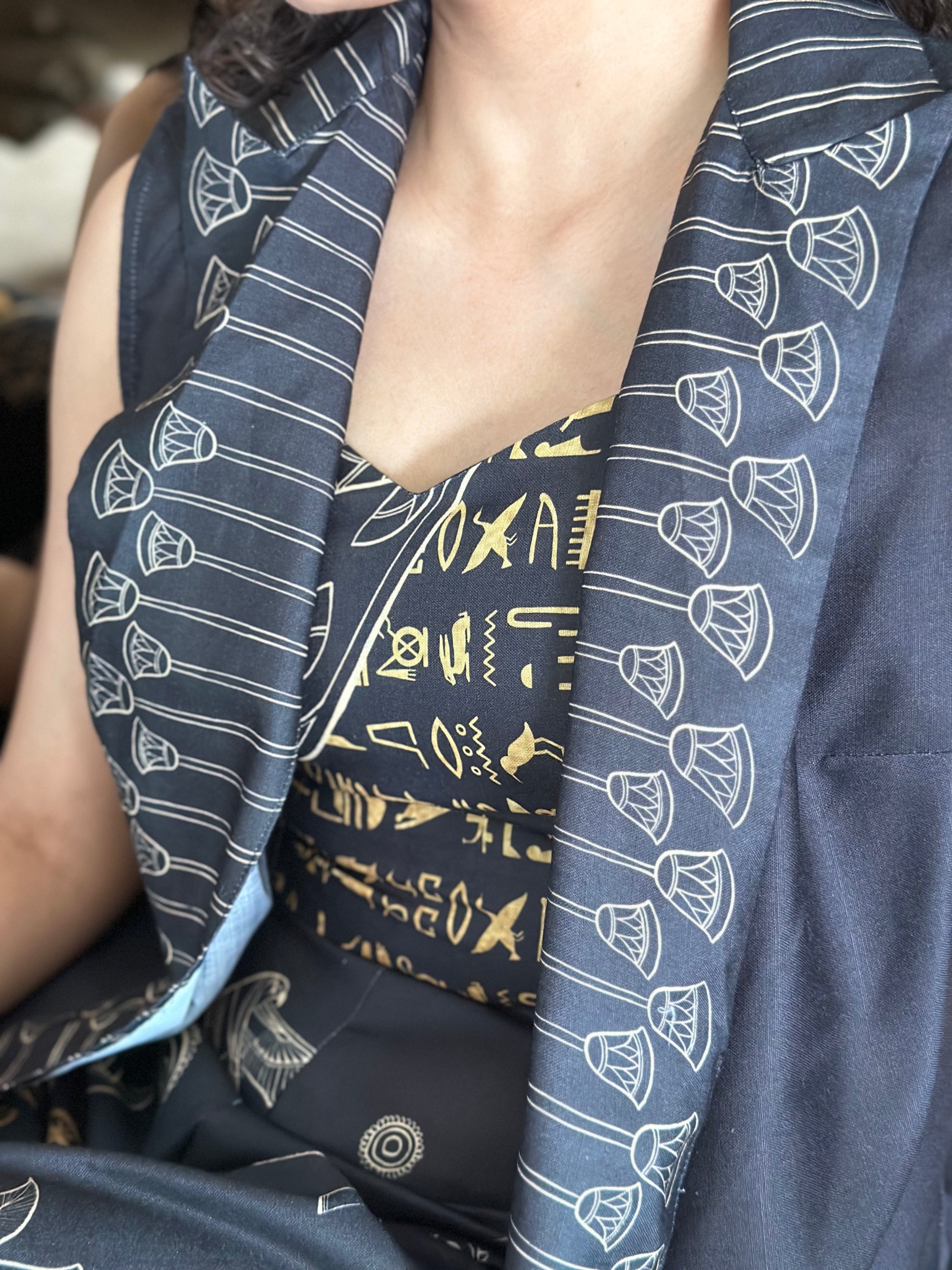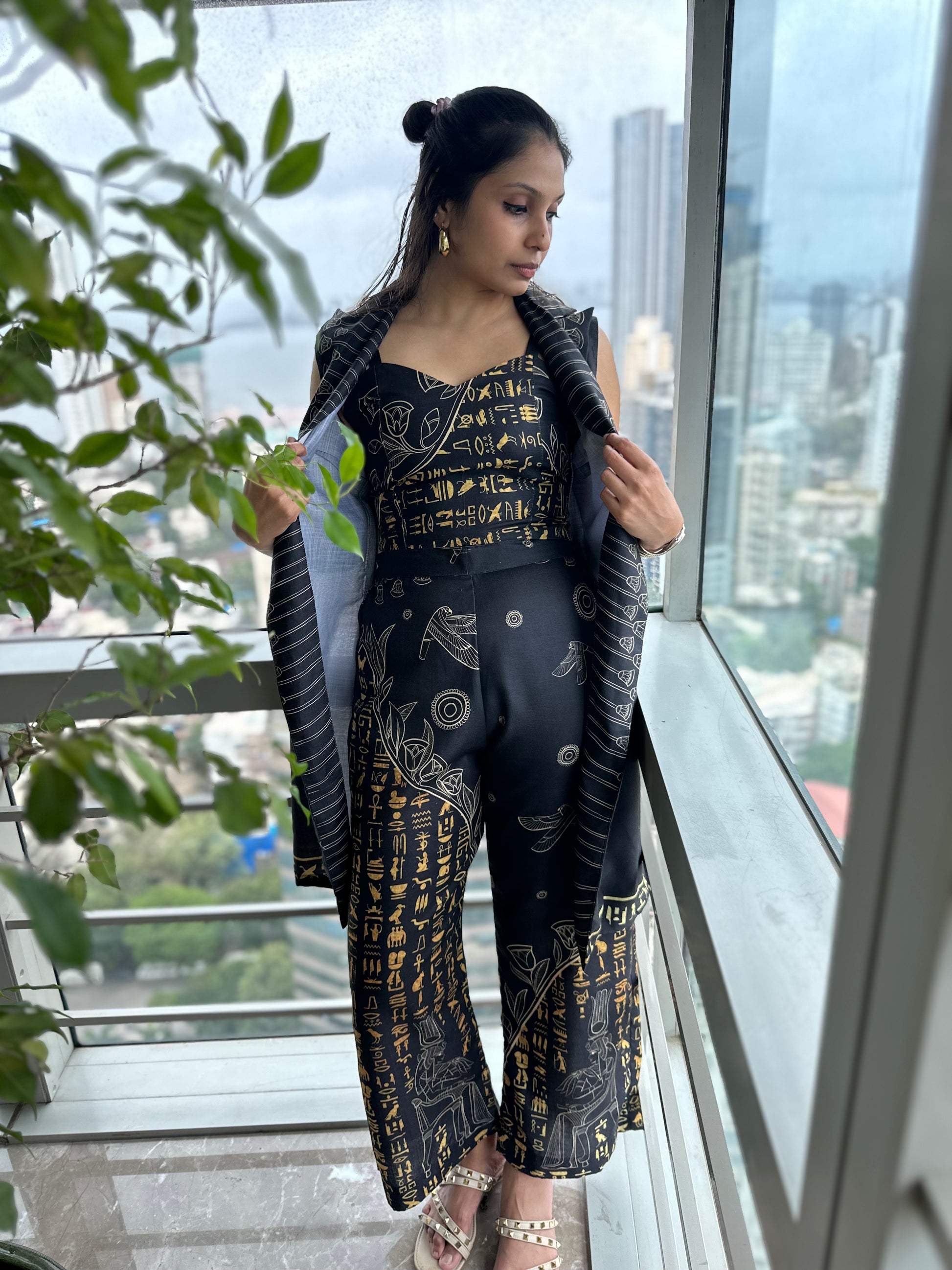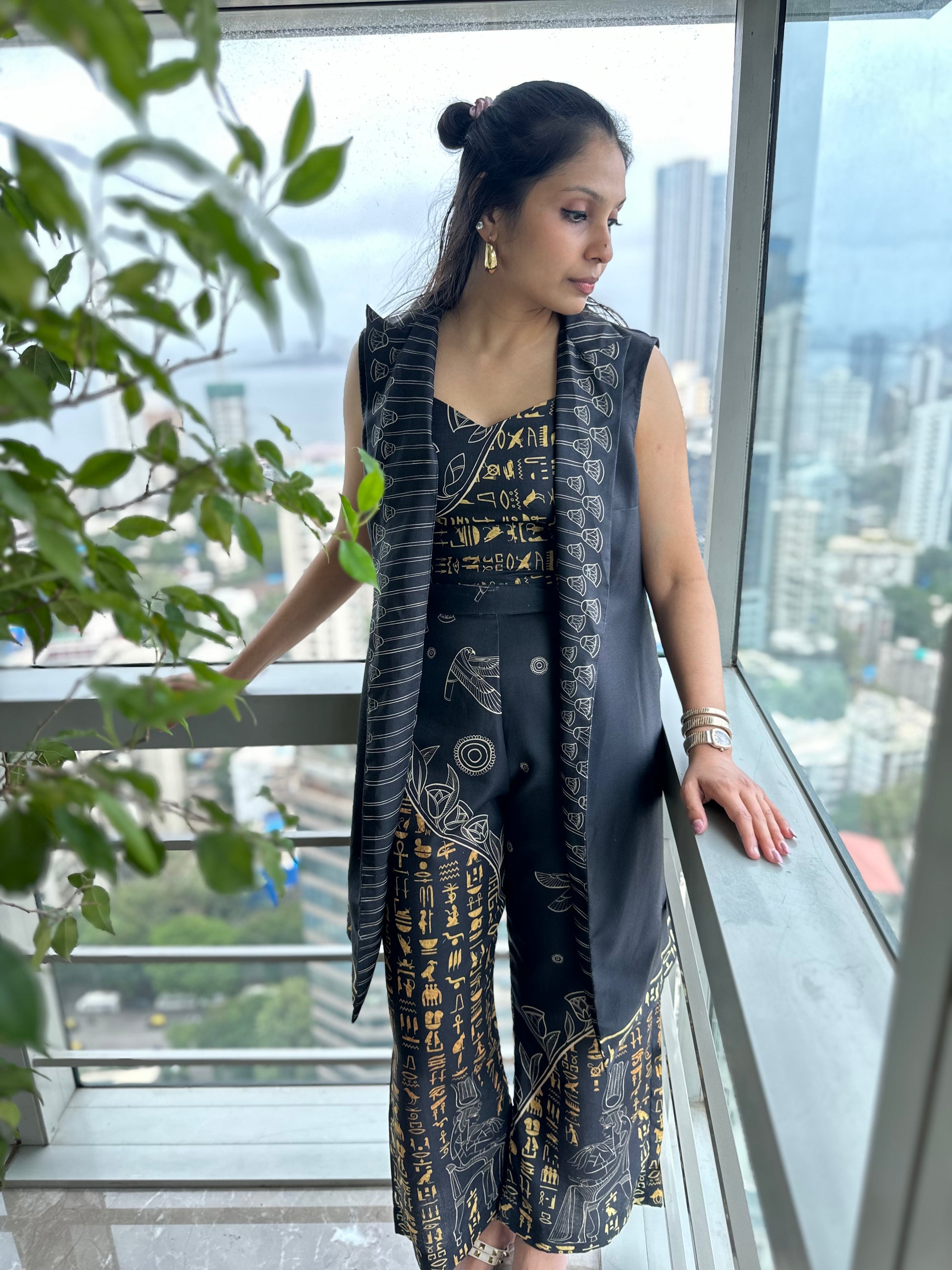 Make a bold statement with this exquisite black and gold co-ord set, inspired by ancient Egyptian motifs. The outfit features a stylish sleeveless longline jacket with intricate printed detailing, paired with a matching crop top and wide-leg pants adorned with hieroglyphic inspired patterns. The structured yet flowy silhouette adds an effortlessly chic touch, making it a standout ensemble for any occasion.