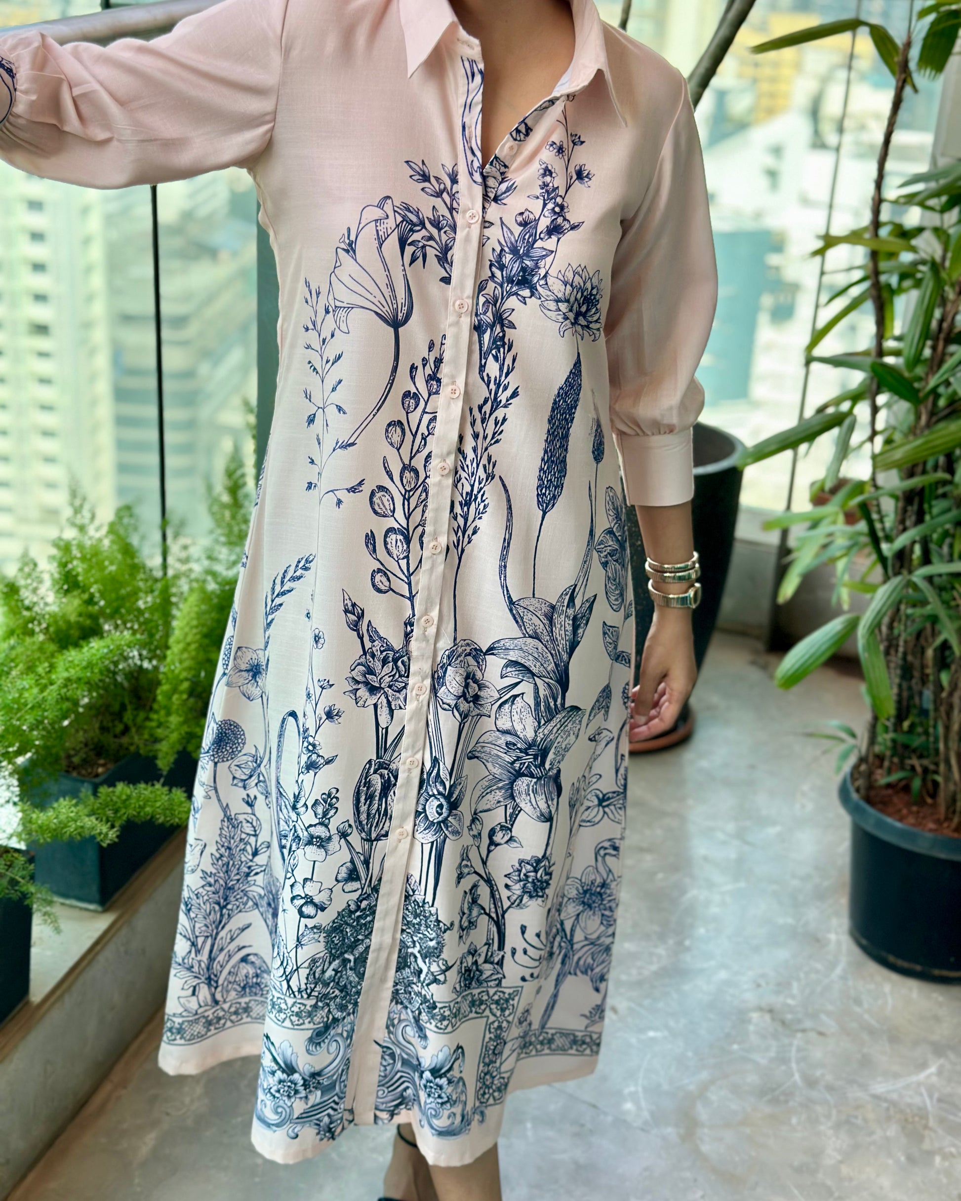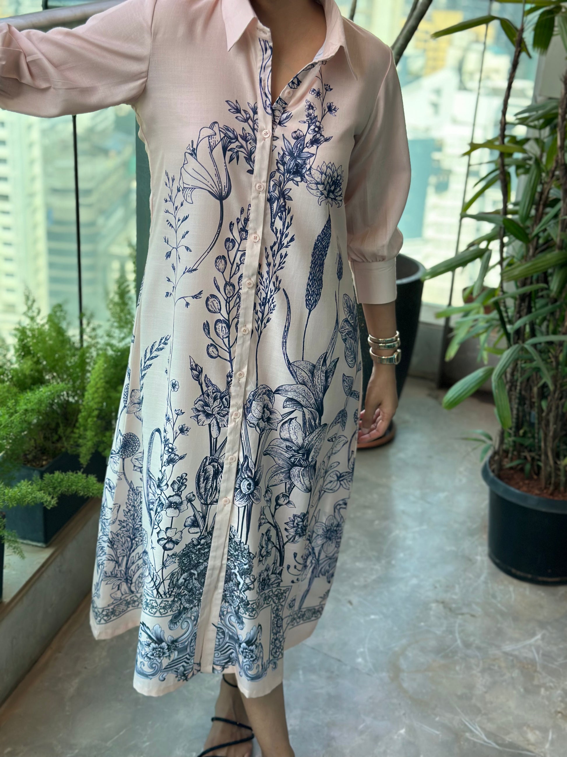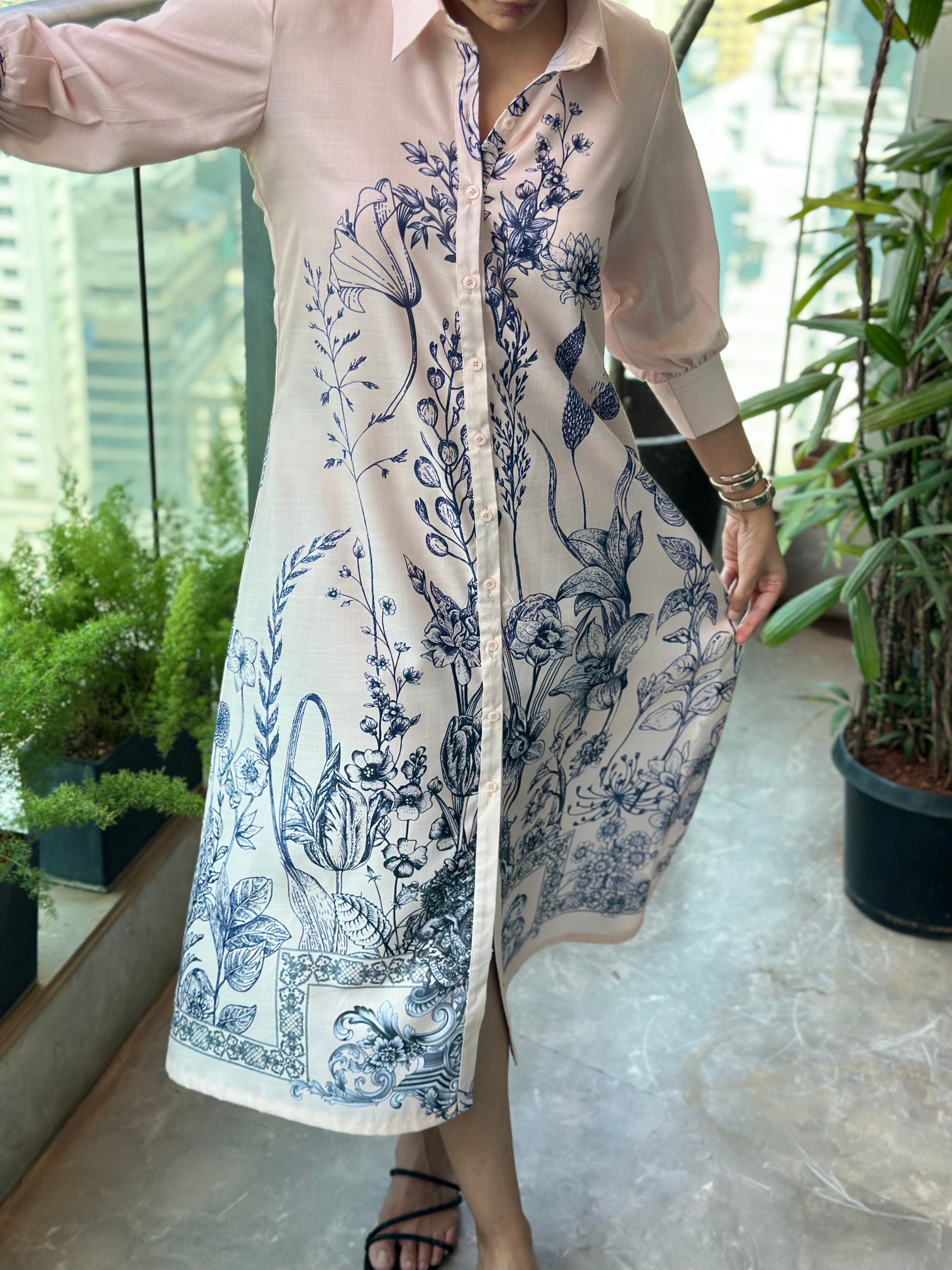 The Elegance in Bloom Shirt Dress is a sophisticated yet effortlessly stylish piece. This midi-length button-down dress features a soft pastel pink base adorned with intricate navy blue botanical prints, creating a timeless, graceful aesthetic. The structured collar and 3/4th sleeves add a refined touch, making it an ideal blend of casual elegance.