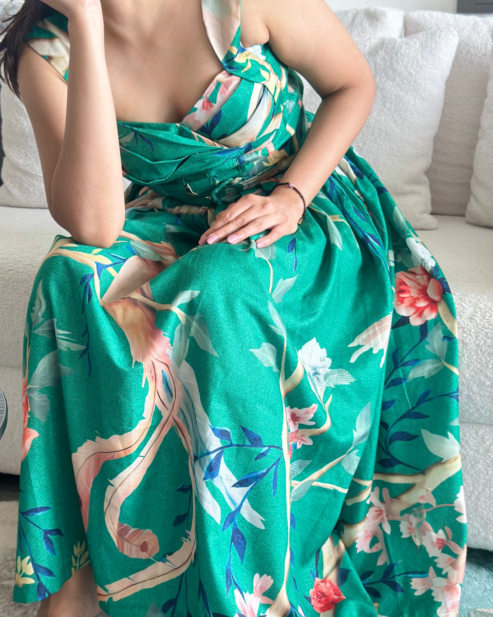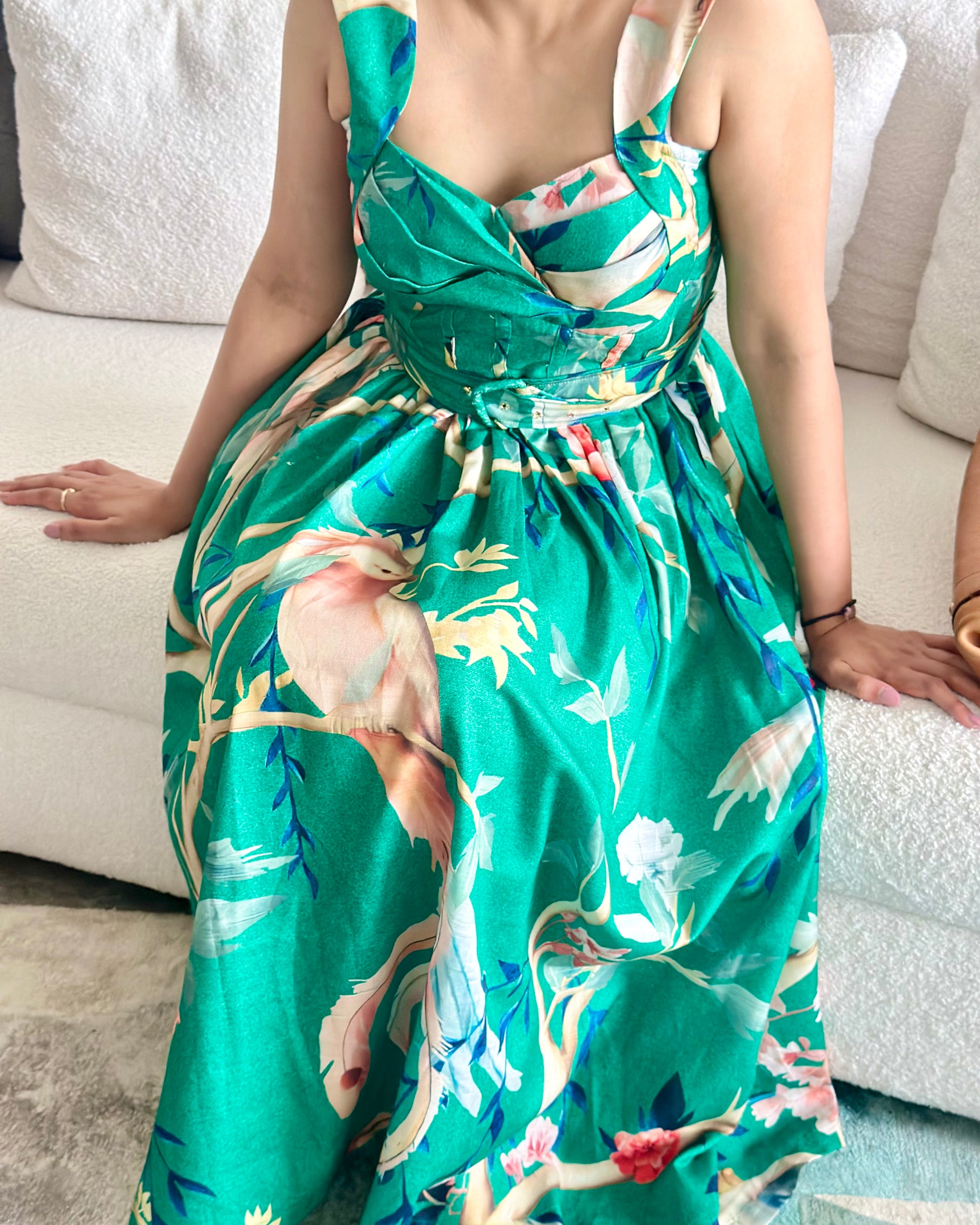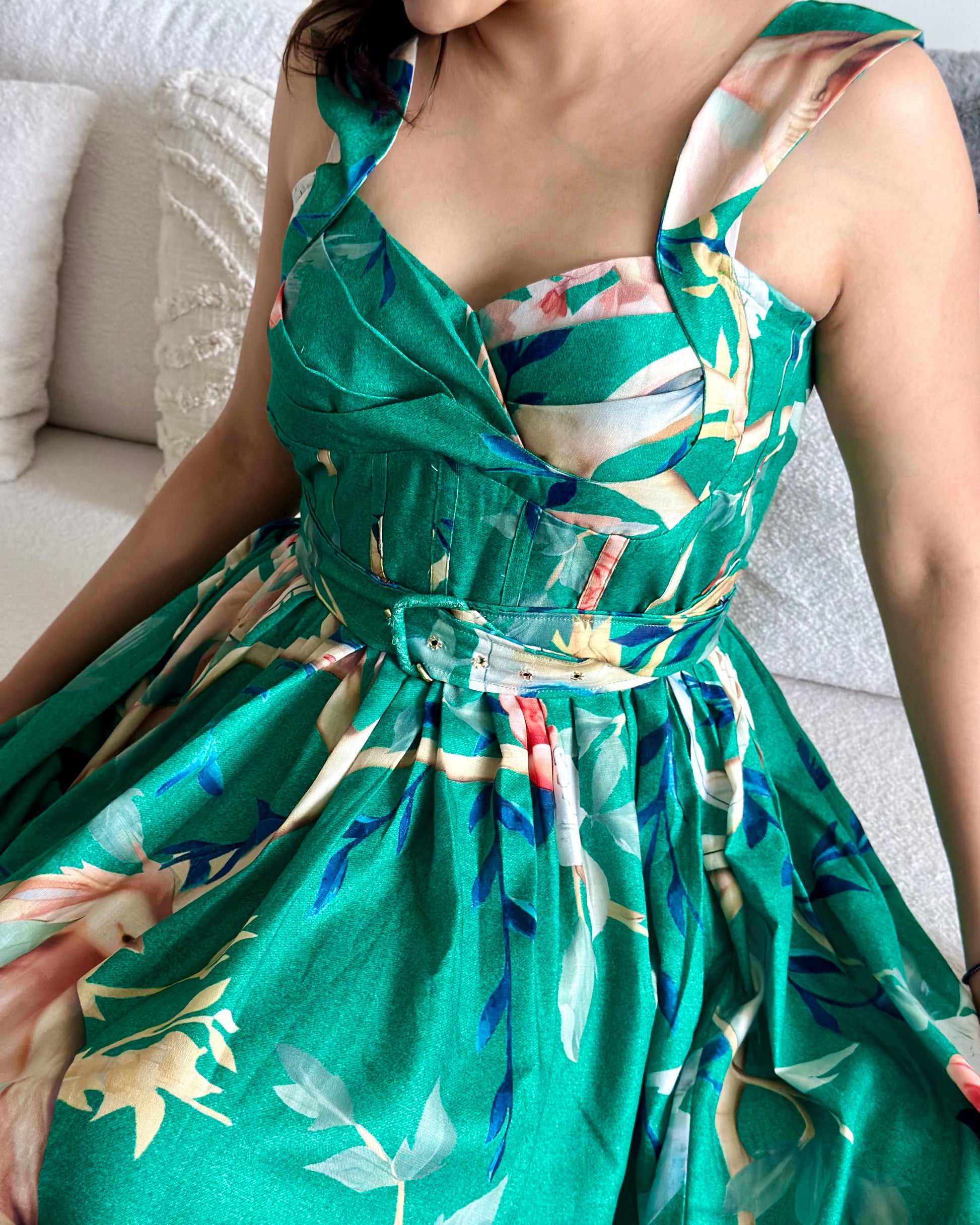 The Emerald Blossom Belted Maxi Dress is an enchanting and flowy piece, perfect for making a bold yet elegant statement. Designed in a rich emerald green base with delicate floral prints, this dress exudes tropical charm and timeless sophistication. The sweetheart neckline with ruffled shoulder straps adds a romantic touch, while the fitted bodice cinched at the waist with a matching belt creates a flattering silhouette. The flowing A-line skirt enhances movement, making it a breezy and graceful choice.