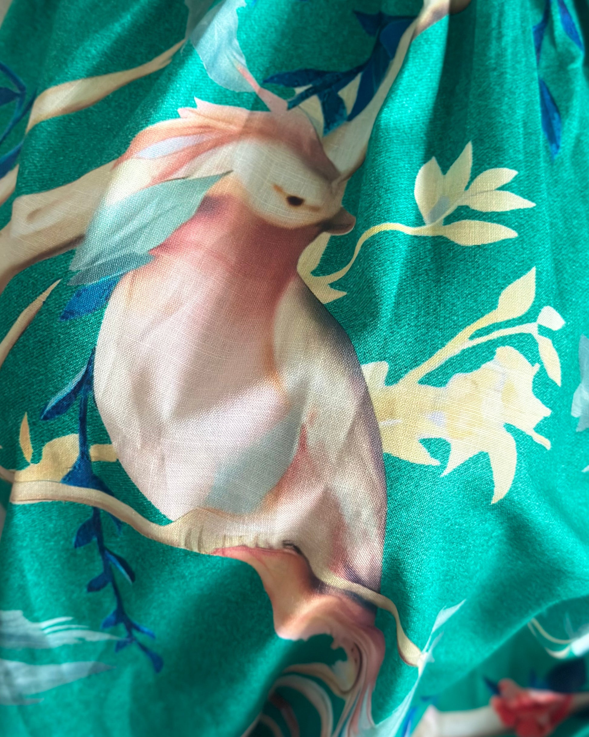 Styling tips: Pair with nude or gold strappy sandals for a refined look,Add statement pearl or floral earrings to enhance the dress’s elegance.A woven clutch or mini handbag complements the tropical vibe beautifully Keep your hair in soft curls or a high ponytail for an effortless touch. Opt for minimal dewy makeup with a soft pink or nude lip to complete the look