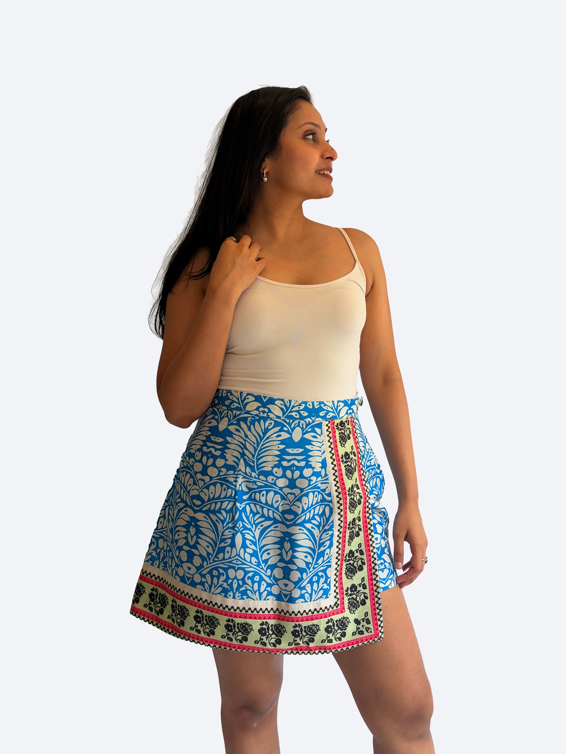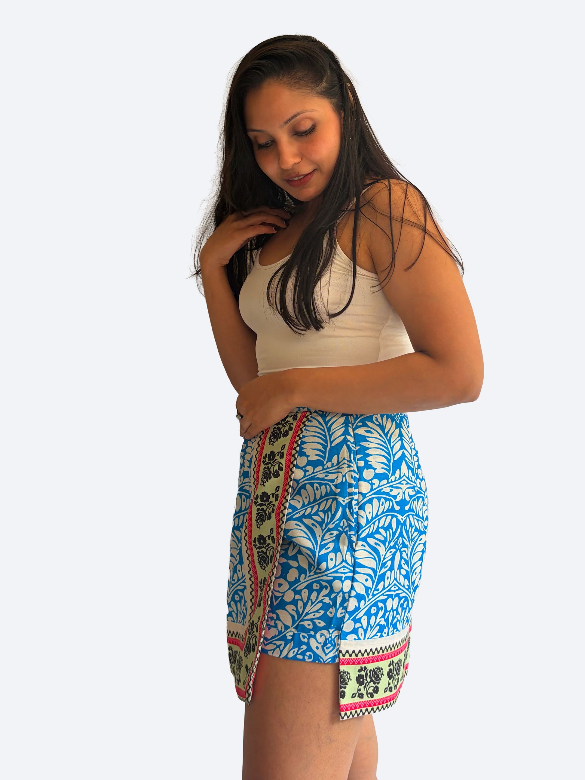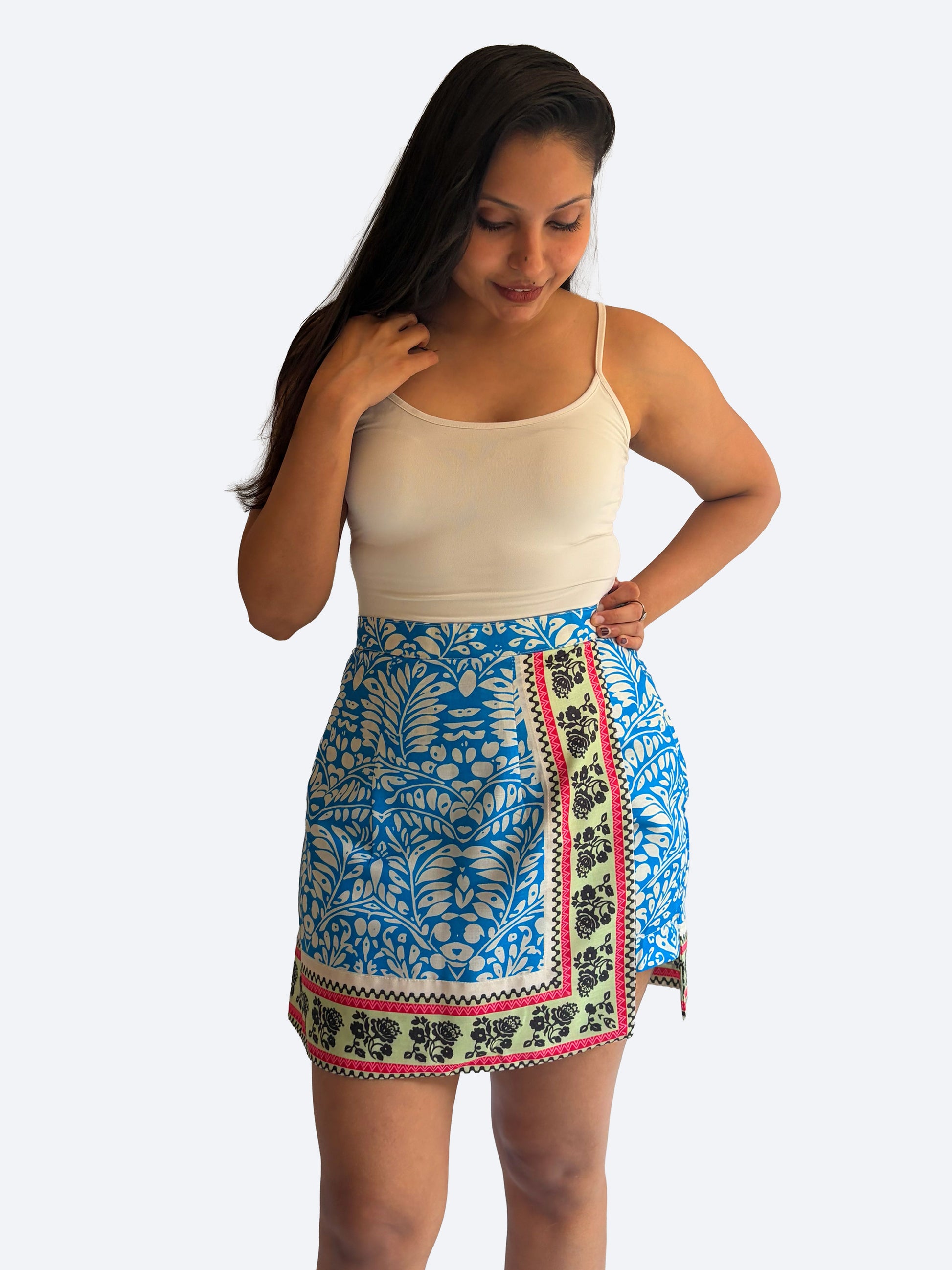 features a striking mix of floral and geometric motifs in rich indigo hues. Designed to look like a skirt with the comfort of shorts, it’s a standout piece that transitions seamlessly from day to night.