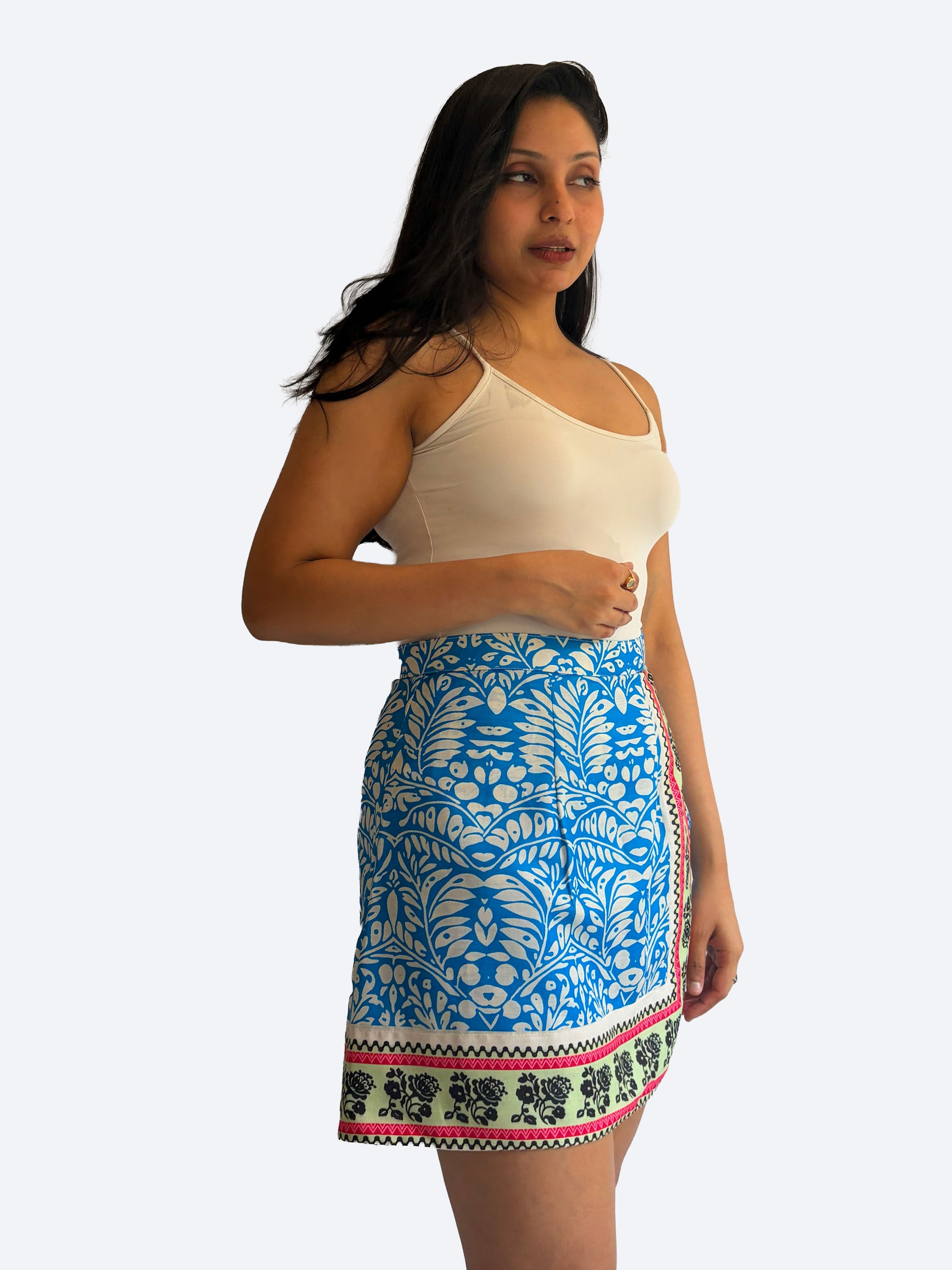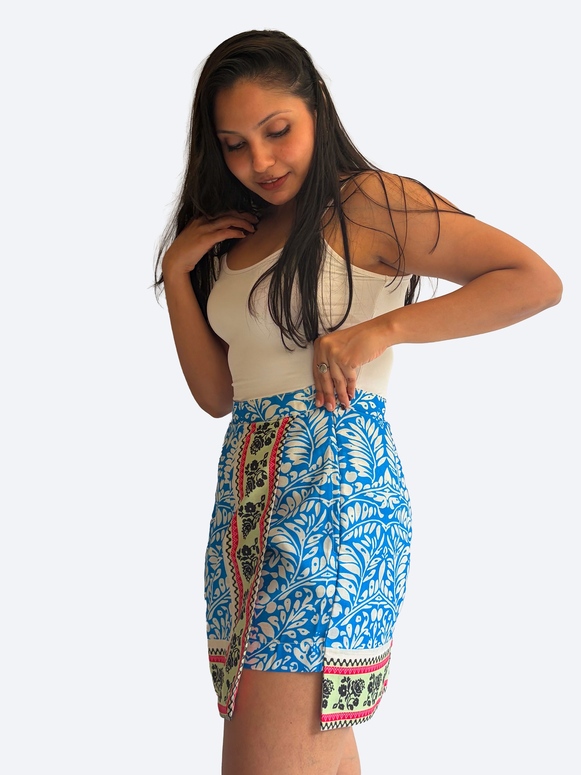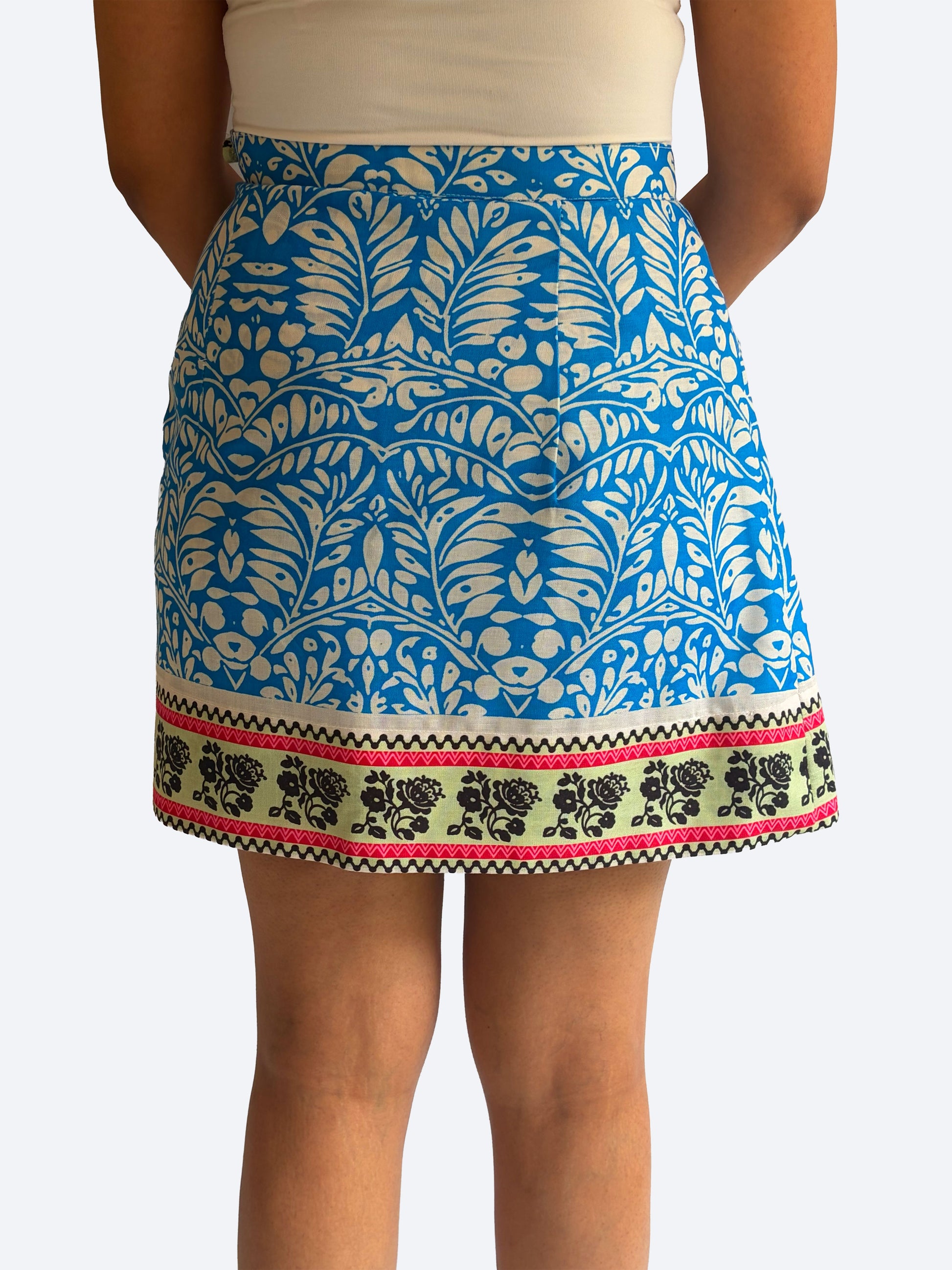 features a striking mix of floral and geometric motifs in rich indigo hues. Designed to look like a skirt with the comfort of shorts, it’s a standout piece that transitions seamlessly from day to night.