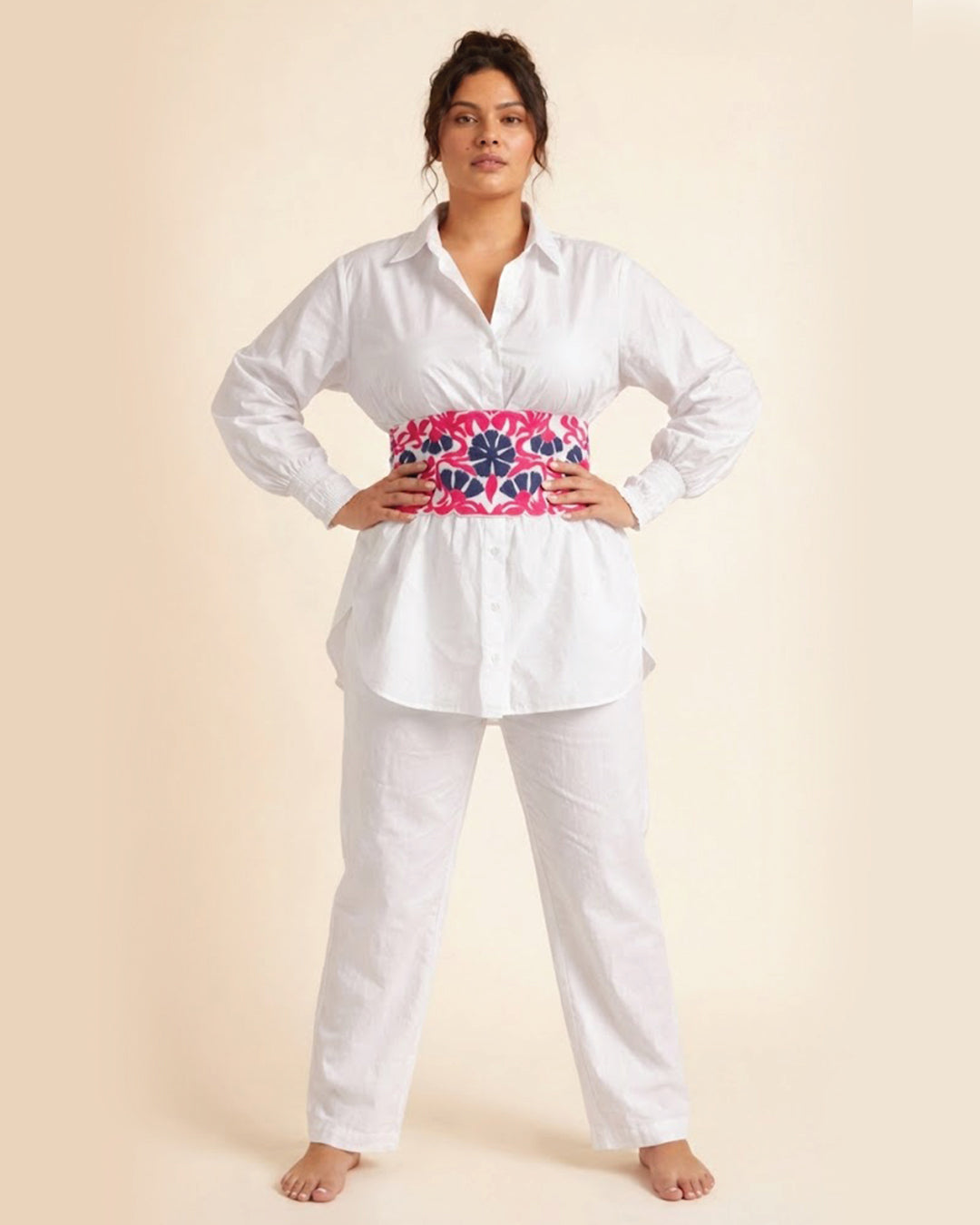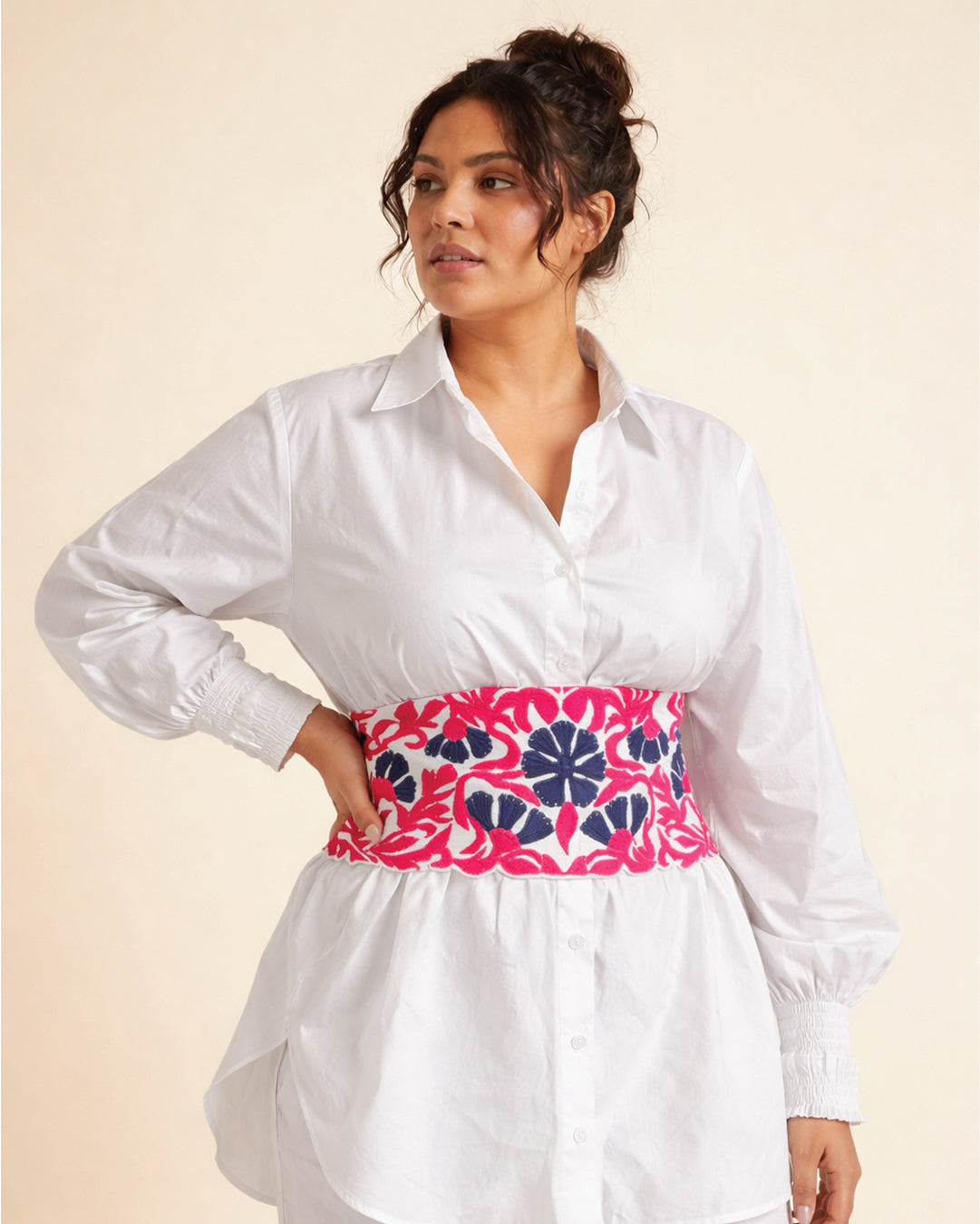 Effortlessly elegant, the Ivory Grace Oversized Poplin Shirt redefines classic white with a touch of drama. Tailored in a luxurious, soft-touch cotton poplin, this longline shirt features voluminous bishop sleeves with elasticated smocked cuffs and a relaxed, flowy fit for ultimate comfort and movement. The crisp collar and clean button-down front create a timeless silhouette, while the exaggerated hem adds a modern edge. Comes with a vibrant, embroidered waist belt with tie details behind for the perfect snatched look