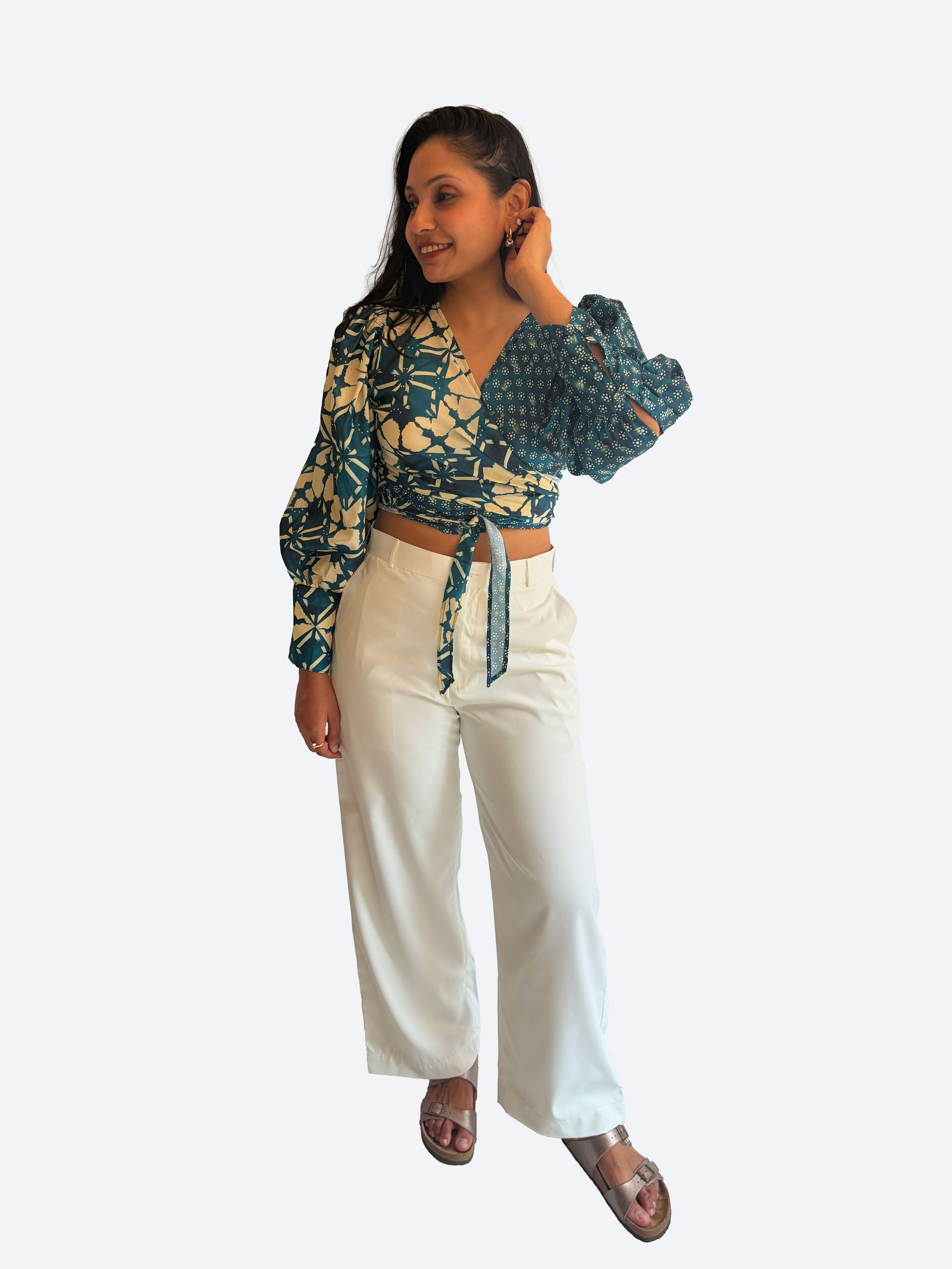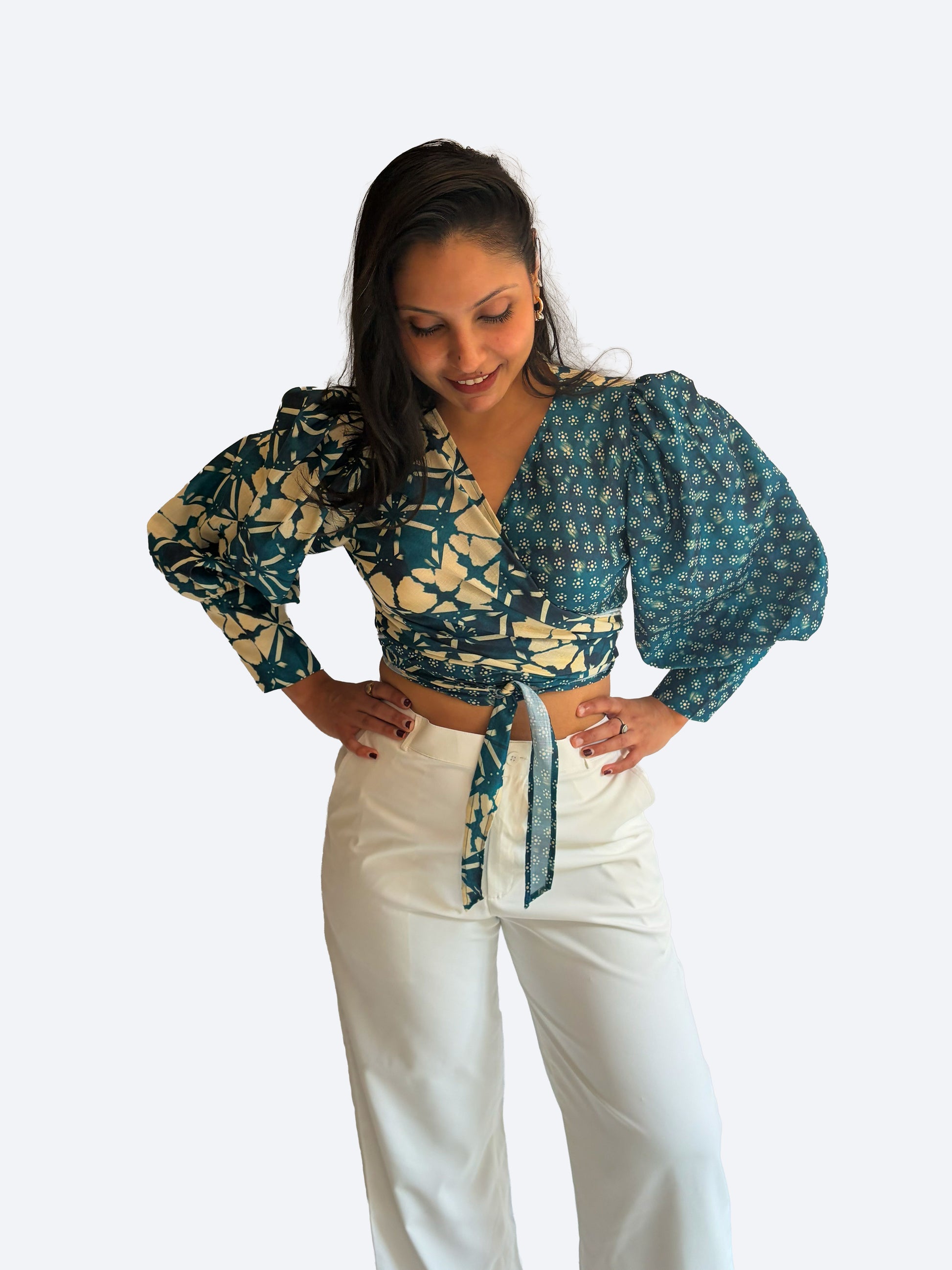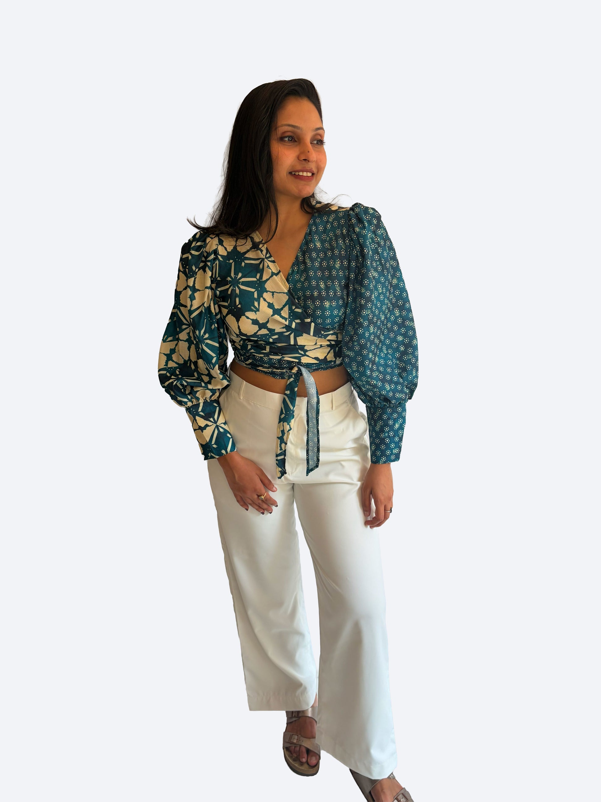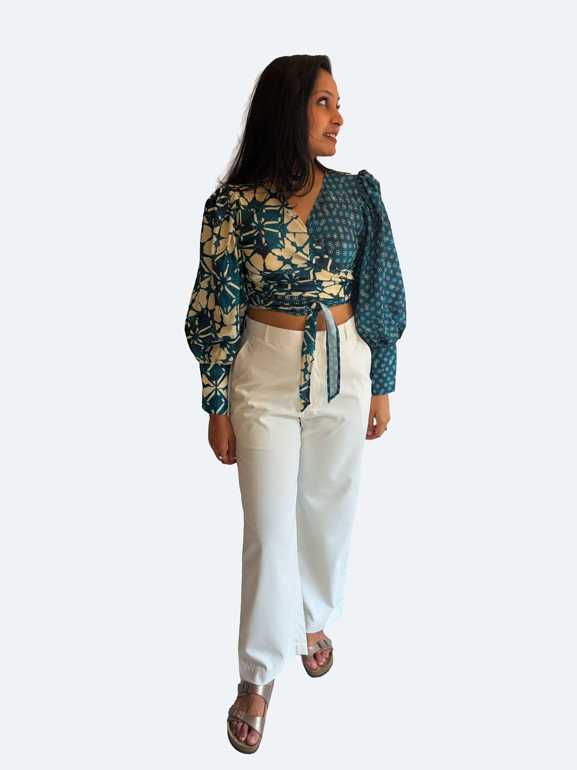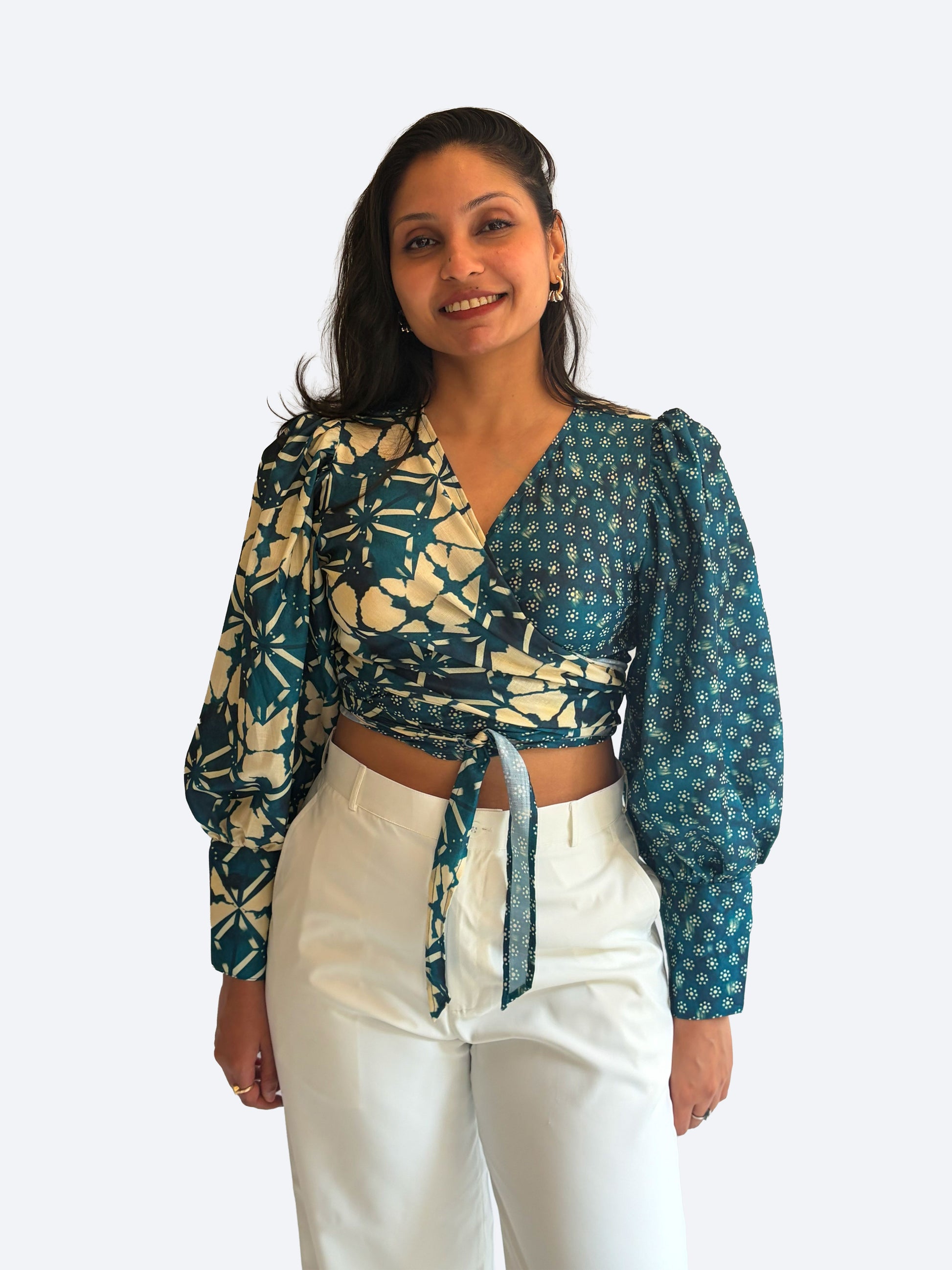 The Laila wrap around a round shirt has balloon sleeves with cuff detailing and tie detailing to cinch the waist