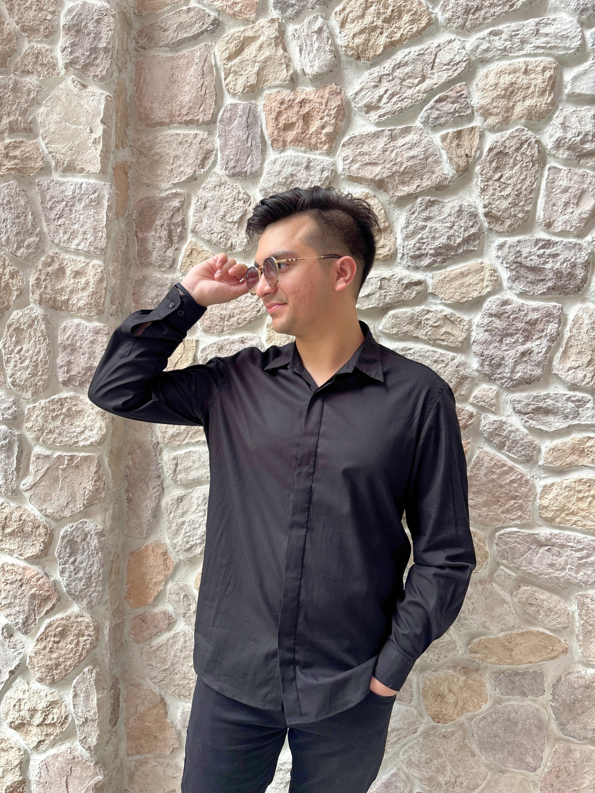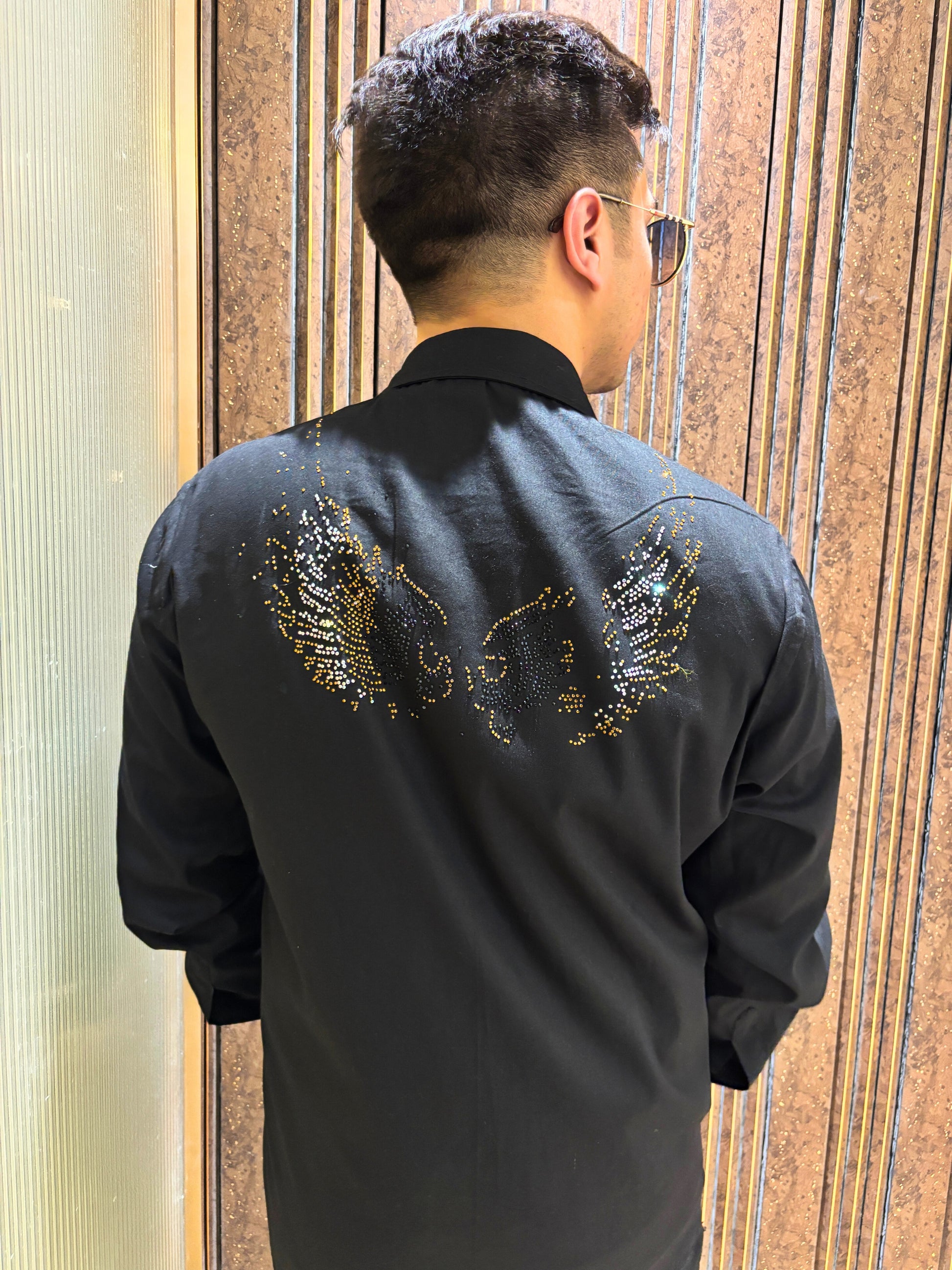 Made from rich, premium cotton fabric, this long-sleeve shirt stands out with an intricately beaded and sequined angel wing motif on the back—adding a dramatic edge to a timeless silhouette. The clean front and structured collar keep the look minimal from the front, while the back steals the show with its statement detailing.