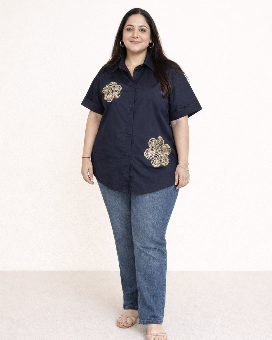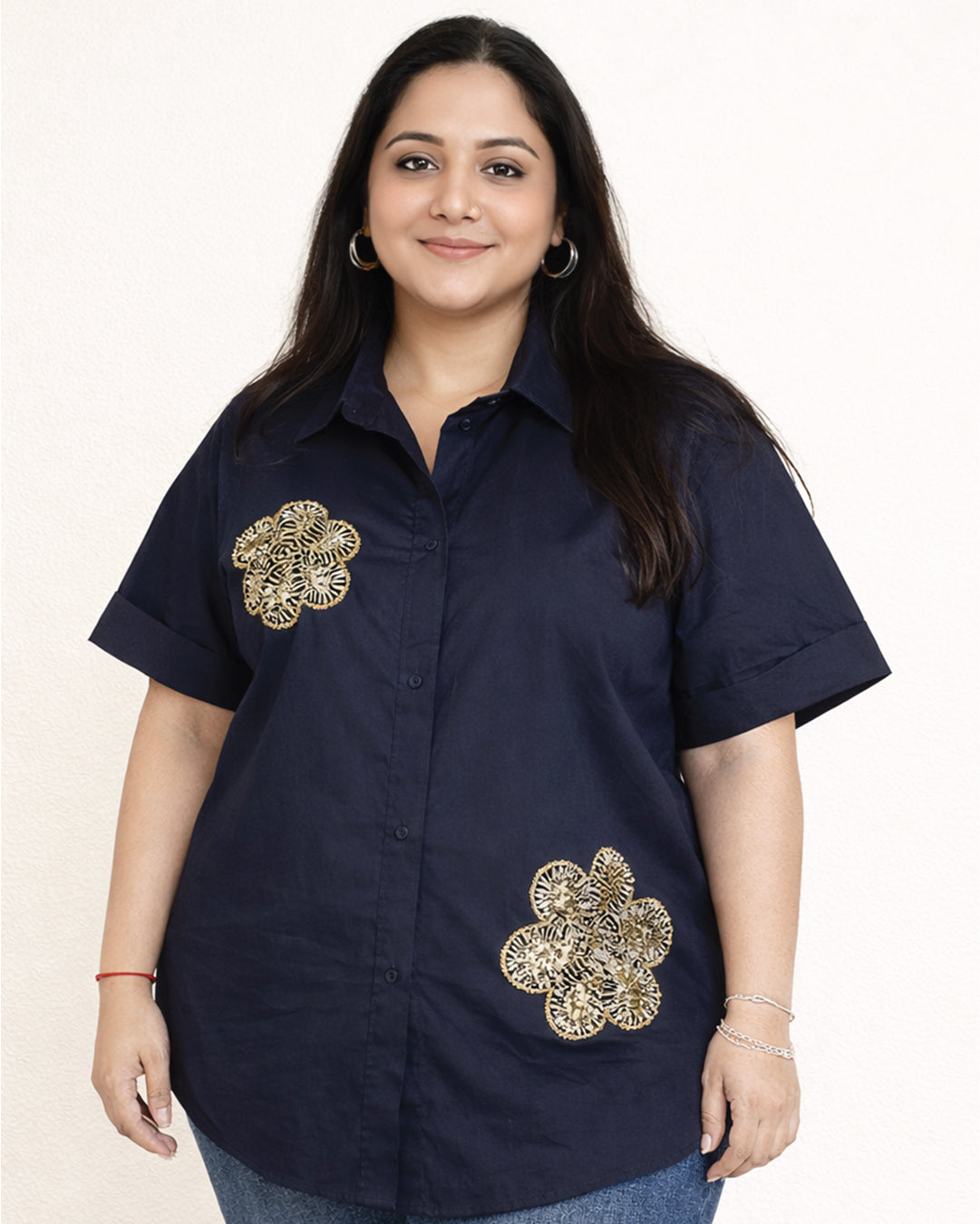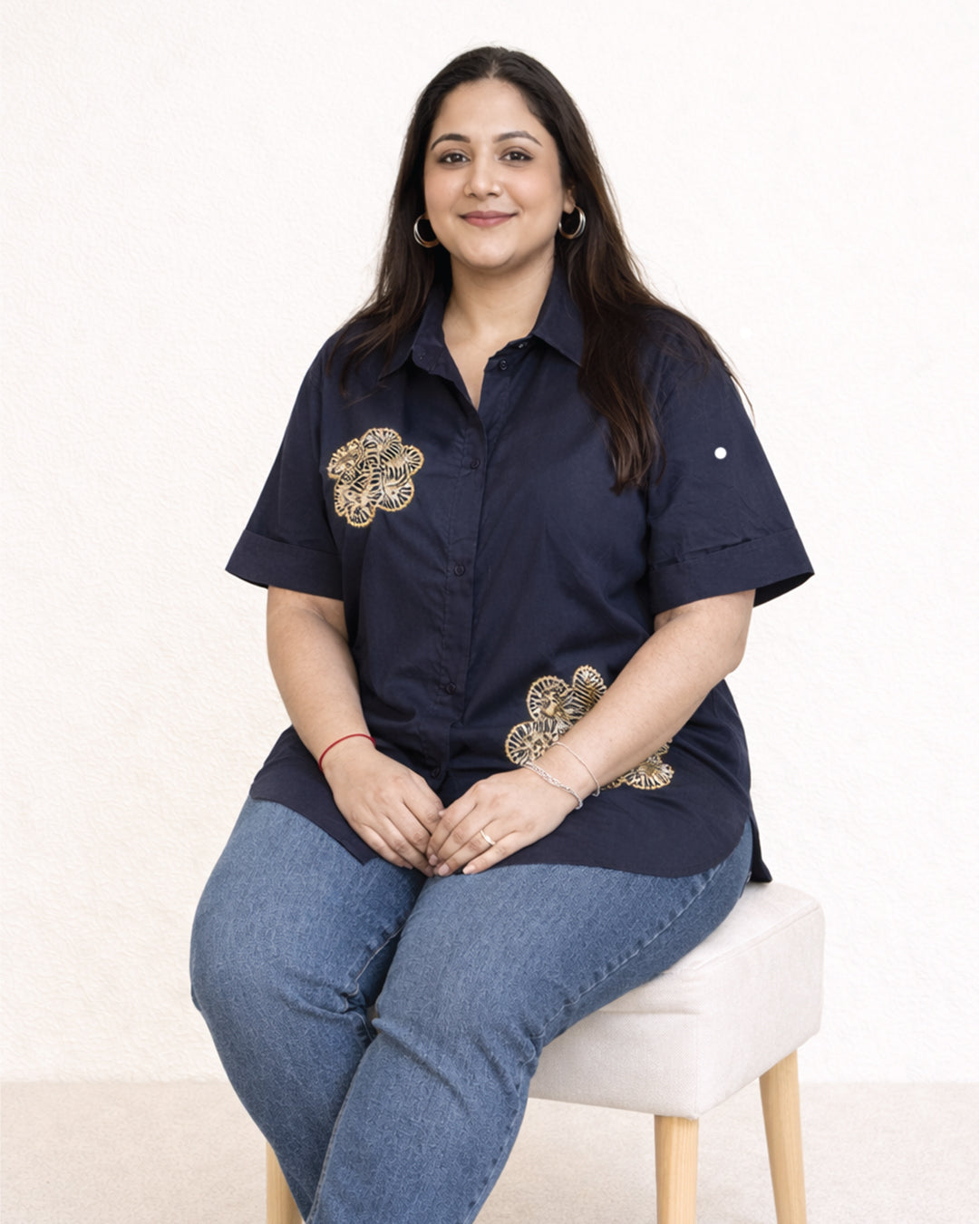 Understated elegance meets modern flair with the Navy Bloom Embellished Cotton Shirt. Crafted from breathable navy-blue cotton, this short-sleeved shirt features intricate gold-toned floral embellishments that add just the right touch of sparkle and sophistication. With its relaxed fit, classic collar, and curved hemline, this shirt is designed for comfort and versatility — perfect for both day and evening wear.
