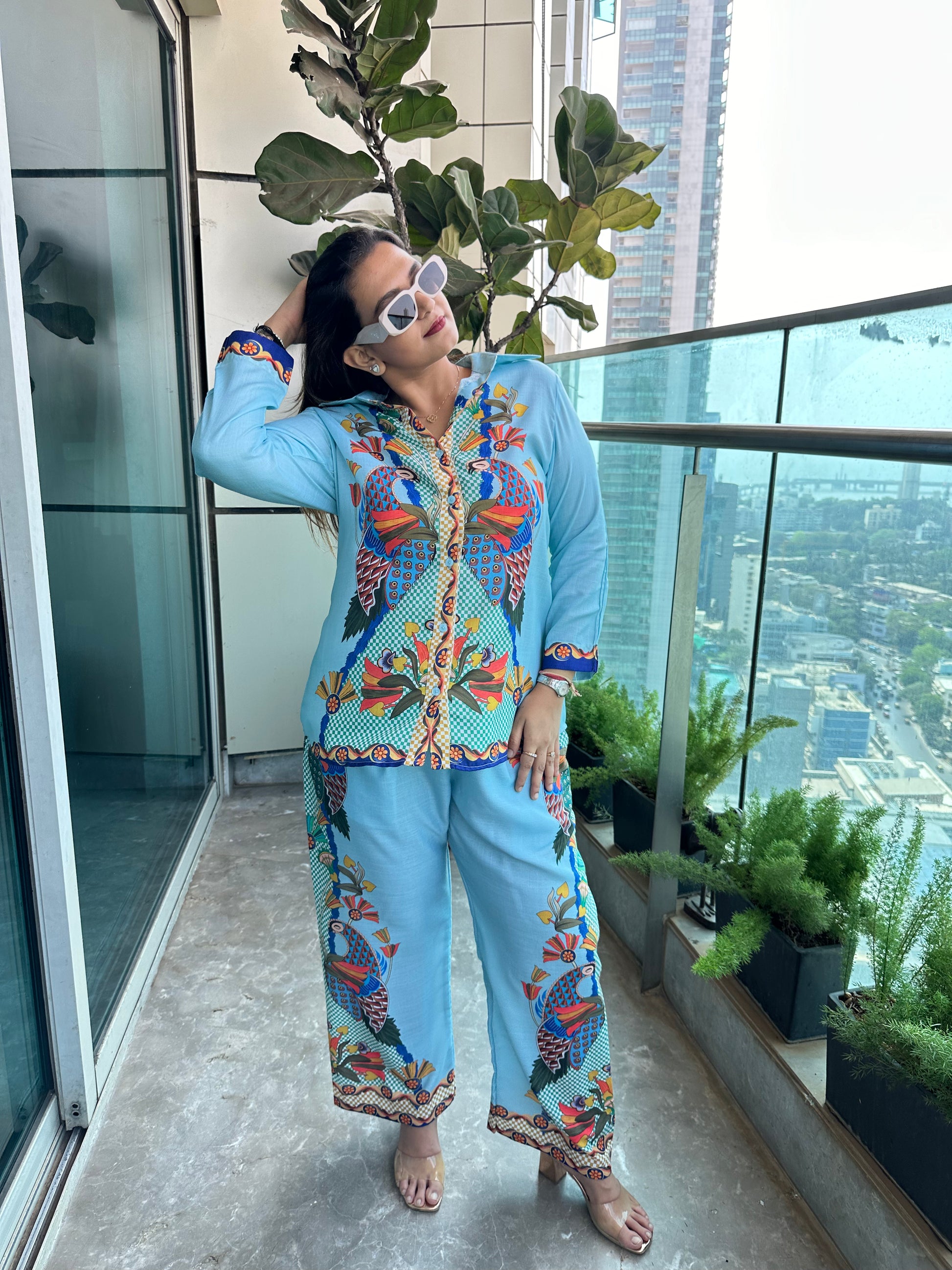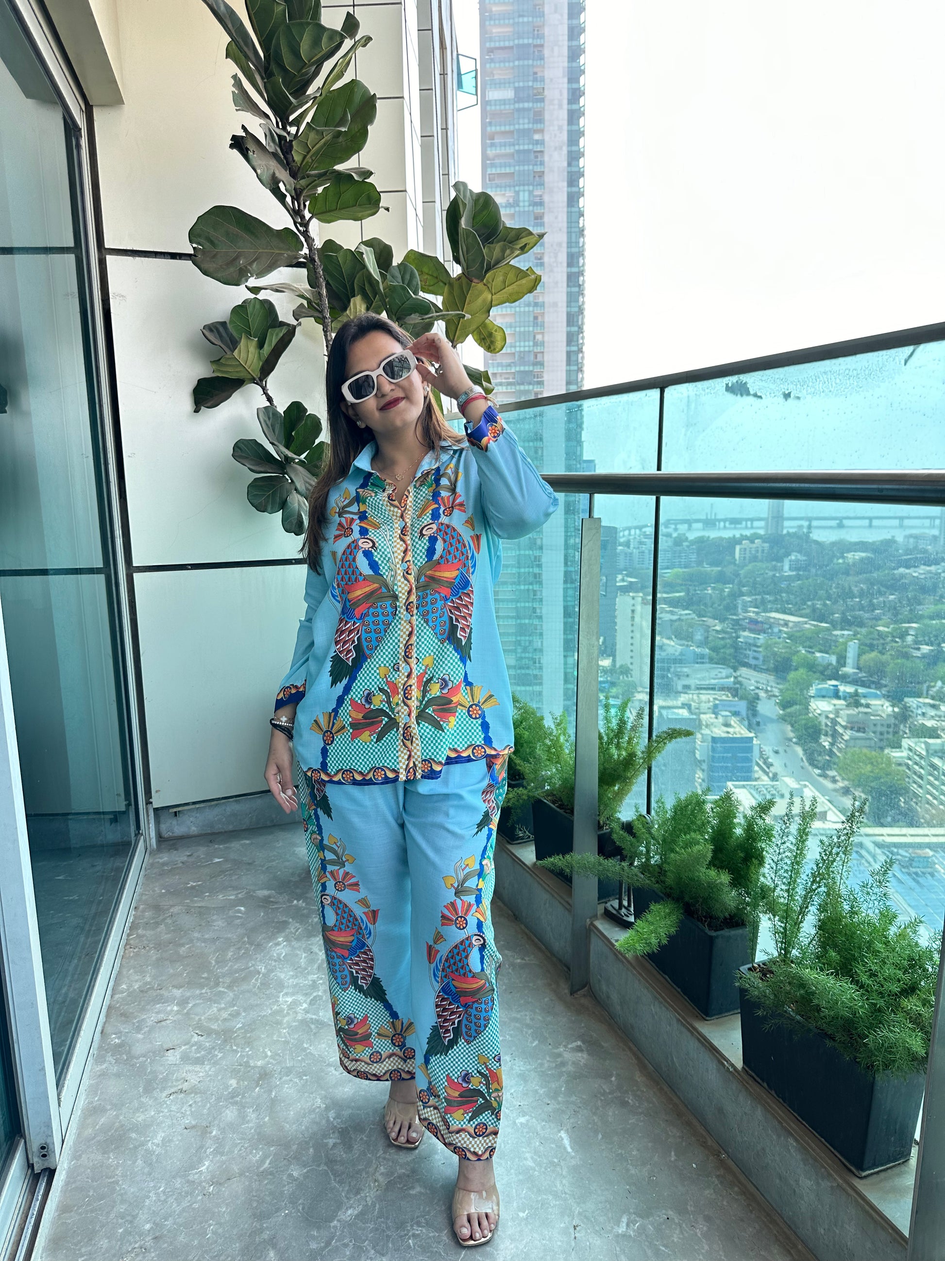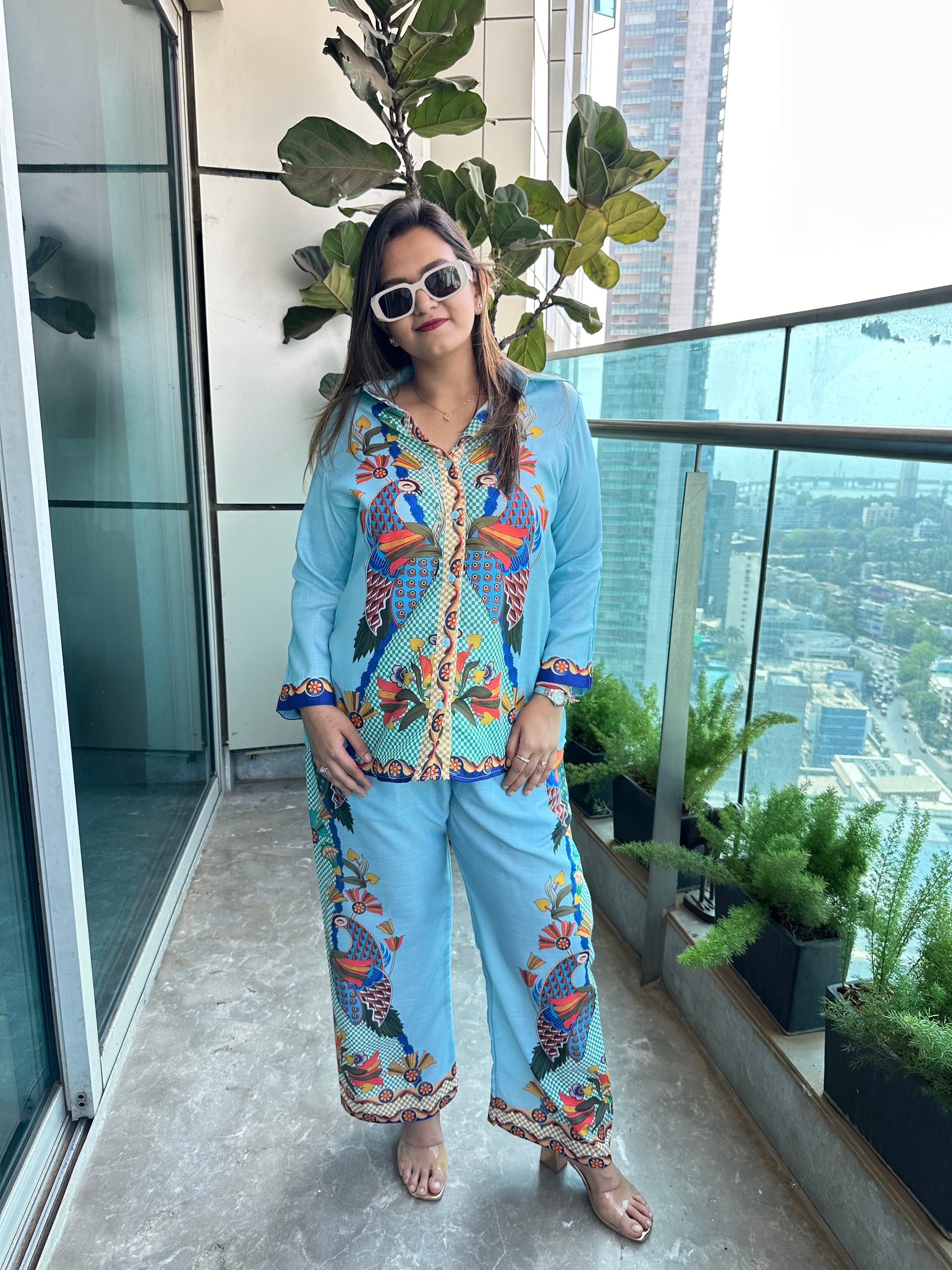 Make a bold statement with the Peacock Paradise Co-ord Set, featuring a striking blue base adorned with vibrant peacock motifs and intricate patterns. The button-down tunic top paired with wide-leg trousers offers a chic yet relaxed silhouette. The intricate detailing along the