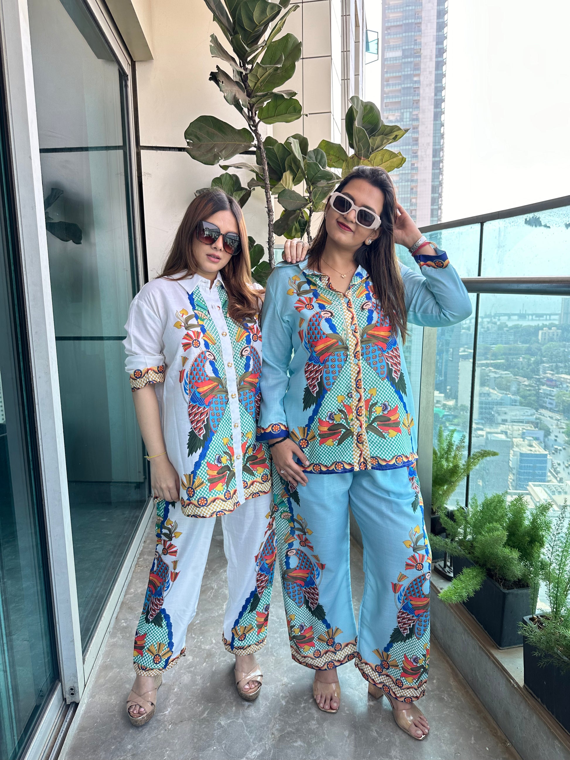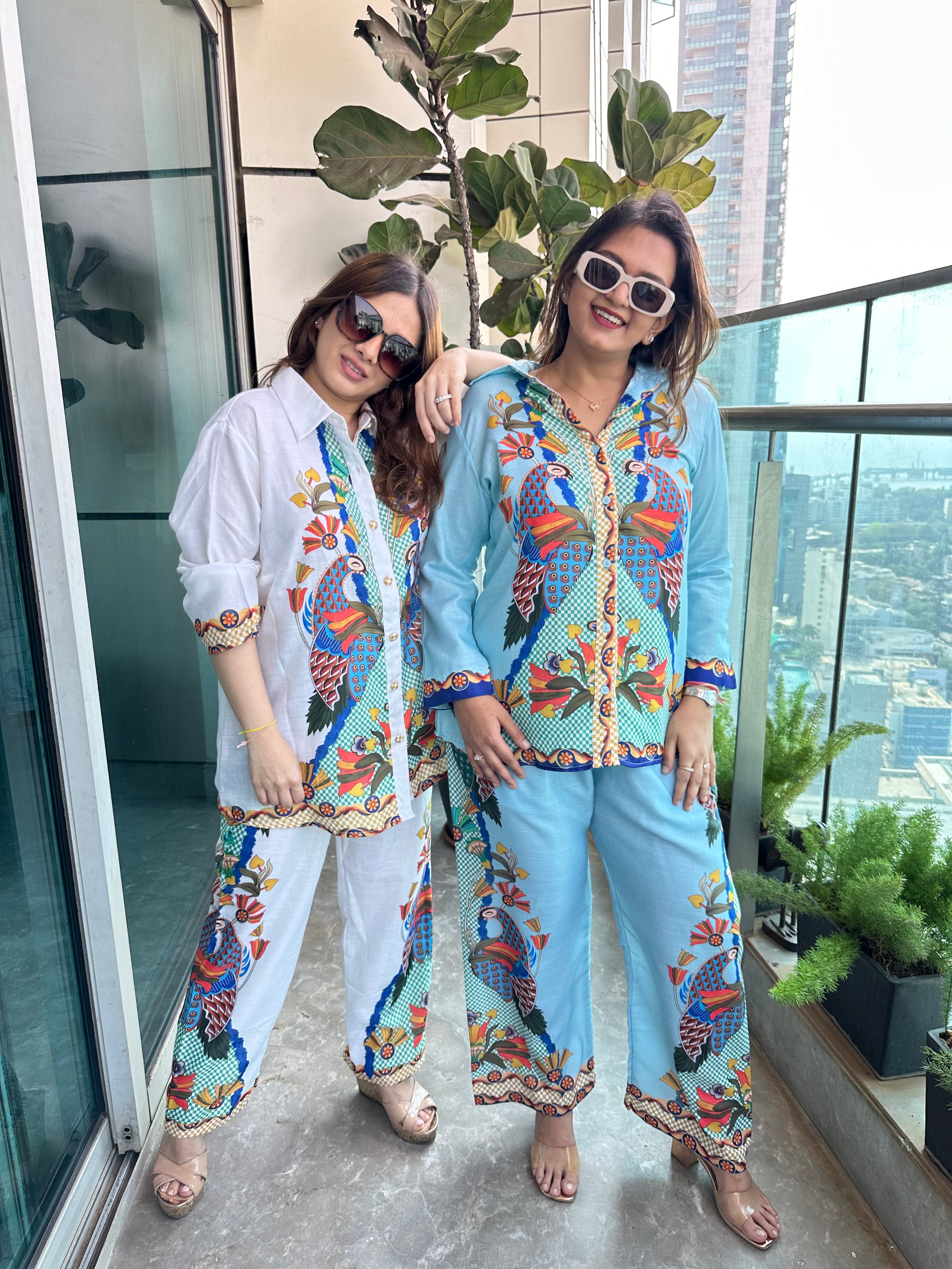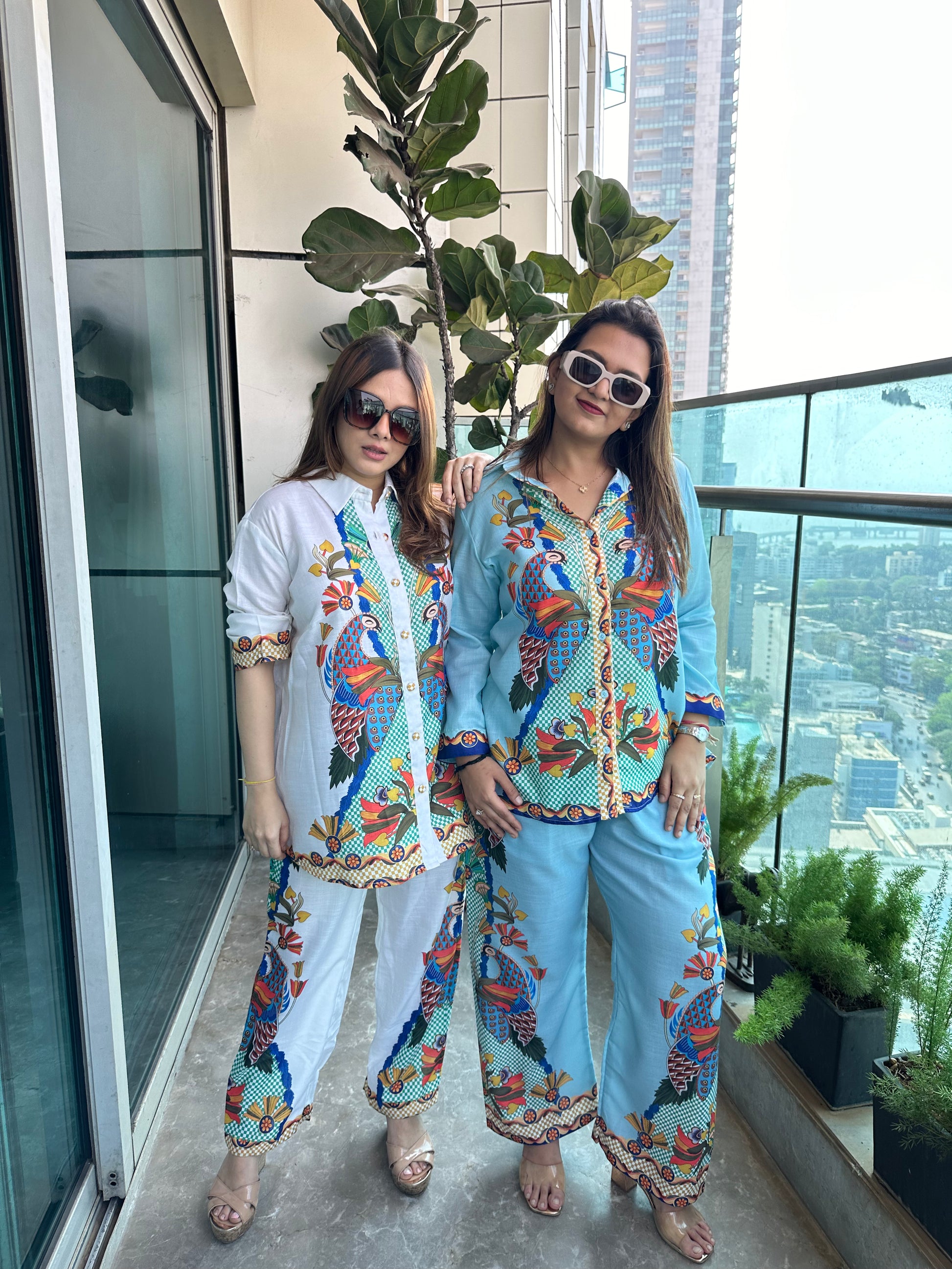 Make a bold statement with the Peacock Paradise Co-ord Set, featuring a striking blue base adorned with vibrant peacock motifs and intricate patterns. The button-down tunic top paired with wide-leg trousers offers a chic yet relaxed silhouette. The intricate detailing along the