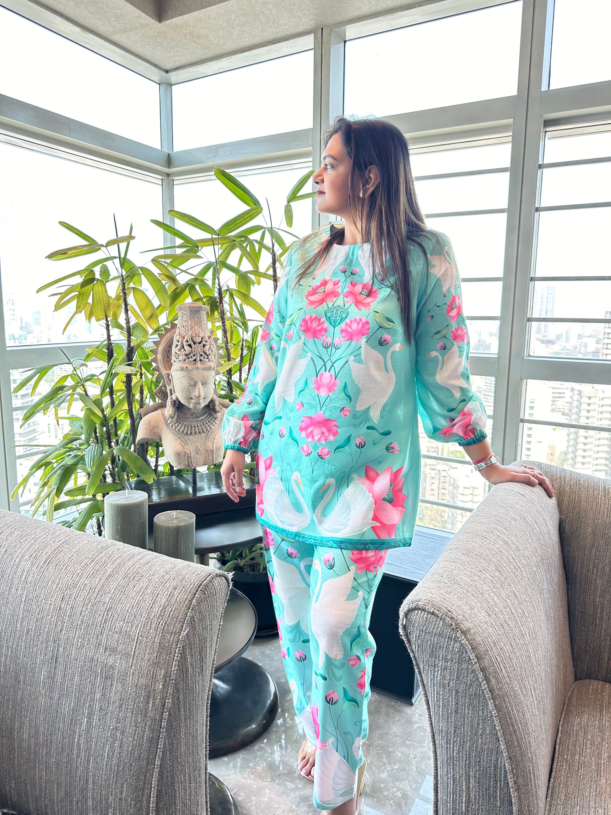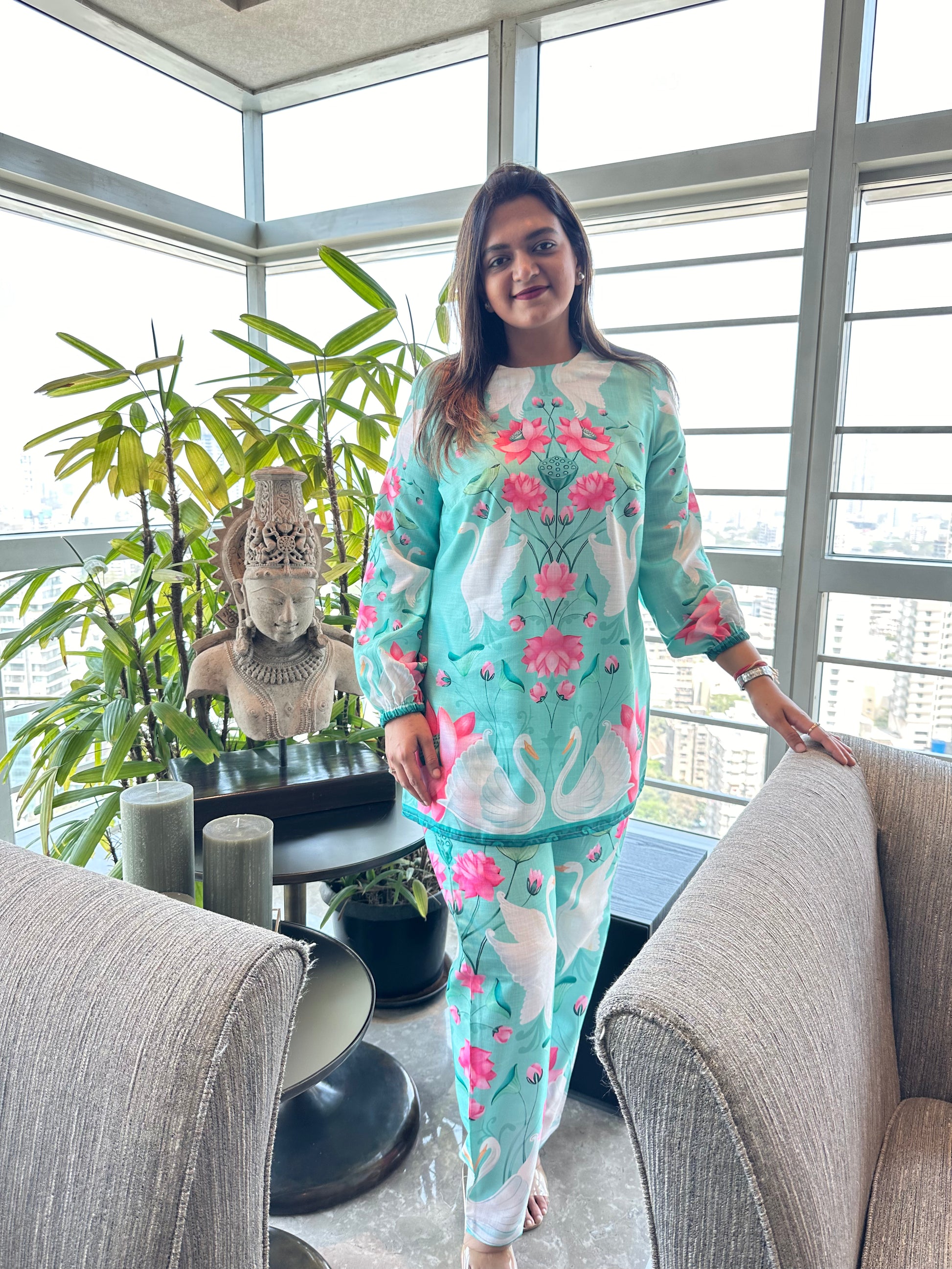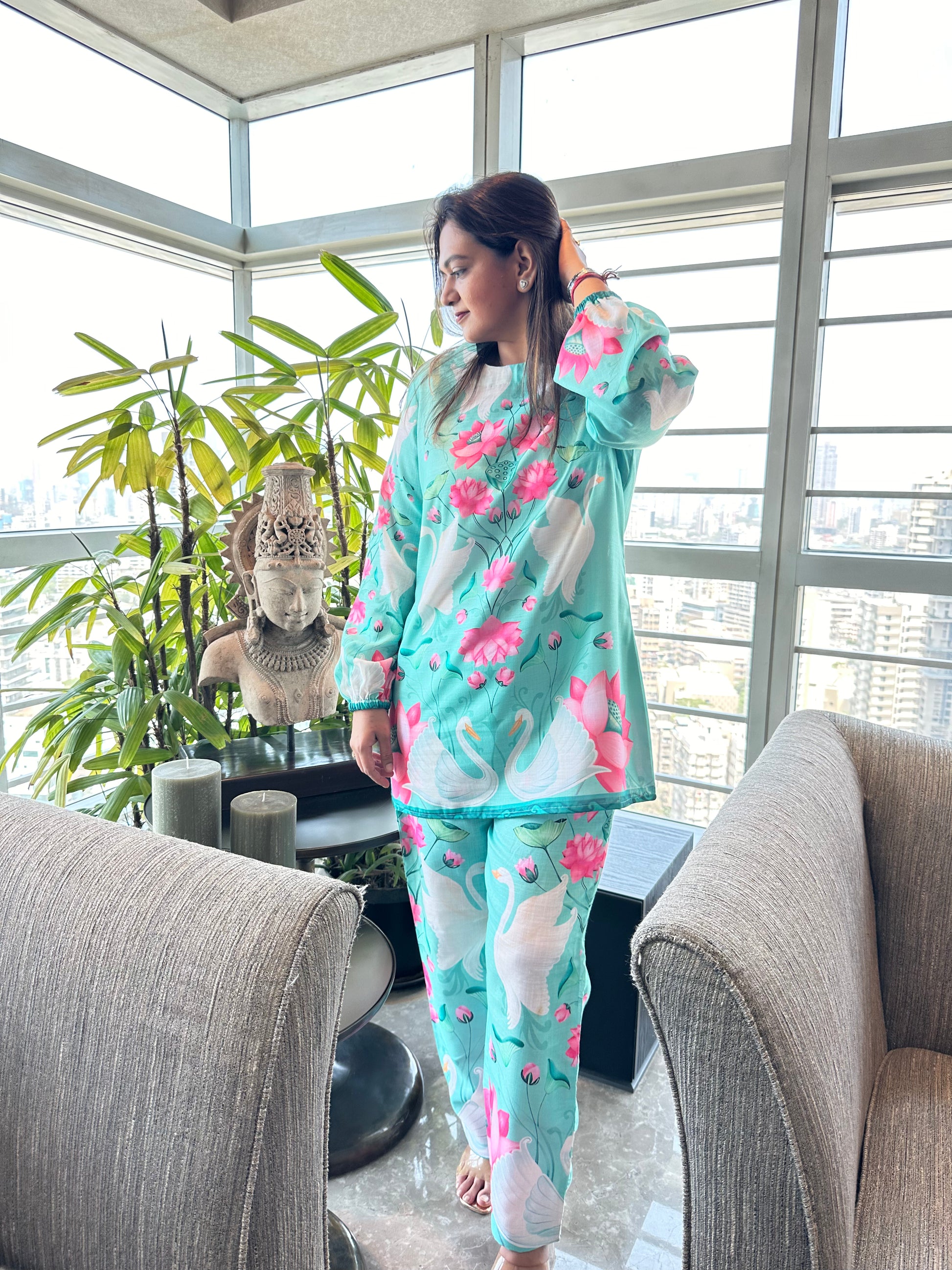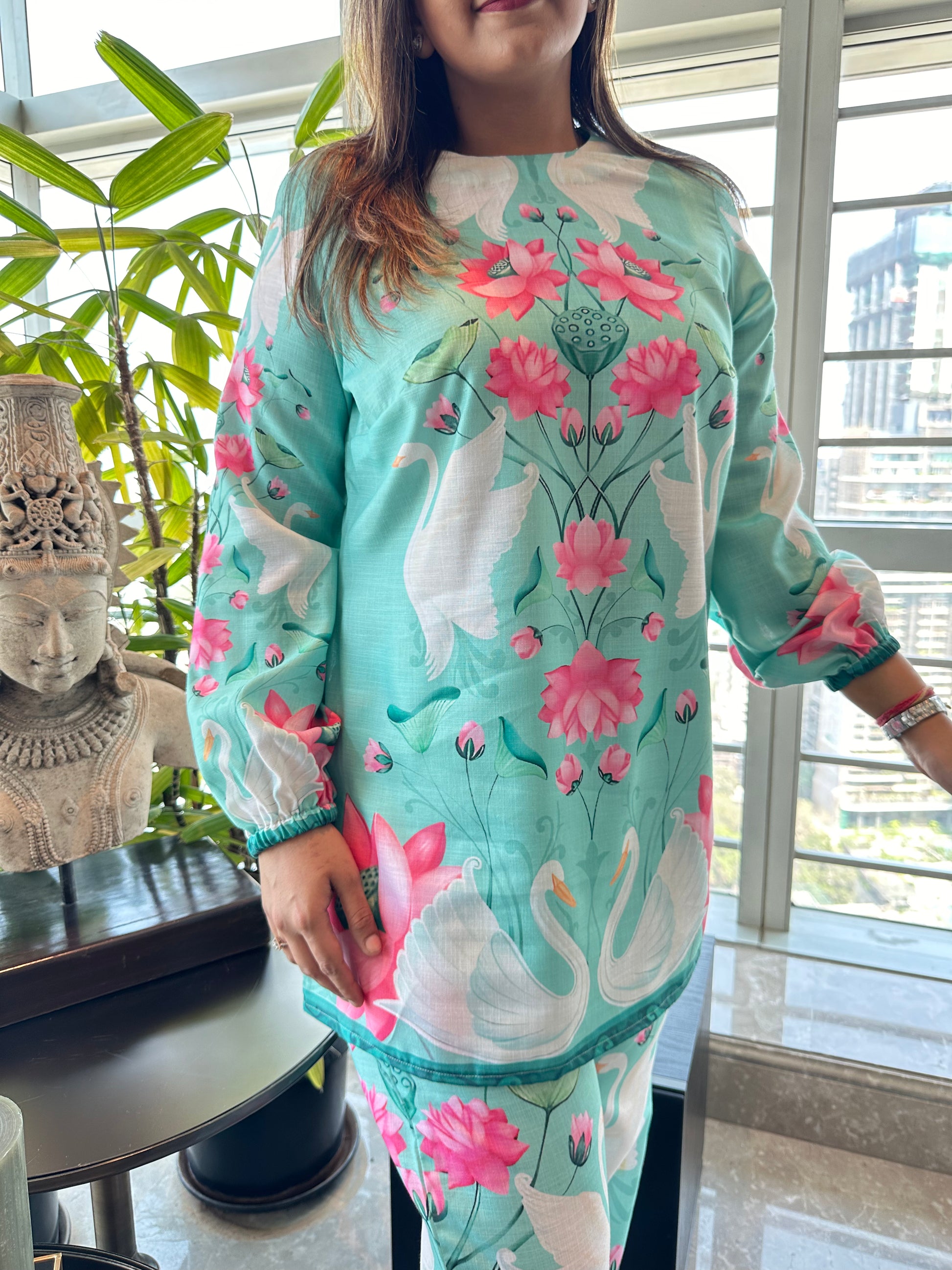 Grace meets elegance in the Swan Serenity Co-ord Set, a beautifully designed two-piece ensemble in a refreshing aqua blue hue. Featuring a relaxed-fit tunic top with a round neckline and full sleeves, paired with straight-leg pants, this set showcases a stunning swan and lotus floral print, exuding a serene and artistic charm. The lightweight fabric and breezy silhouette ensure both comfort and sophistication.