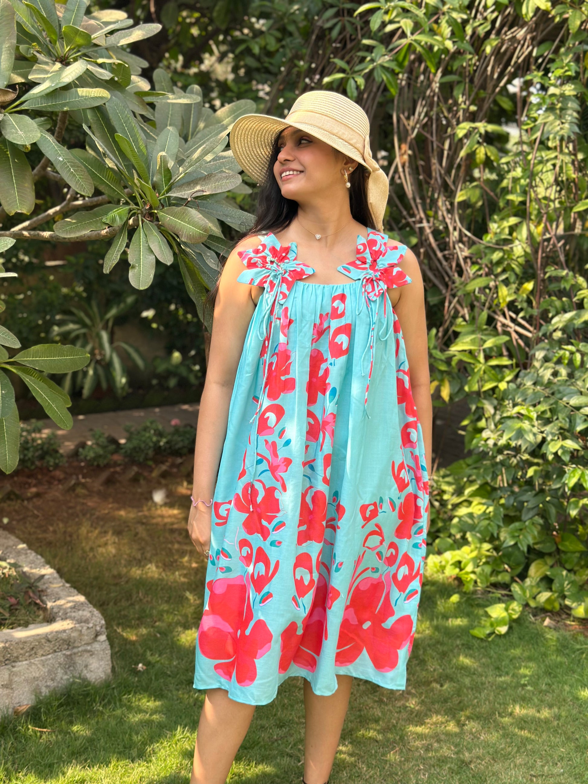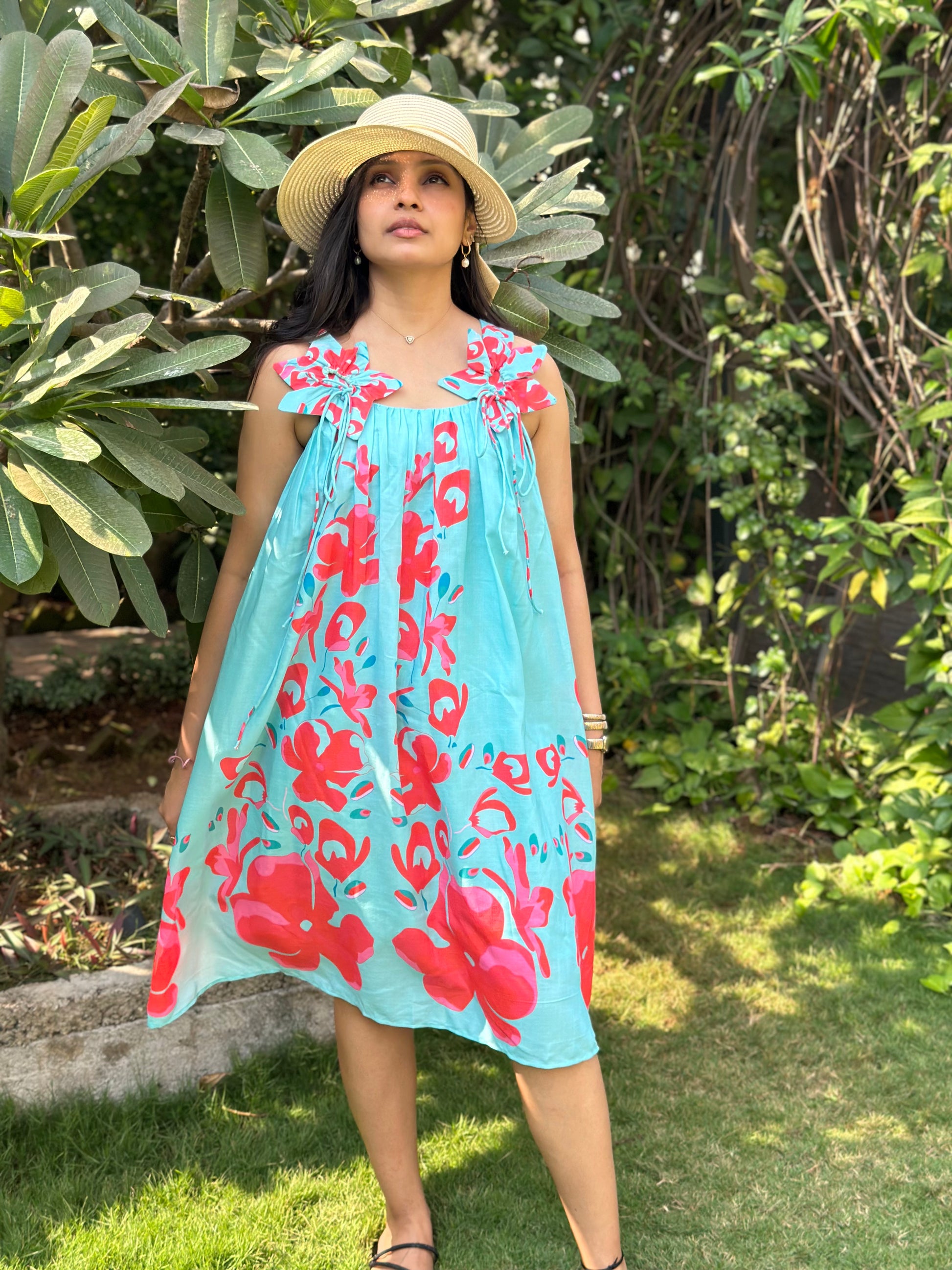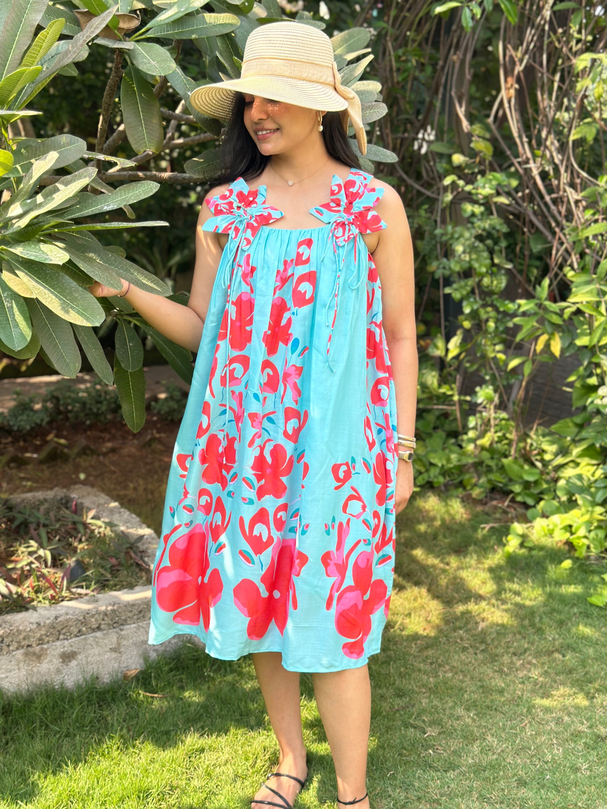 The Tropical Breeze Sundress is a flowy, knee-length dress that embodies effortless summer charm. With its light aqua blue base and bold red floral prints, this dress radiates vibrancy and freshness. The delicate shoulder tie-up details add a playful and feminine touch, making it a breezy and relaxed choice for warm-weather outings. .