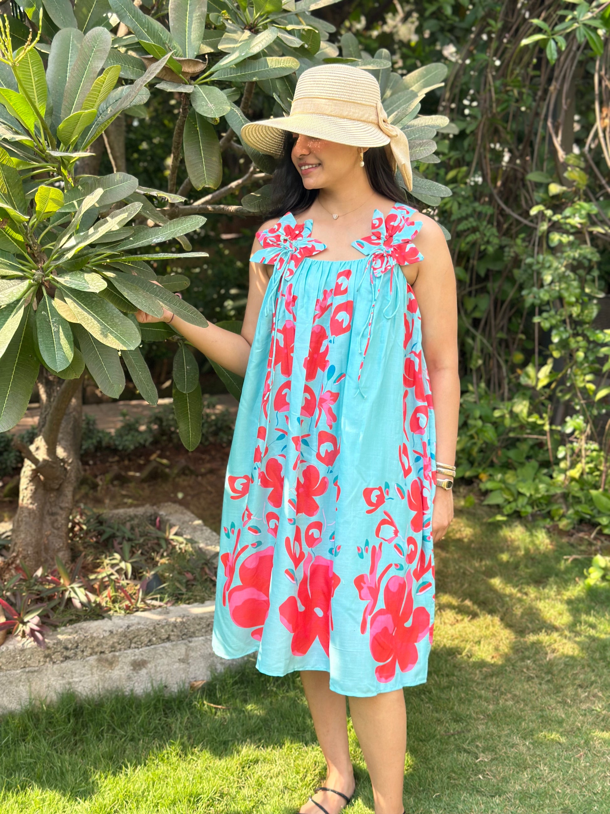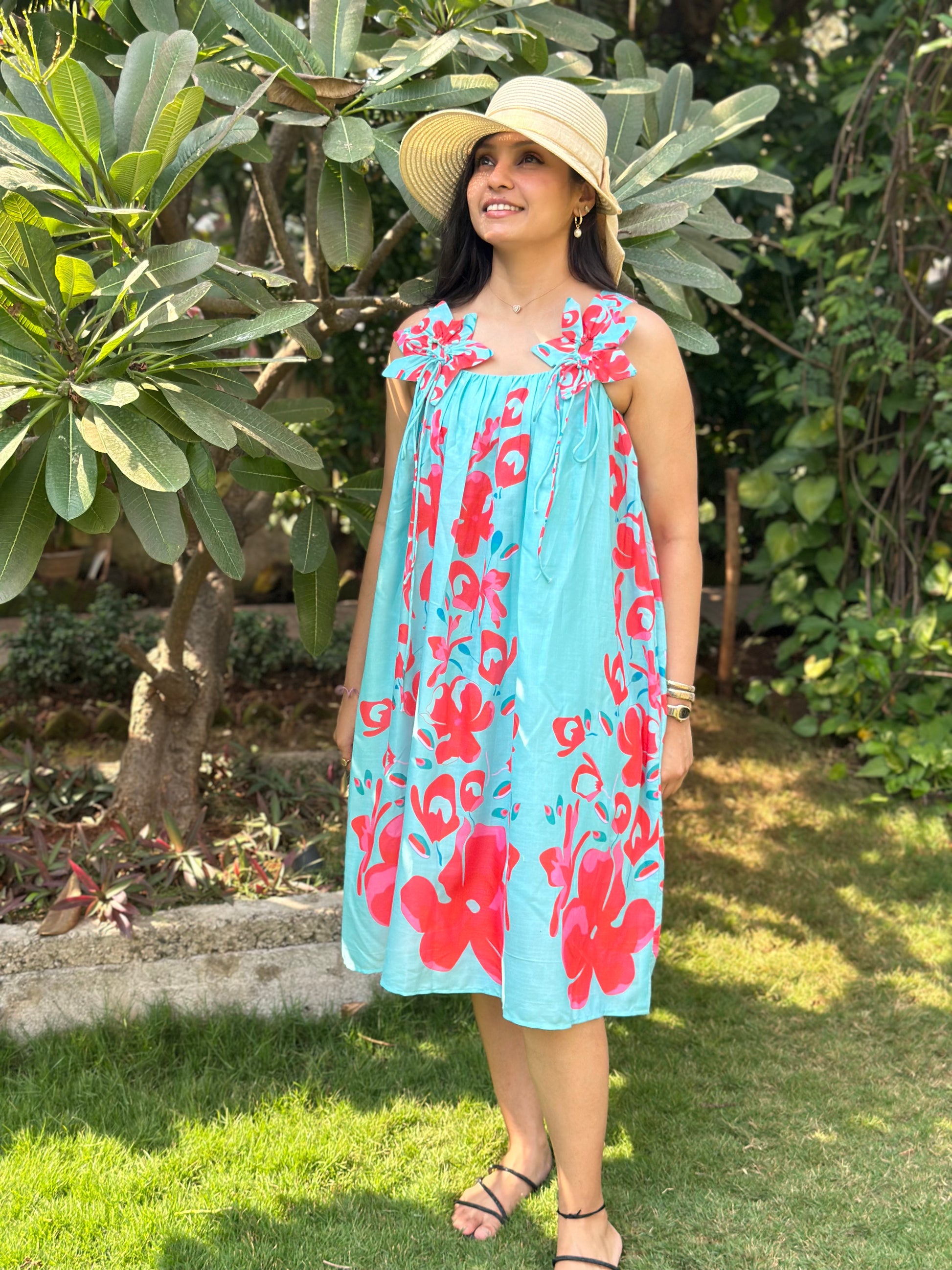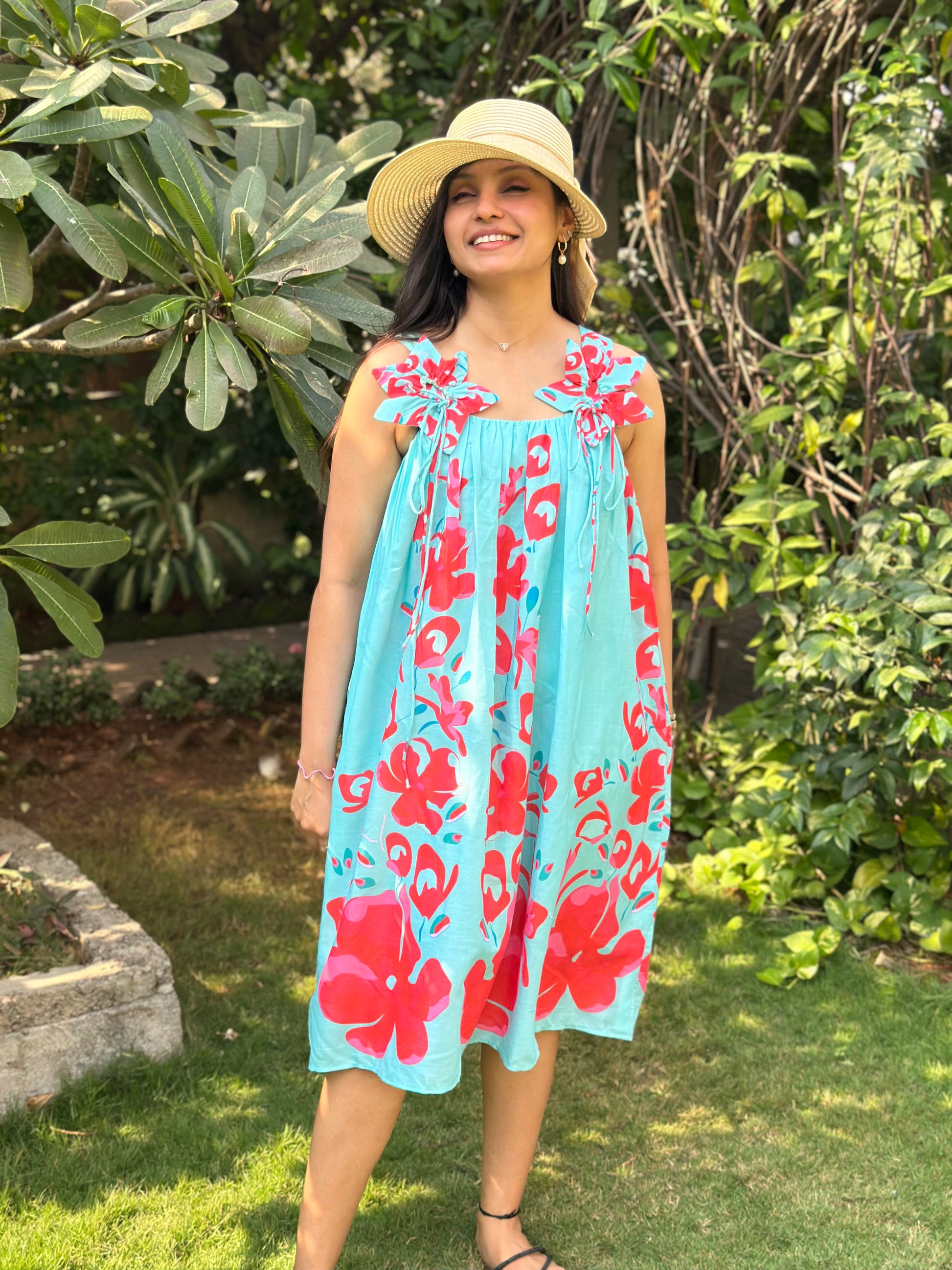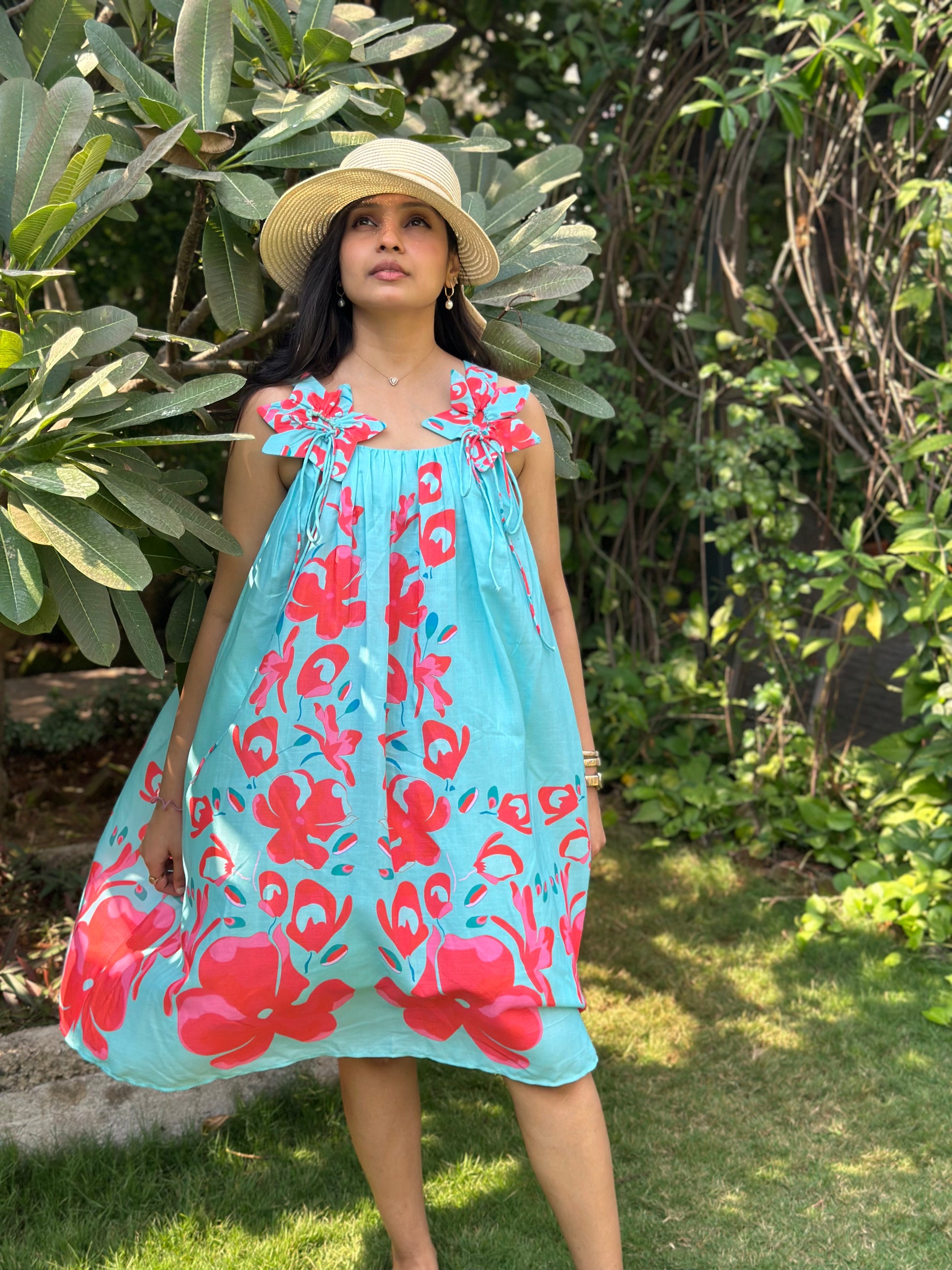 The Tropical Breeze Sundress is a flowy, knee-length dress that embodies effortless summer charm. With its light aqua blue base and bold red floral prints, this dress radiates vibrancy and freshness. The delicate shoulder tie-up details add a playful and feminine touch, making it a breezy and relaxed choice for warm-weather outings. .