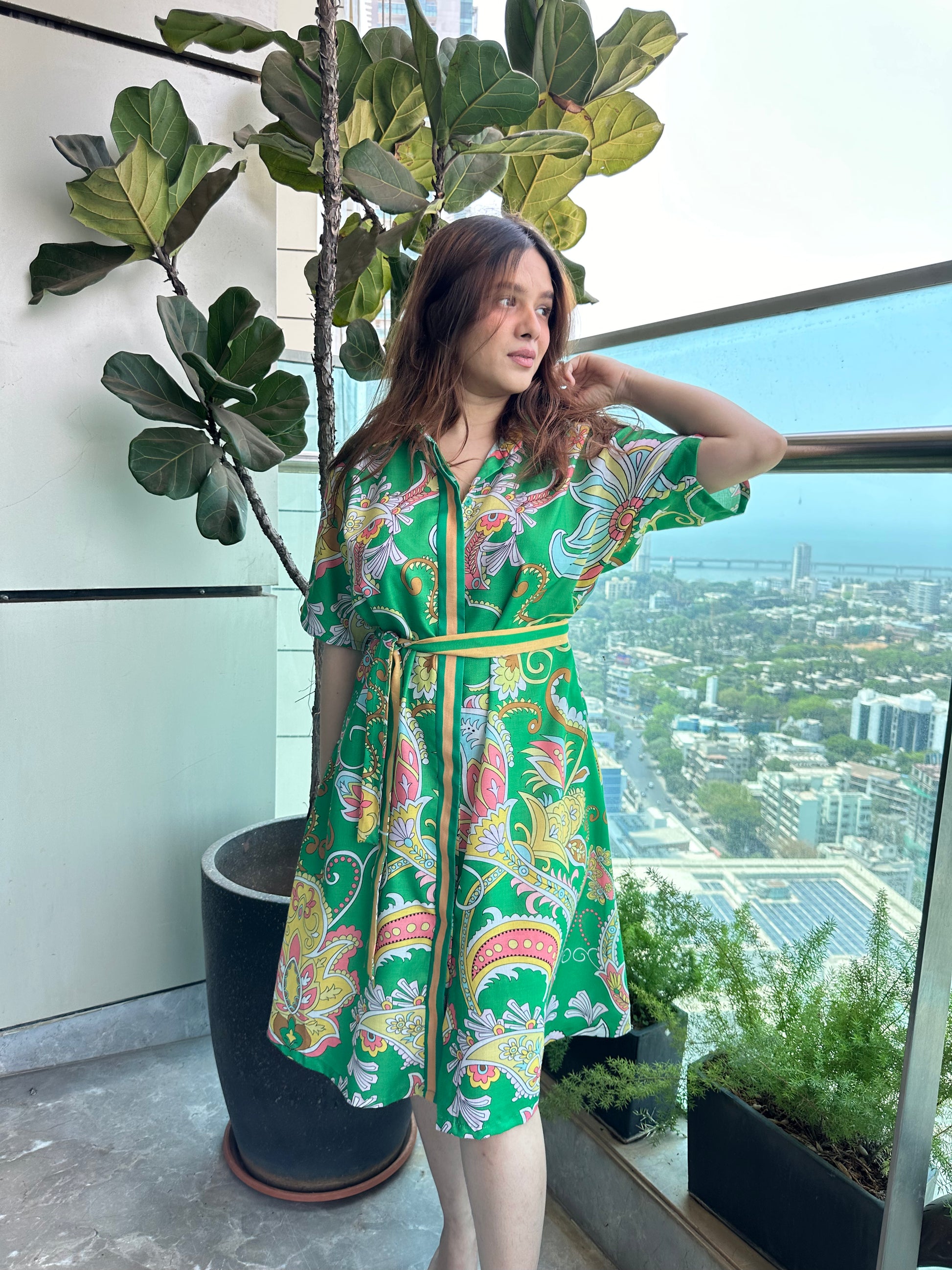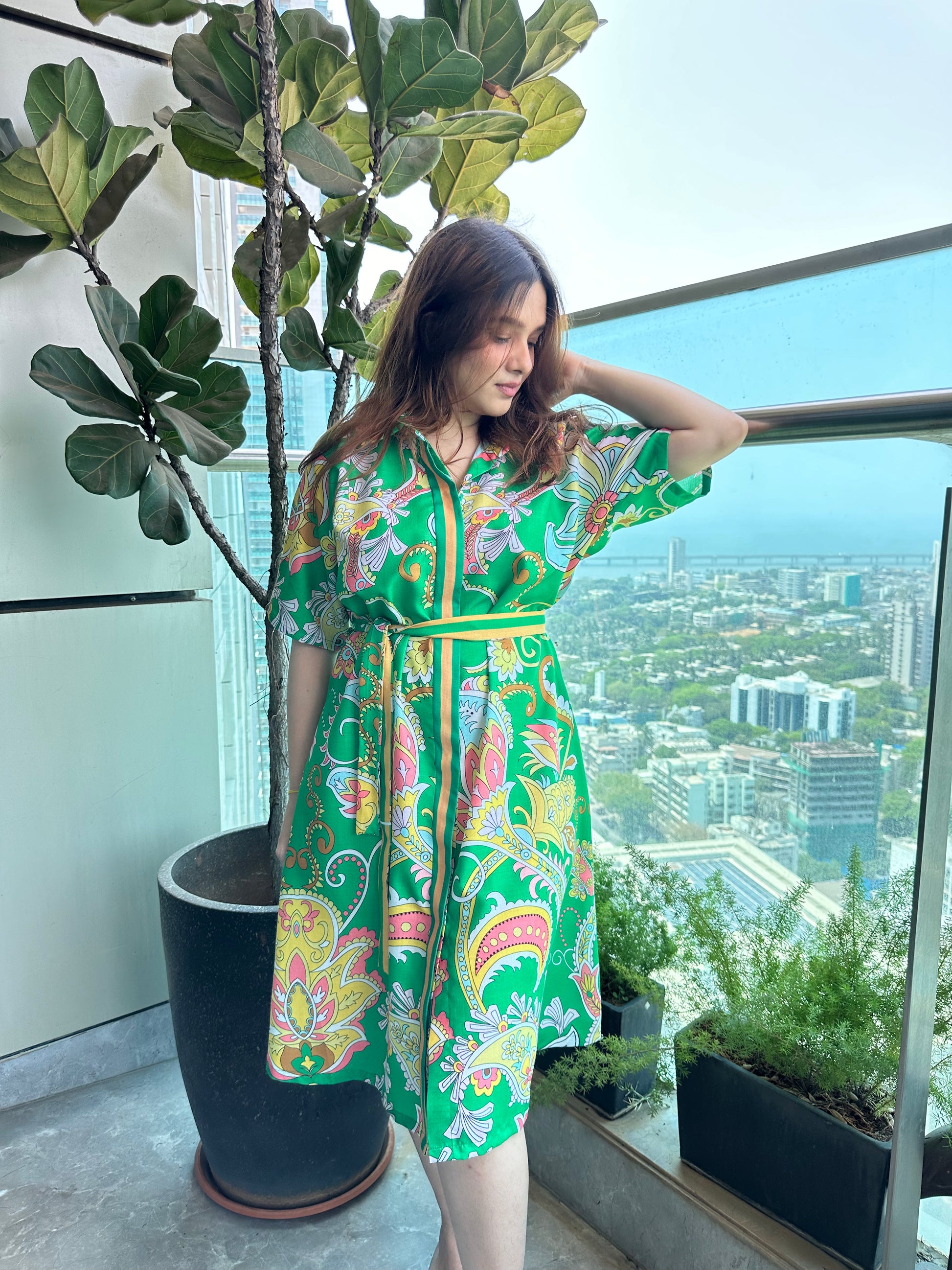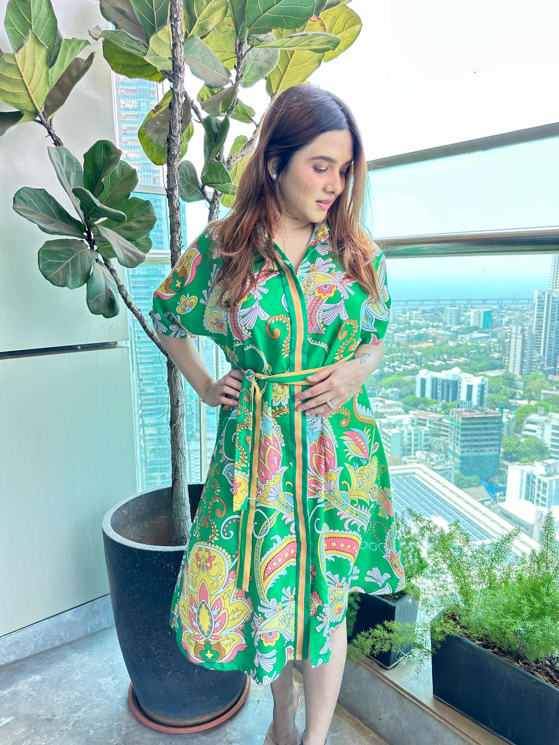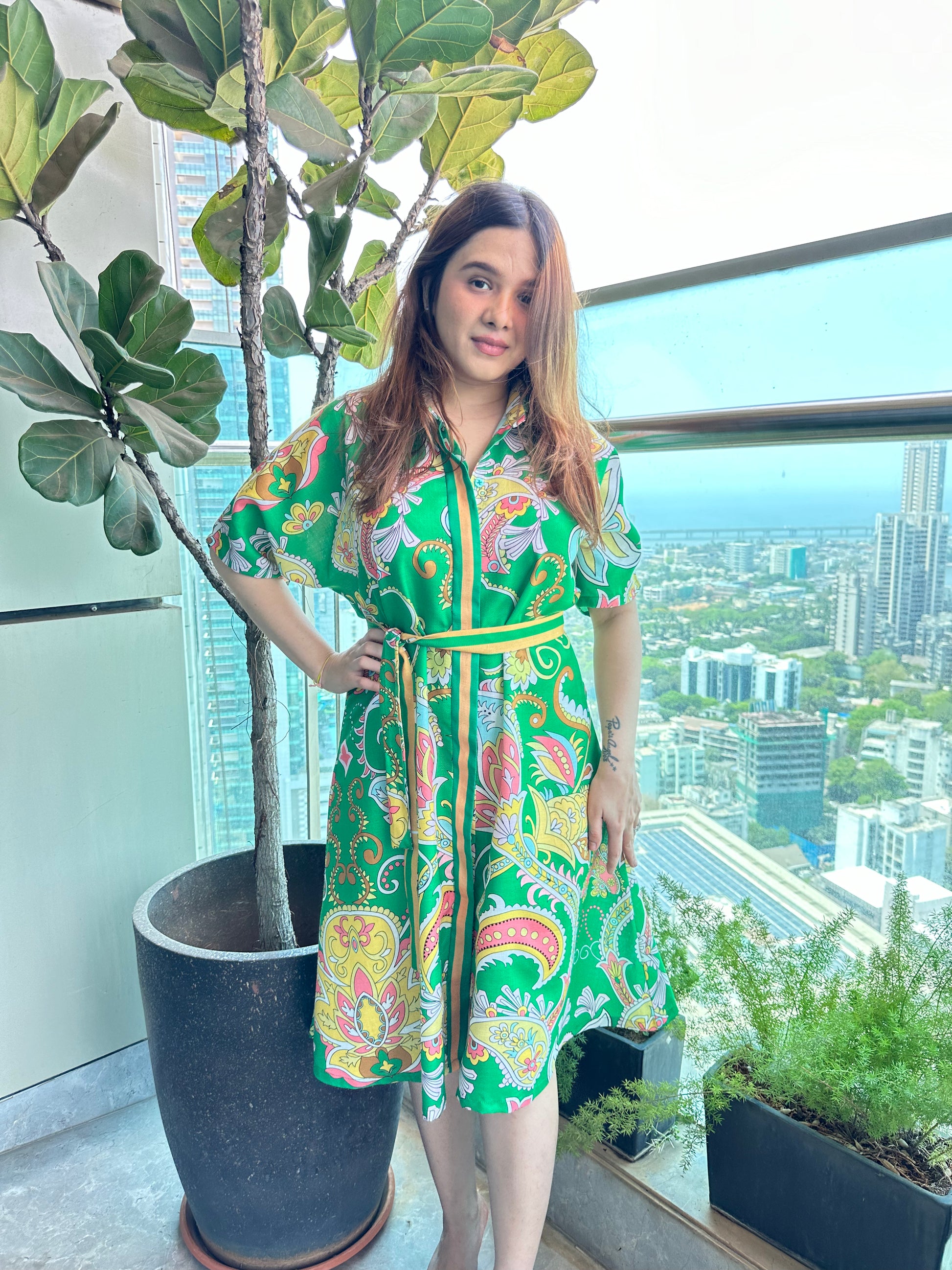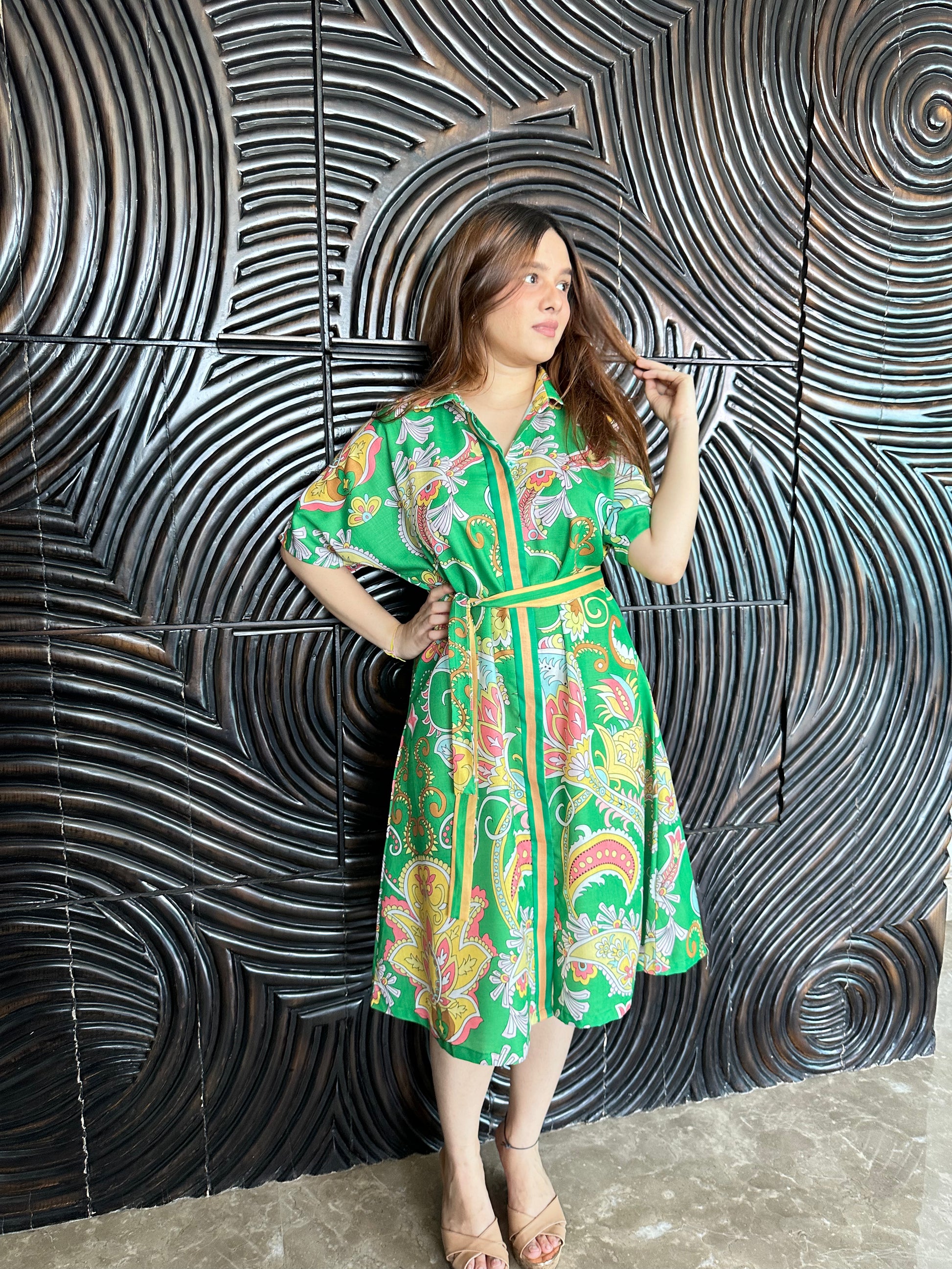 The Tropical Green Paisley Midi Dress is a vibrant and flowy statement piece featuring an eye-catching paisley and floral print in shades of pink, yellow, and white on a lush green base. The dress has a relaxed silhouette with a button-down front, short flutter sleeves, and a matching fabric belt that cinches the waist for a flattering shape. The A-line midi-length skirt adds movement and elegance, making it a versatile and stylish pick.