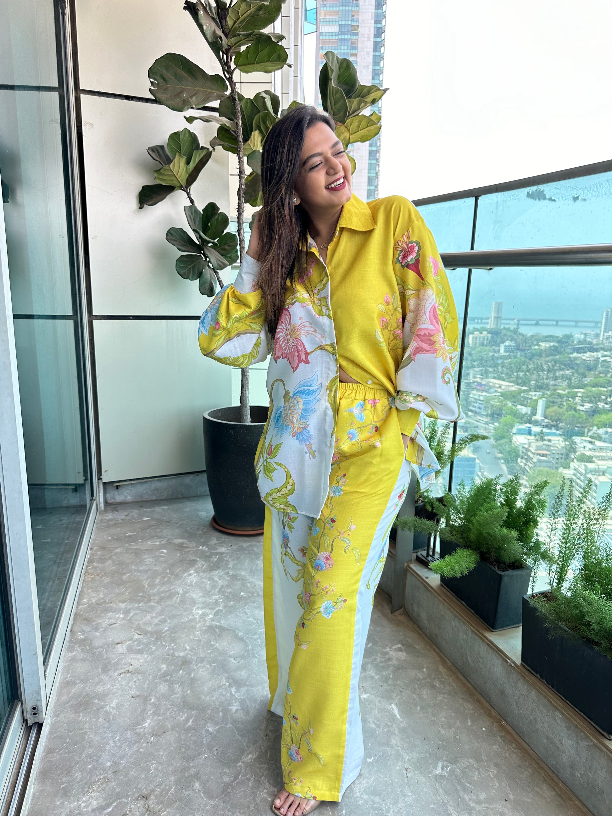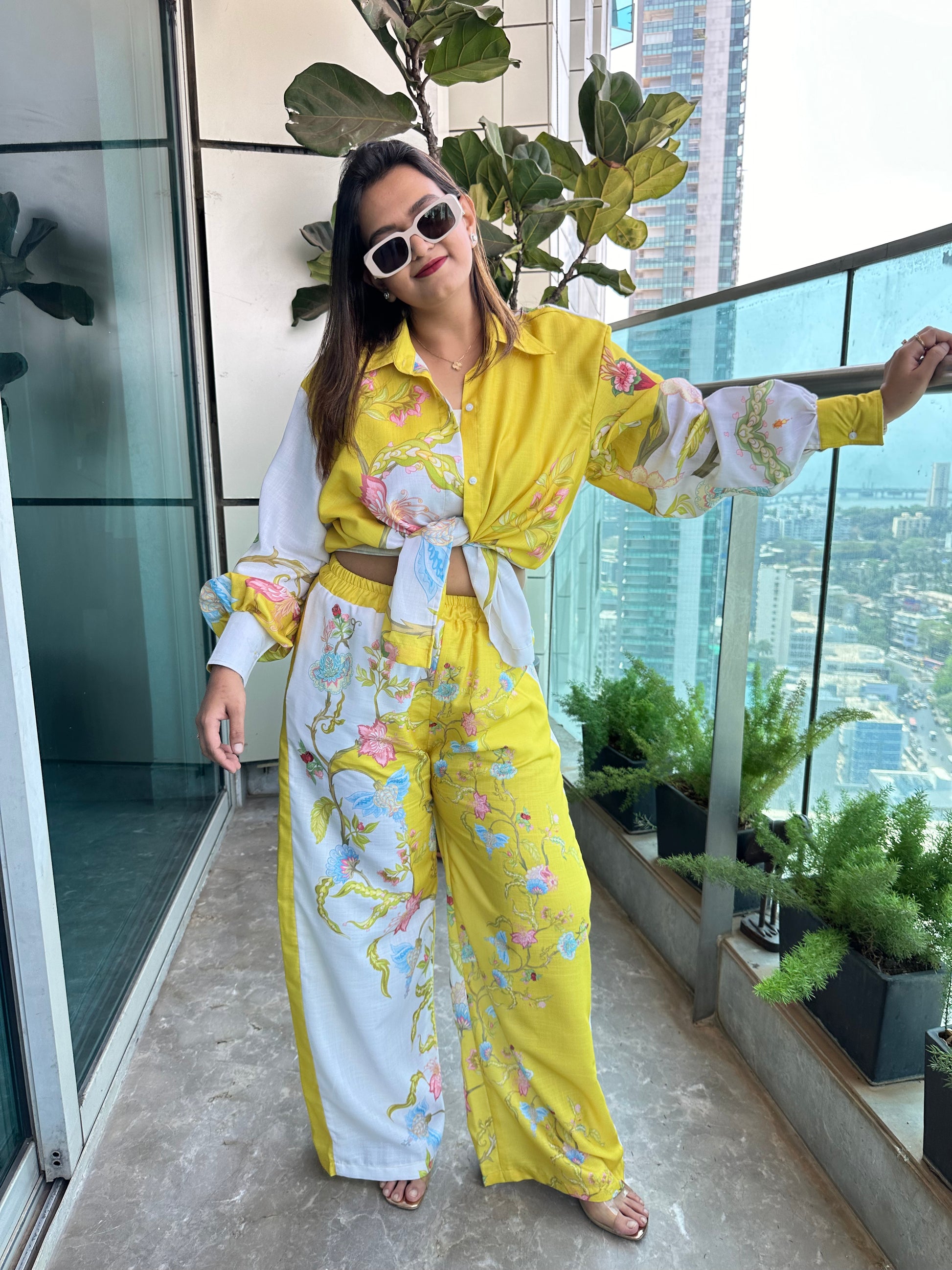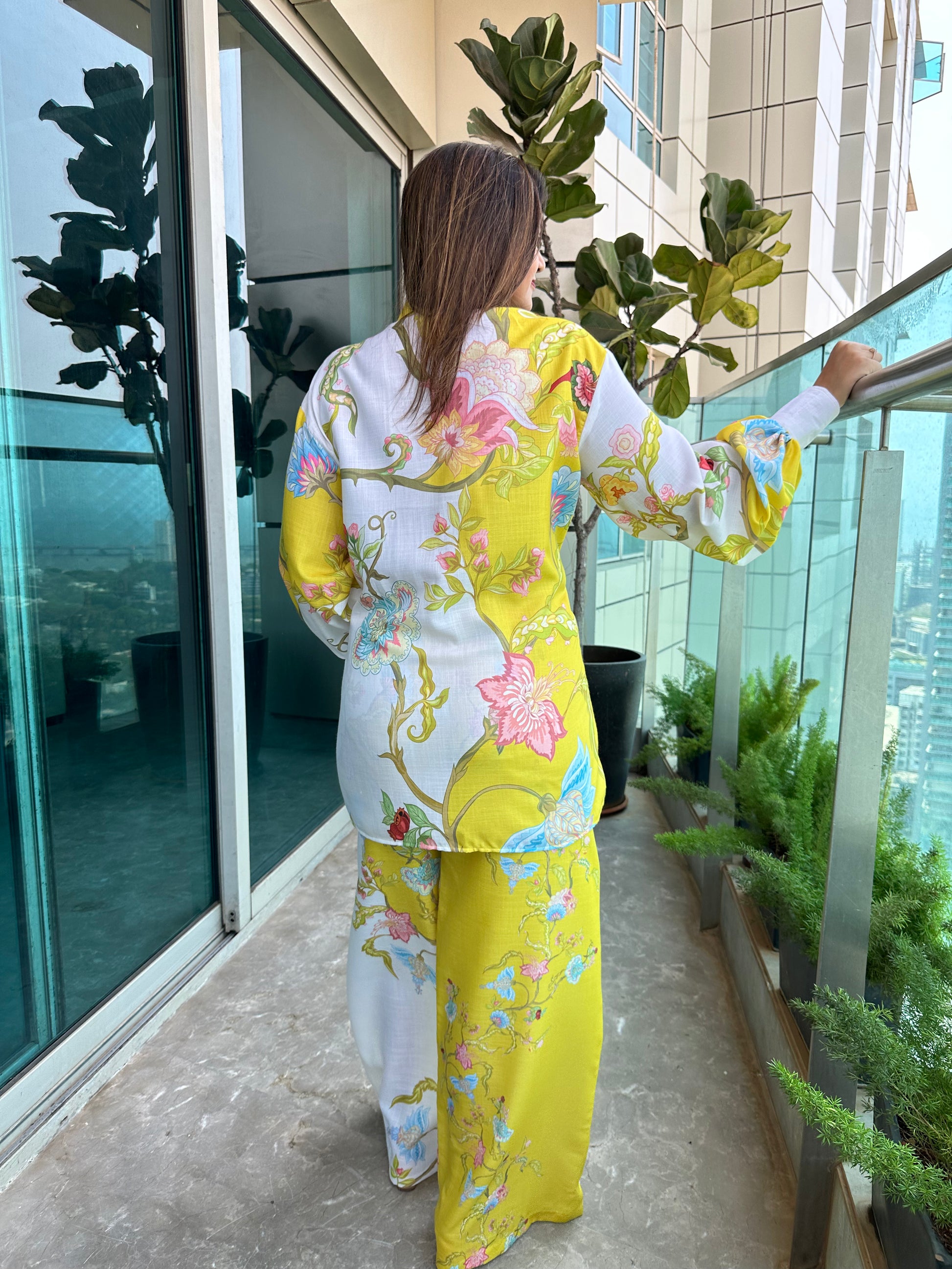 Elevate your style with this effortlessly chic co-ord set, featuring a button down shirt and wide-leg pants in a stunning peach and white floral print. Designed for comfort and elegance, this set boasts a flowy silhouette, long sleeves with cuffs, and a collared neckline for a sophisticated yet relaxed look.
